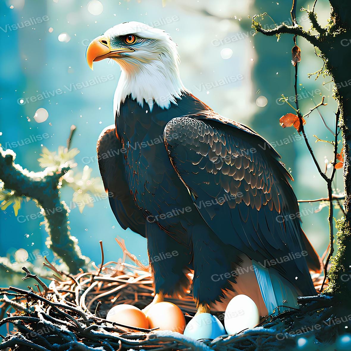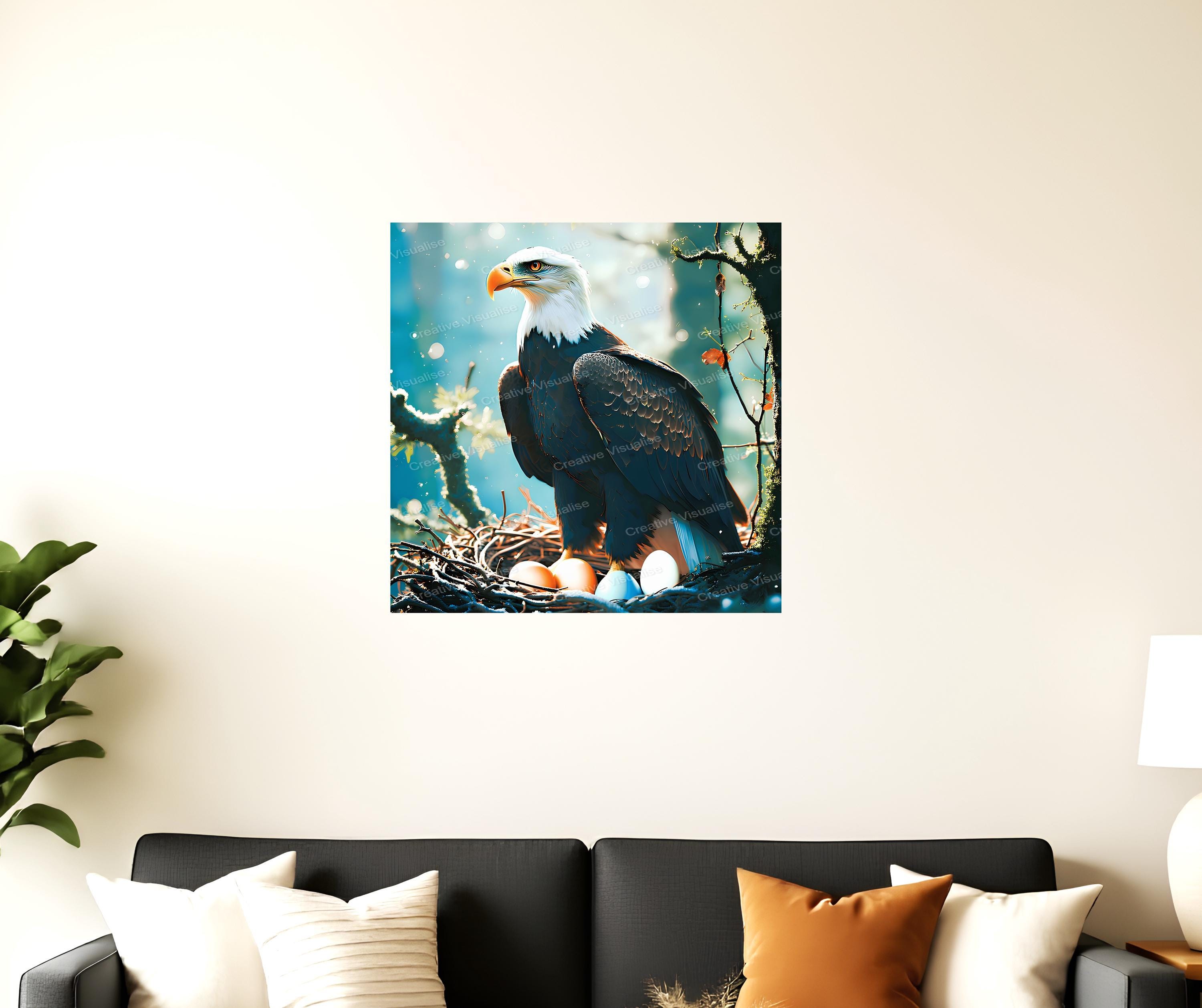 A digital photo of an eagle on a nest that can be easily downloaded and printed. It is large enough for professional posters, canvas prints, and wall decor. The sizes of received digital files: 1. PNG file, 4700×4700 pixels, 300 dpi 2. PDF file, 16×16 inches in 300 dpi