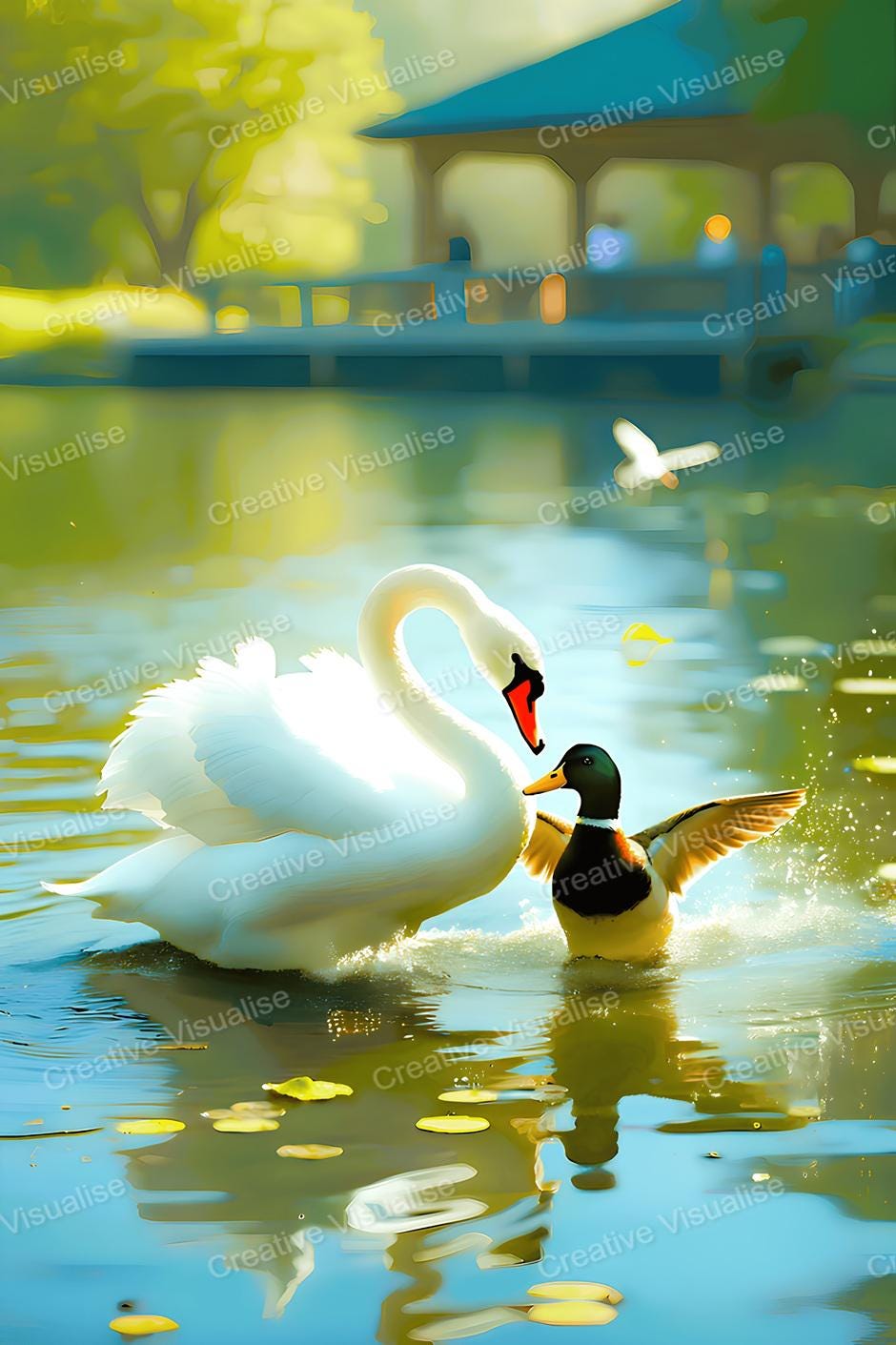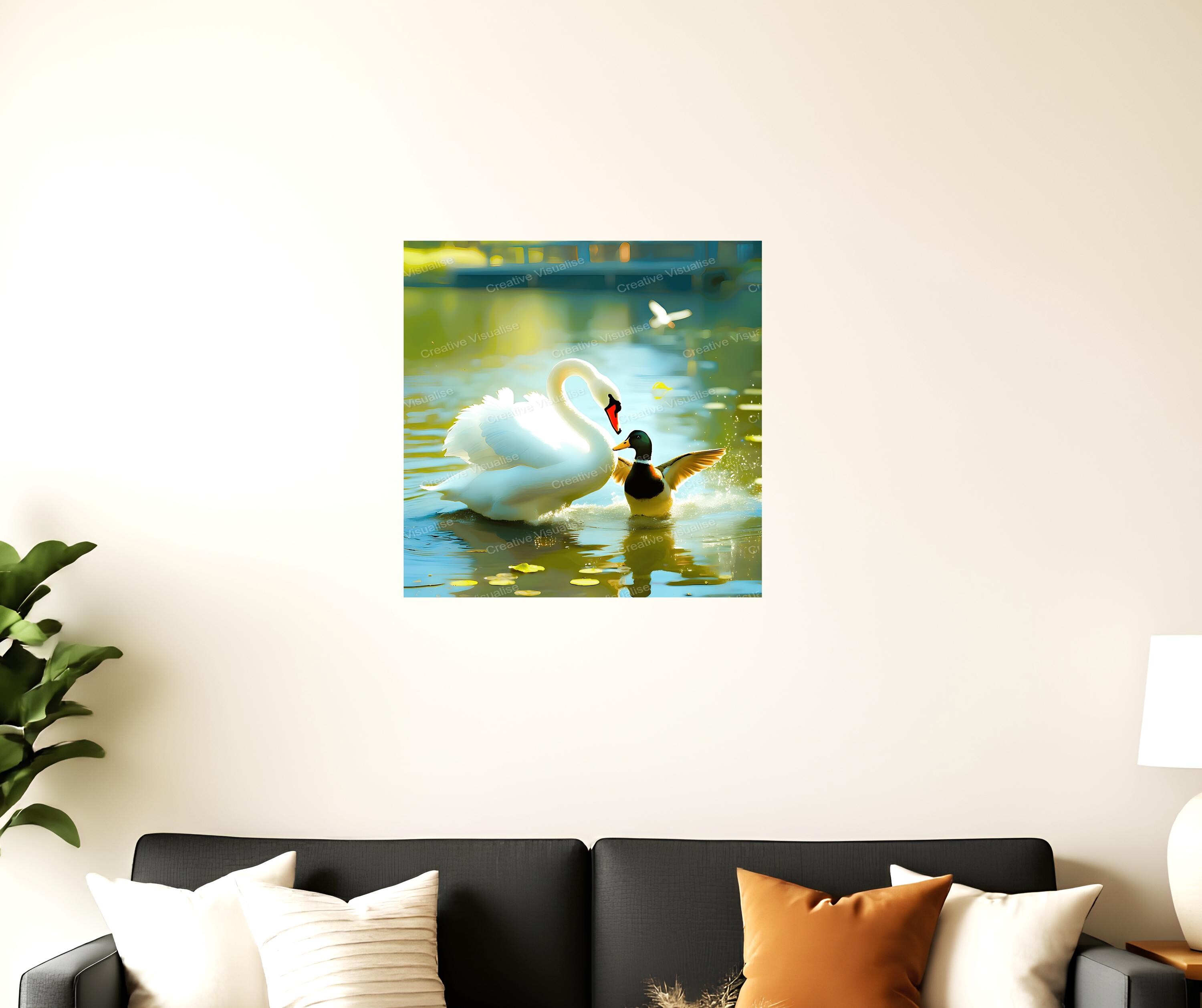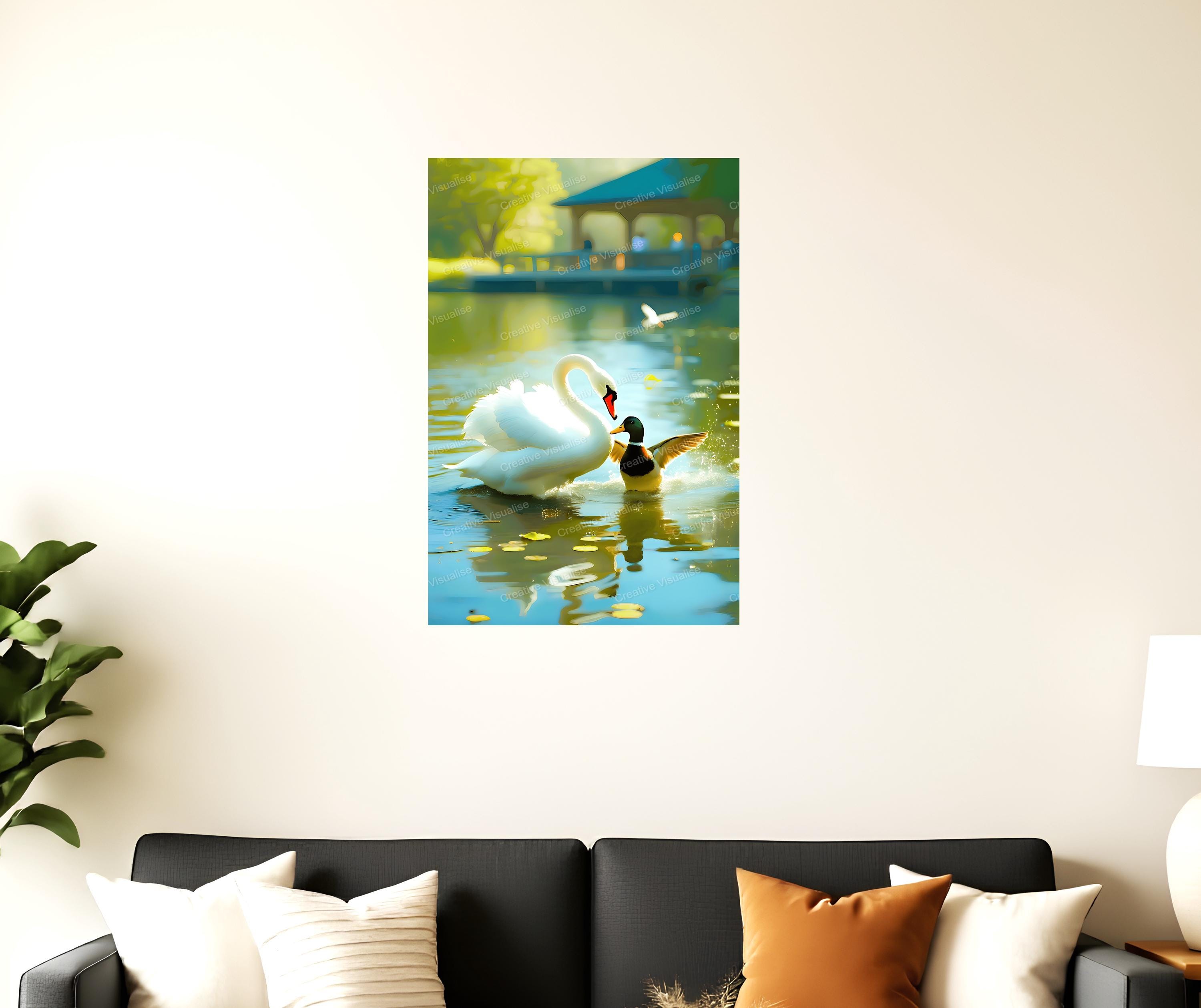 A digital photo of a swan and duck that can be easily downloaded and printed. It is large enough for professional posters, canvas prints, and wall decor. The sizes of received digital files: 1. PNG file, 4700×7000 pixels 2. PDF file, 18×24 inches 3. PDF file, 16×20 inches (8×10 inches) 4. PDF file, A2 (16.5×23.4 inches) "All files are high-resolution 300 DPI professional quality, ensuring crisp and clear prints at every size."