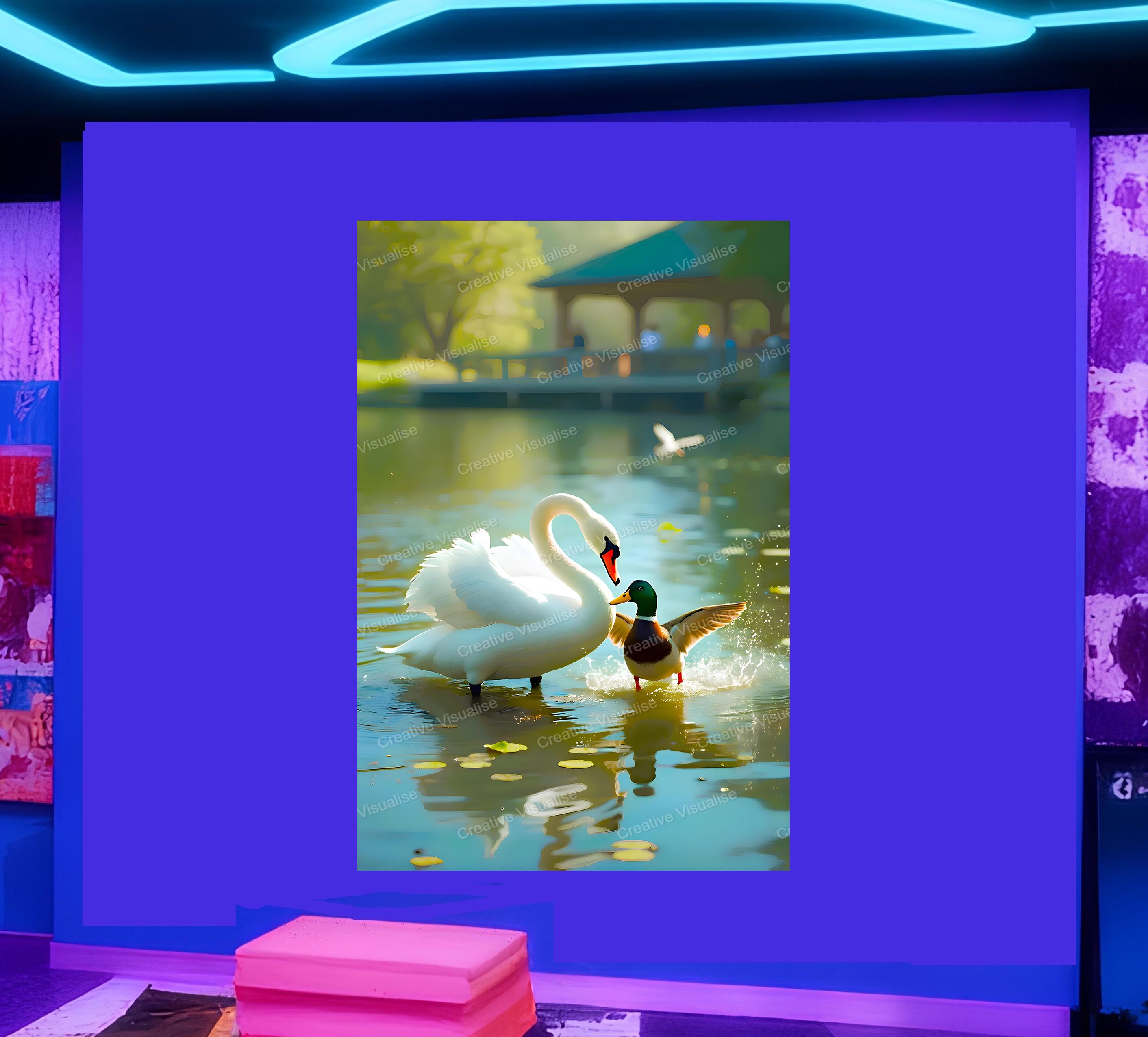 A digital photo of a swan poster and duck wallpaper that can be easily downloaded and printed (not a physical item for delivery). The details of the digitally received image are about 11000 × 16000 pixels, 300 DPI, JPEG and PDF formats, AI artwork, very high resolution without a watermark, and large enough for professional posters, canvas prints, and wall decor. Please send me a message if you need another file format after the original files' delivery. This price is for personal use! For commercial use, please send me a message.