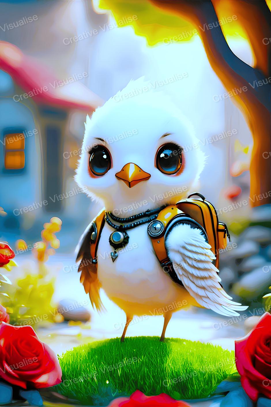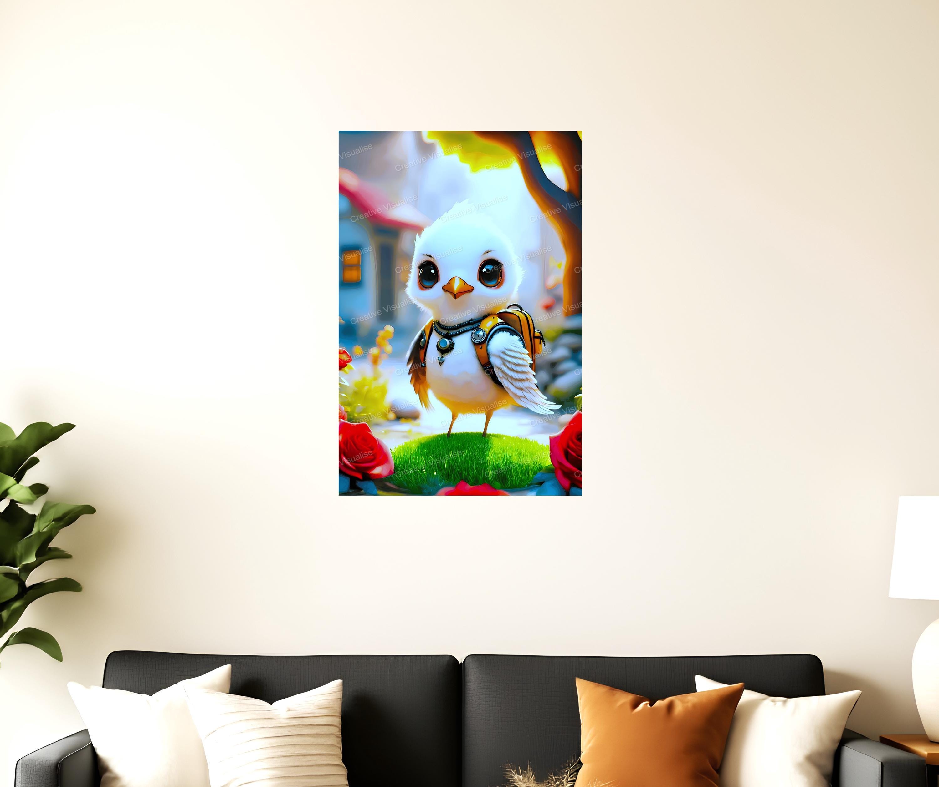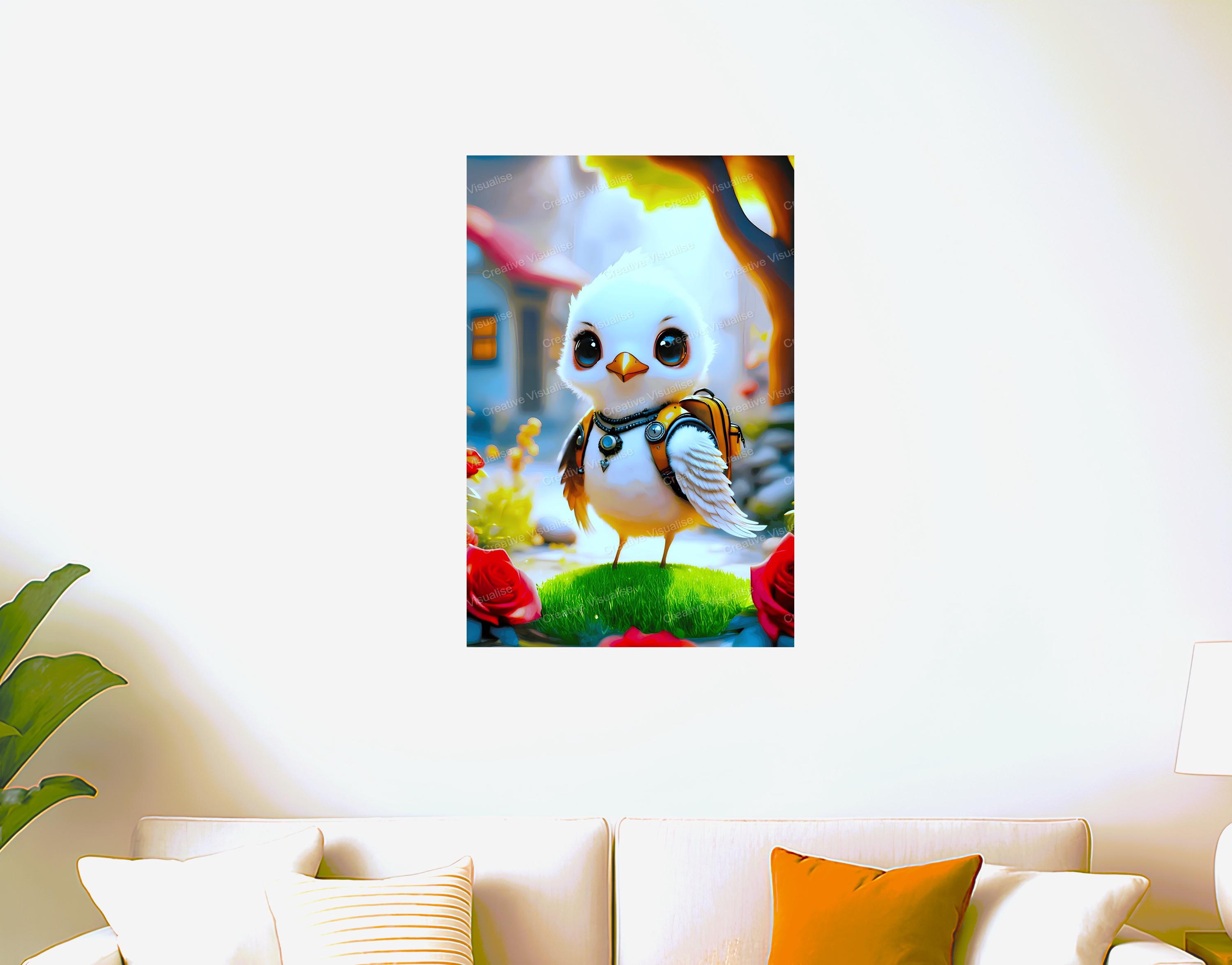 A digital photo of a chick with backpack wallpaper that can be easily downloaded. It is large enough for professional posters, canvas prints, and wall décor. The sizes of received digital files: 1. PNG file, 4700×7000 pixels 2. PDF file, 18×24 inches 3. PDF file, 16×20 inches (8×10 inches) 4. PDF file, A2 (16.5×23.4 inches) 5. PDF file, 16×16 inches "All files are high-resolution 300 DPI professional quality, ensuring crisp and clear prints at every size."
