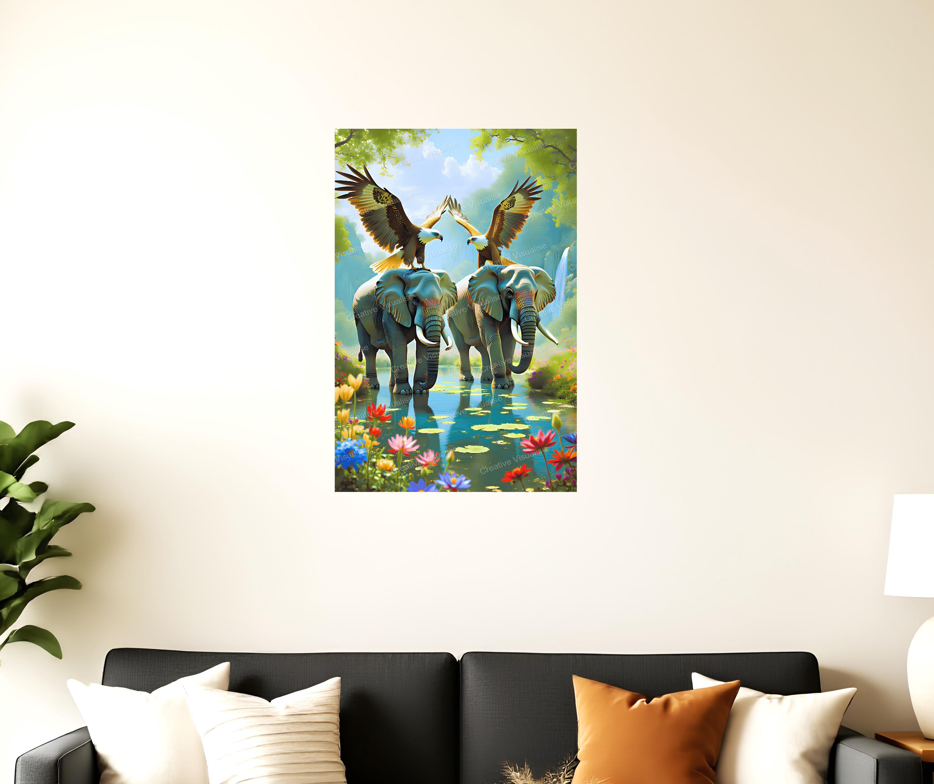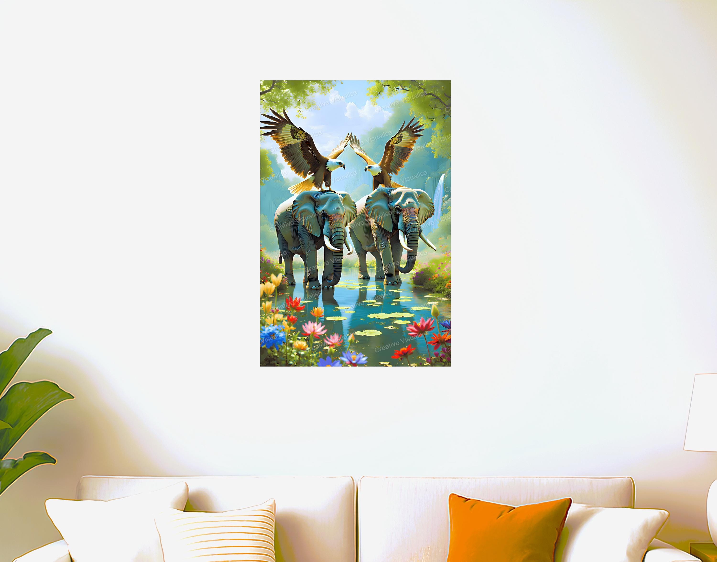 An elephant and bald eagle digital photo that can be easily downloaded and printed. It is large enough for professional posters, canvas prints, and wall decor. The sizes of received digital files: 1. PNG file, 4700×7000 pixels 2. PDF file, 18×24 inches 3. PDF file, 16×20 inches (8×10 inches) 4. PDF file, A2 (16.5×23.4 inches) "All files are high-resolution 300 DPI professional quality, ensuring crisp and clear prints at every size."