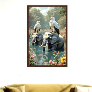 An elephant wallpaper and bald eagle canvas digital photo that can be easily downloaded and printed (not a physical item for delivery). The details of the digitally received image are about 11000 × 16000 pixels, 300 DPI, JPEG and PDF formats, AI artwork, very high resolution without a watermark, and large enough for professional posters, canvas prints, and wall decor. Please send me a message if you need another file format after the original files' delivery. This price is for personal use! For commercial use, please send me a message.