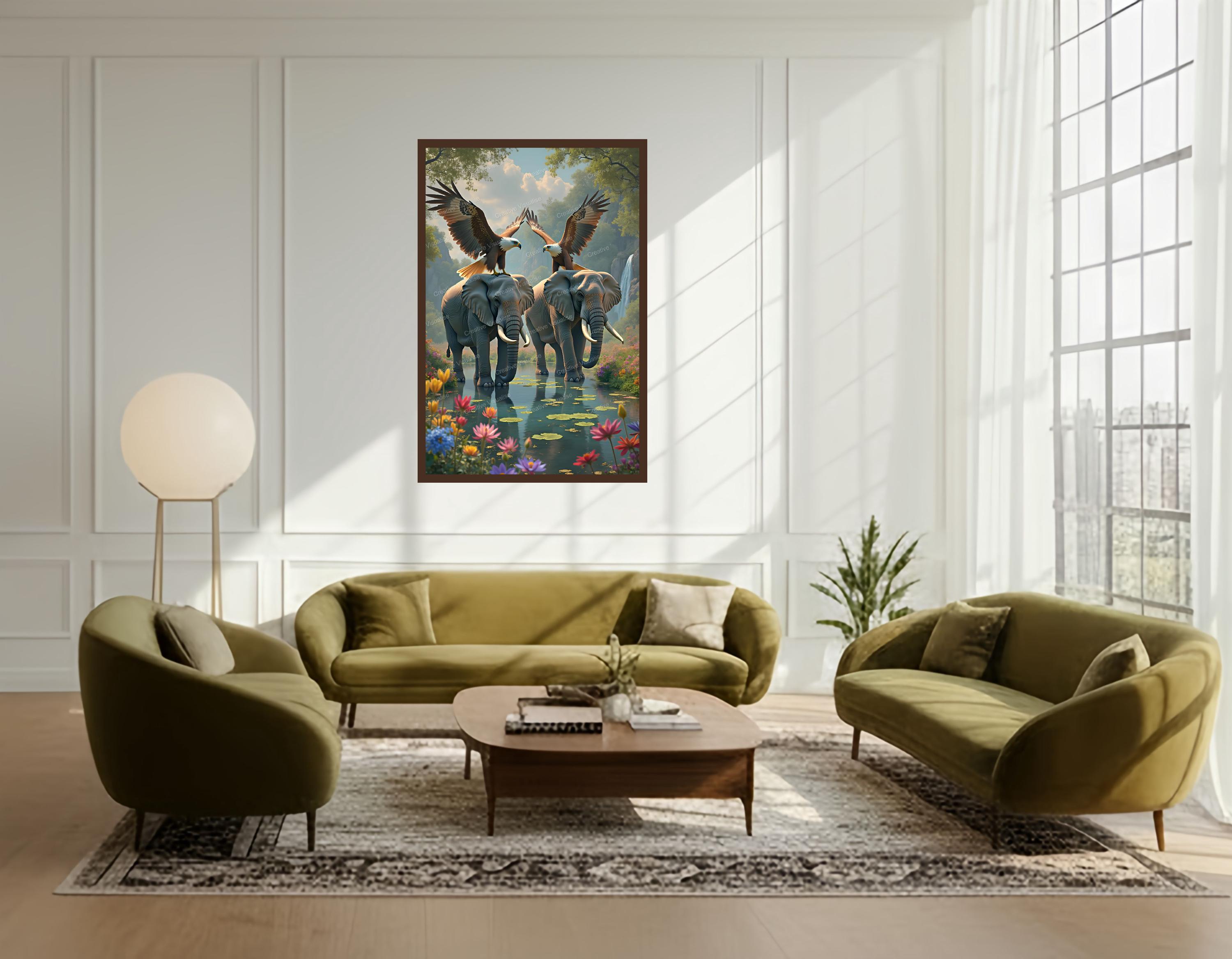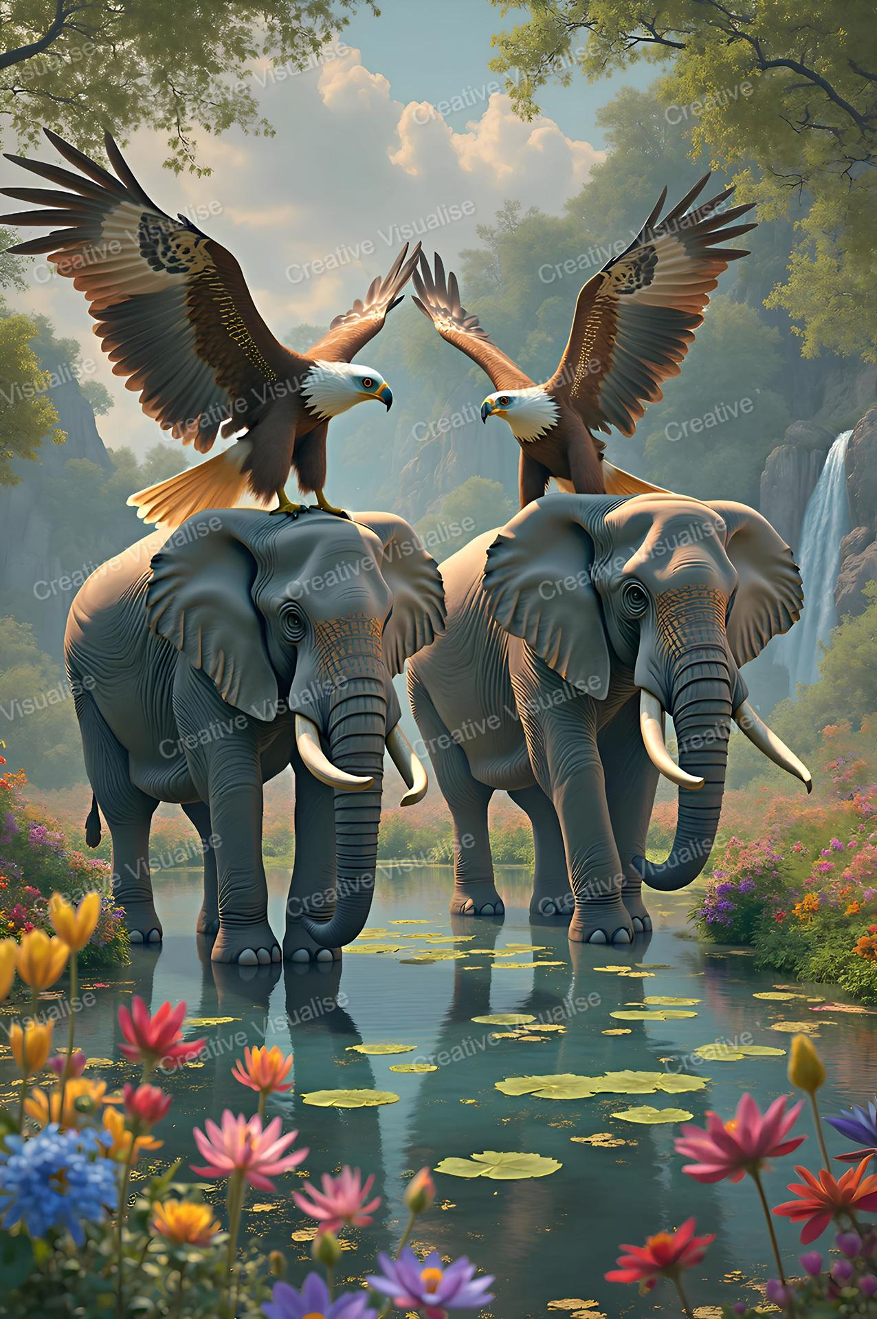 An elephant wallpaper and bald eagle canvas digital photo that can be easily downloaded and printed (not a physical item for delivery). The details of the digitally received image are about 11000 × 16000 pixels, 300 DPI, JPEG and PDF formats, AI artwork, very high resolution without a watermark, and large enough for professional posters, canvas prints, and wall decor. Please send me a message if you need another file format after the original files' delivery. This price is for personal use! For commercial use, please send me a message.