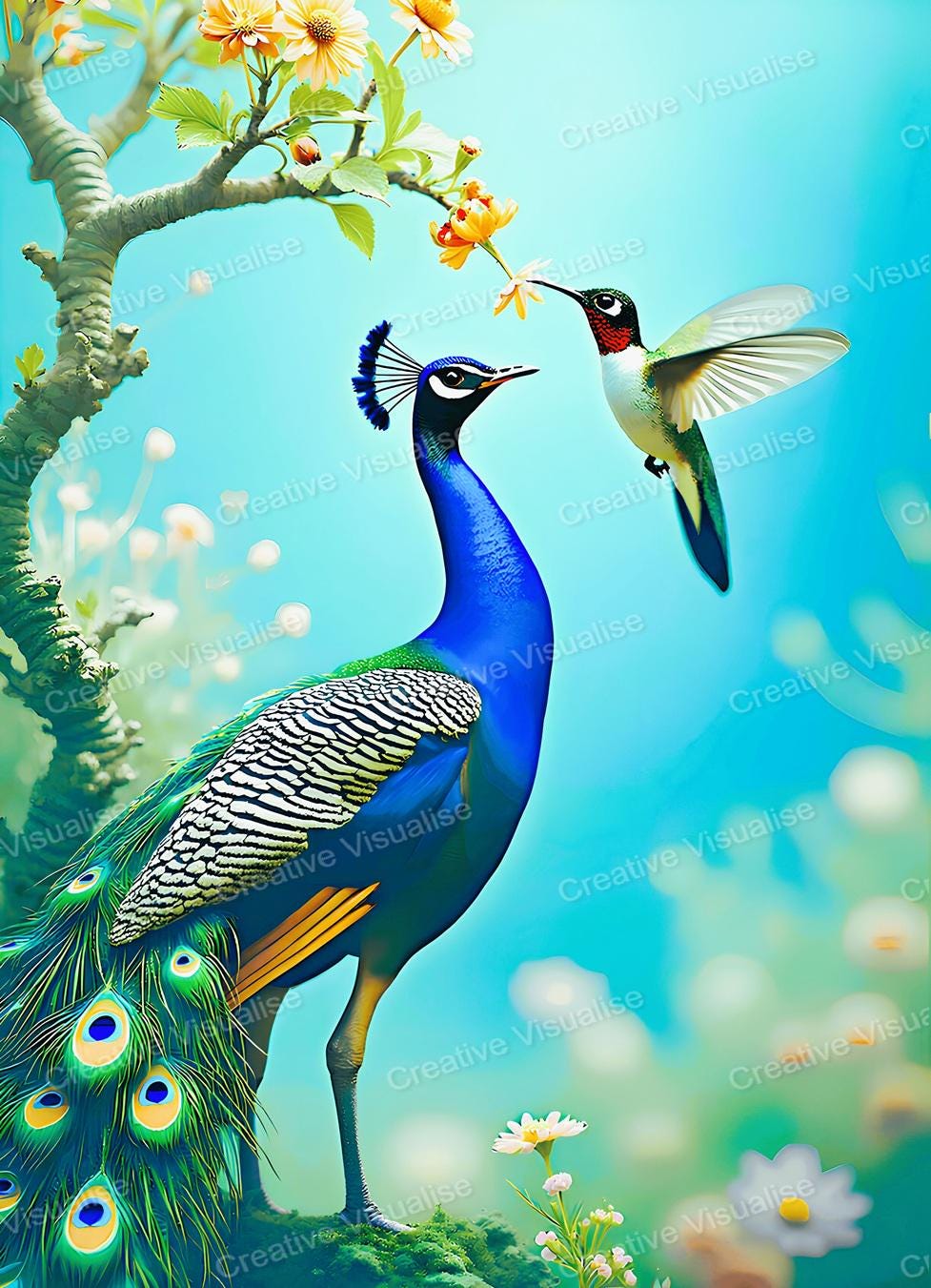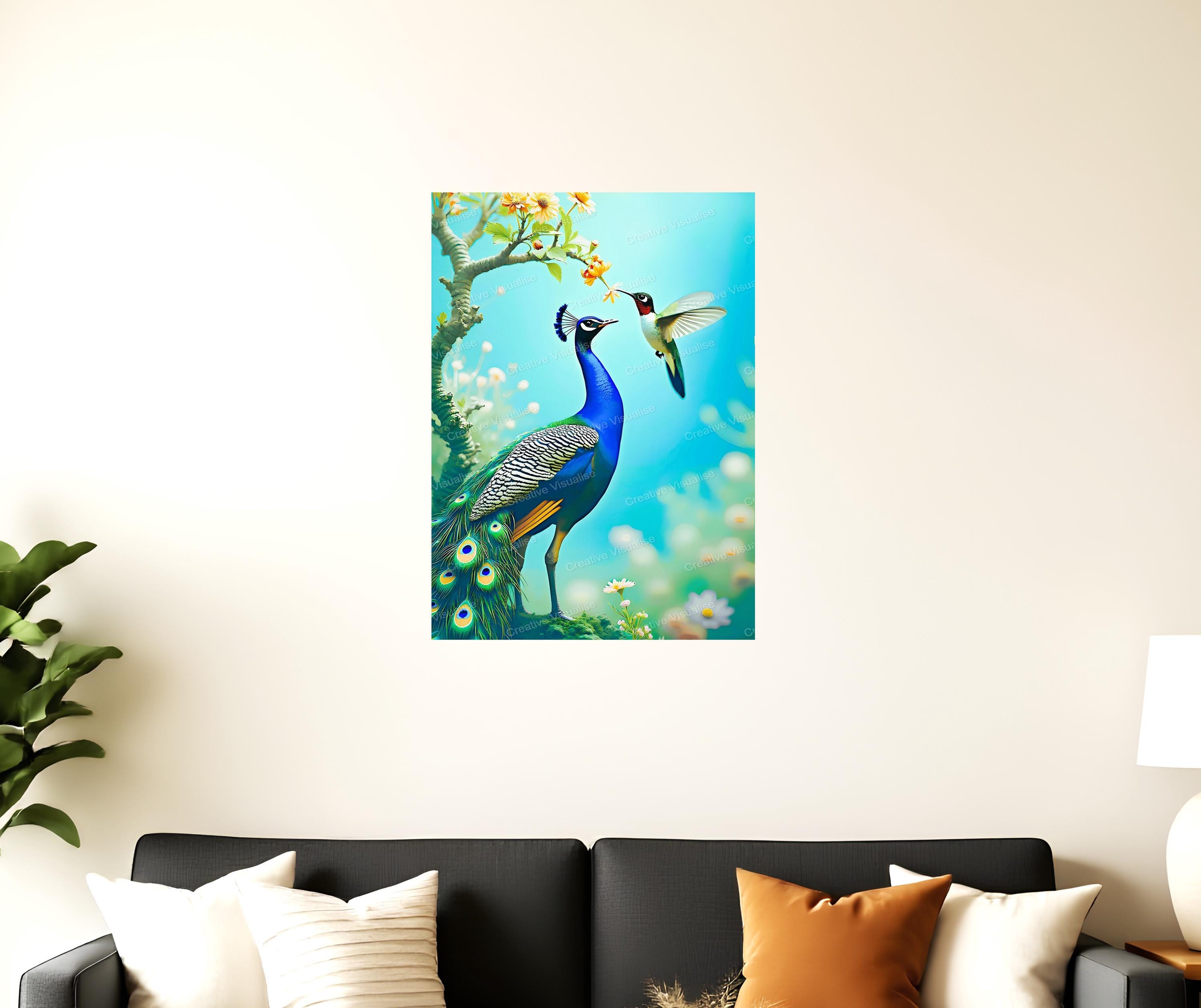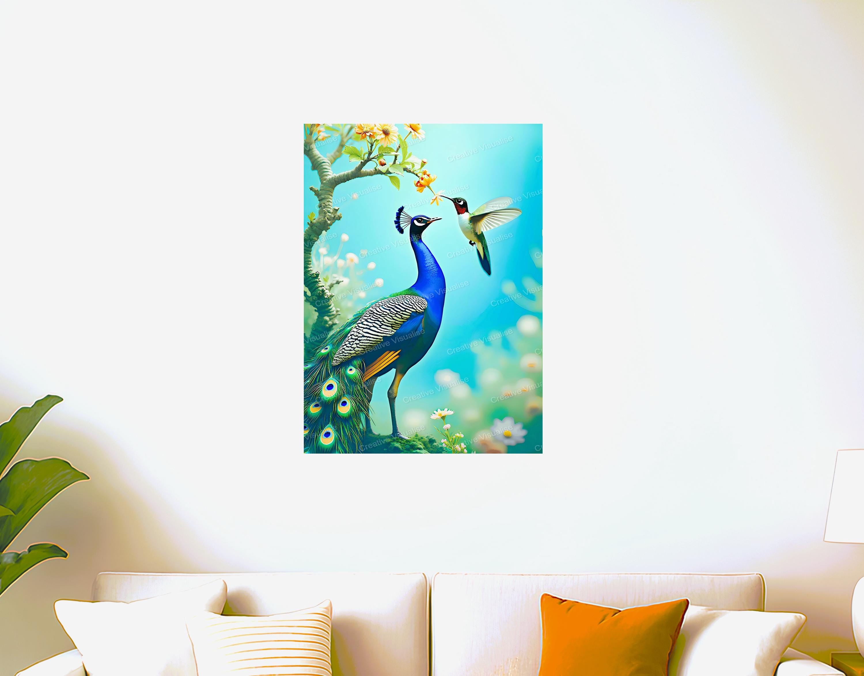 A digital photo of a peacock wallpaper that can be easily downloaded and printed. It is large enough for professional posters, canvas prints, and wall decor. The sizes of received digital files: 1. PNG file, 4700×7000 pixels 2. PDF file, 18×24 inches 3. PDF file, 16×20 inches (8×10 inches) 4. PDF file, A2 (16.5×23.4 inches) "All files are high-resolution 300 DPI professional quality, ensuring crisp and clear prints at every size."
