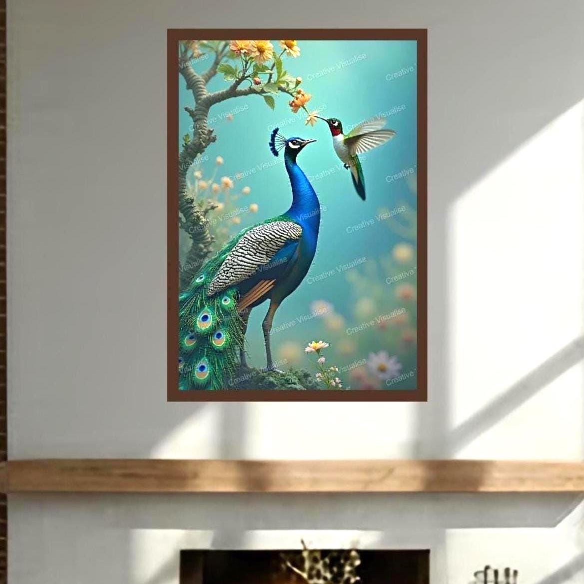 A digital photo of a peacock wallpaper that can be easily downloaded and printed (not a physical item for delivery). The details of the digitally received image are about 11000 × 16000 pixels, 300 DPI, JPEG and PDF formats, AI artwork, very high resolution without a watermark, and large enough for professional posters, canvas prints, and wall decor. Please send me a message if you need another file format after the original files' delivery. This price is for personal use! For commercial use, please send me a message.