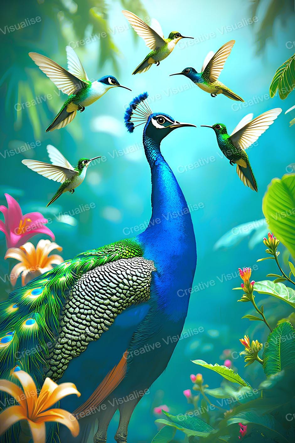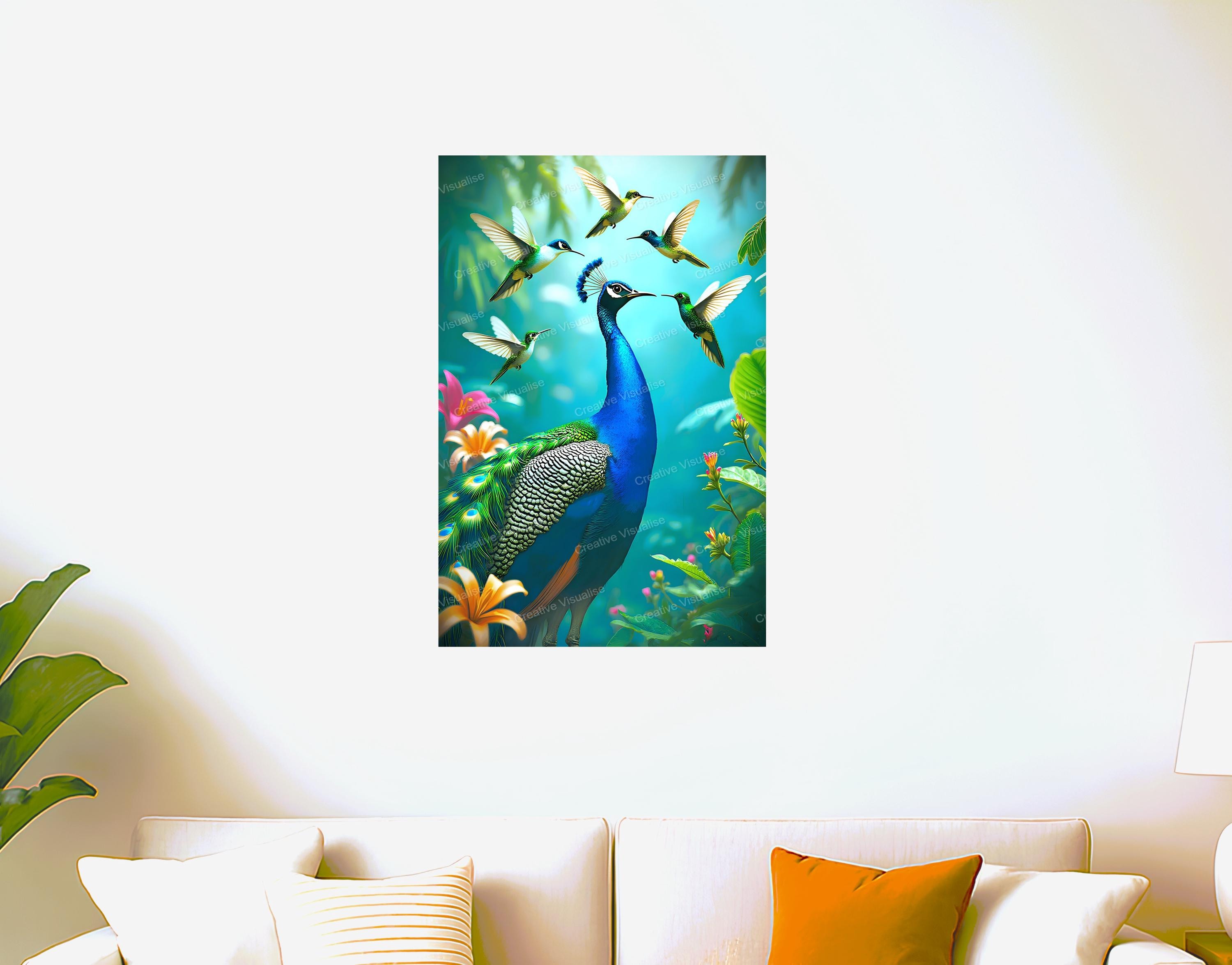 Hummingbirds and peacock artwork digital print that can be easily downloaded and printed (not physical items for delivery). The details of the digitally received image are about 5000 × 7000 pixels, 300 DPI, PNG and PDF formats, AI artwork, very high resolution without a watermark, and large enough for professional posters, canvas prints, and wall decor. Please send me a message if you need another file format after the original files' delivery. This price is for personal use! For commercial use, please send me a message.