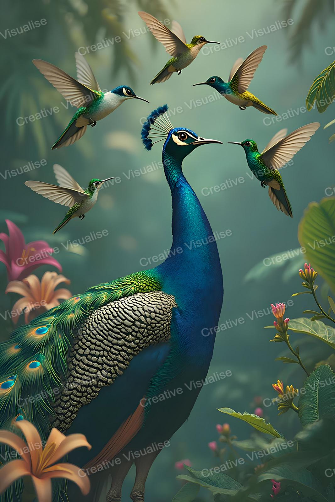 A hummingbird artwork and peacock wallpaper digital photo that can be easily downloaded and printed (not physical items for delivery). The details of the digitally received image are about 11000 × 16000 pixels, 300 DPI, JPEG and PDF formats, AI artwork, very high resolution without a watermark, and large enough for professional posters, canvas prints, and wall decor. Please send me a message if you need another file format after the original files' delivery. This price is for personal use! For commercial use, please send me a message.