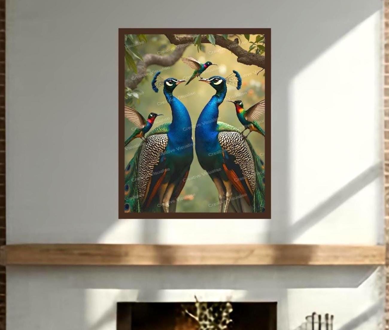 A peacock wallpaper digital photo that can be easily downloaded and printed (not a physical item for delivery). The details of the digitally received image are about 11000 × 16000 pixels, 300 DPI, JPEG and PDF formats, AI artwork, very high resolution without a watermark, and large enough for professional posters, canvas prints, and wall decor. Please send me a message if you need another file format after the original files' delivery. This price is for personal use! For commercial use, please send me a message.