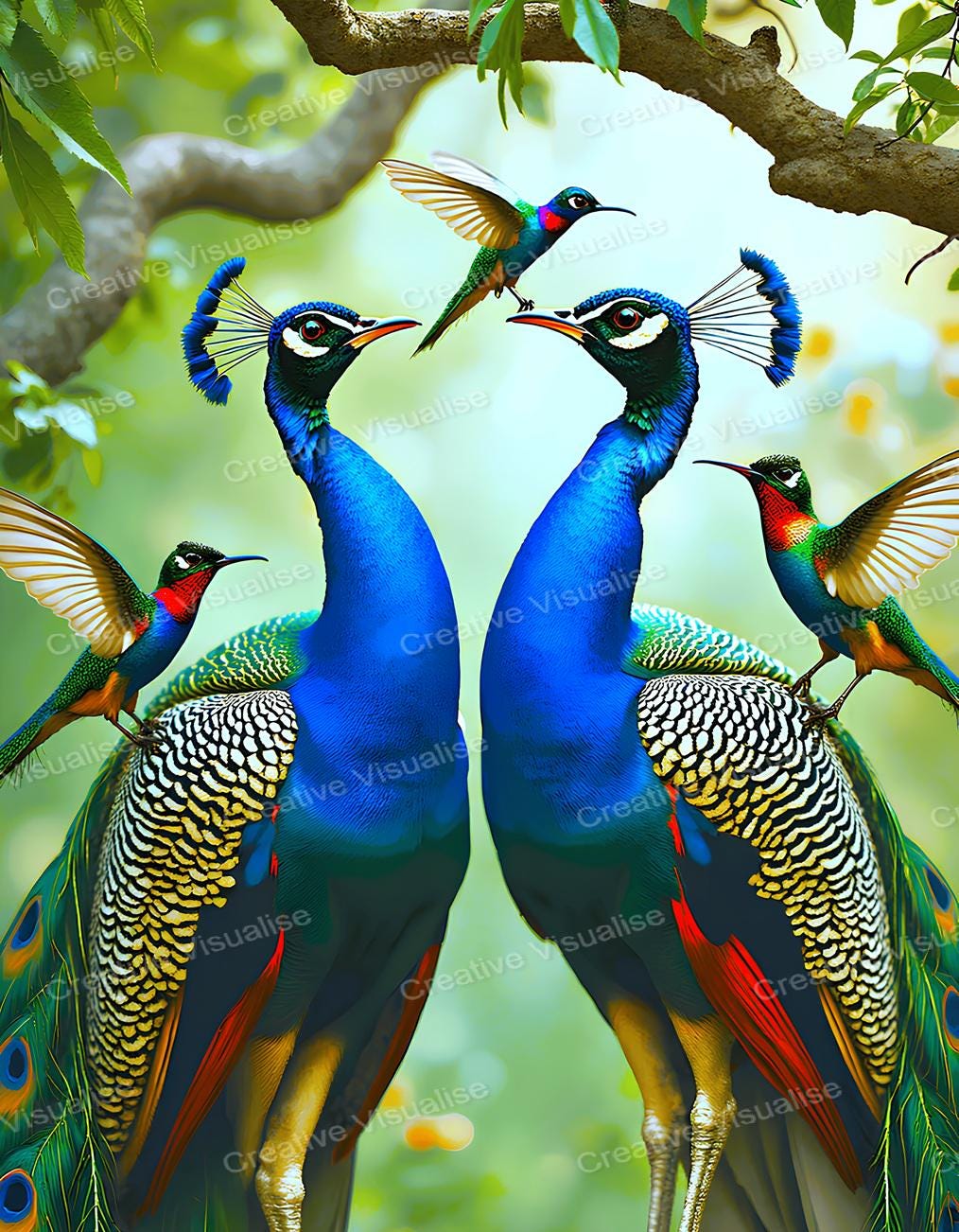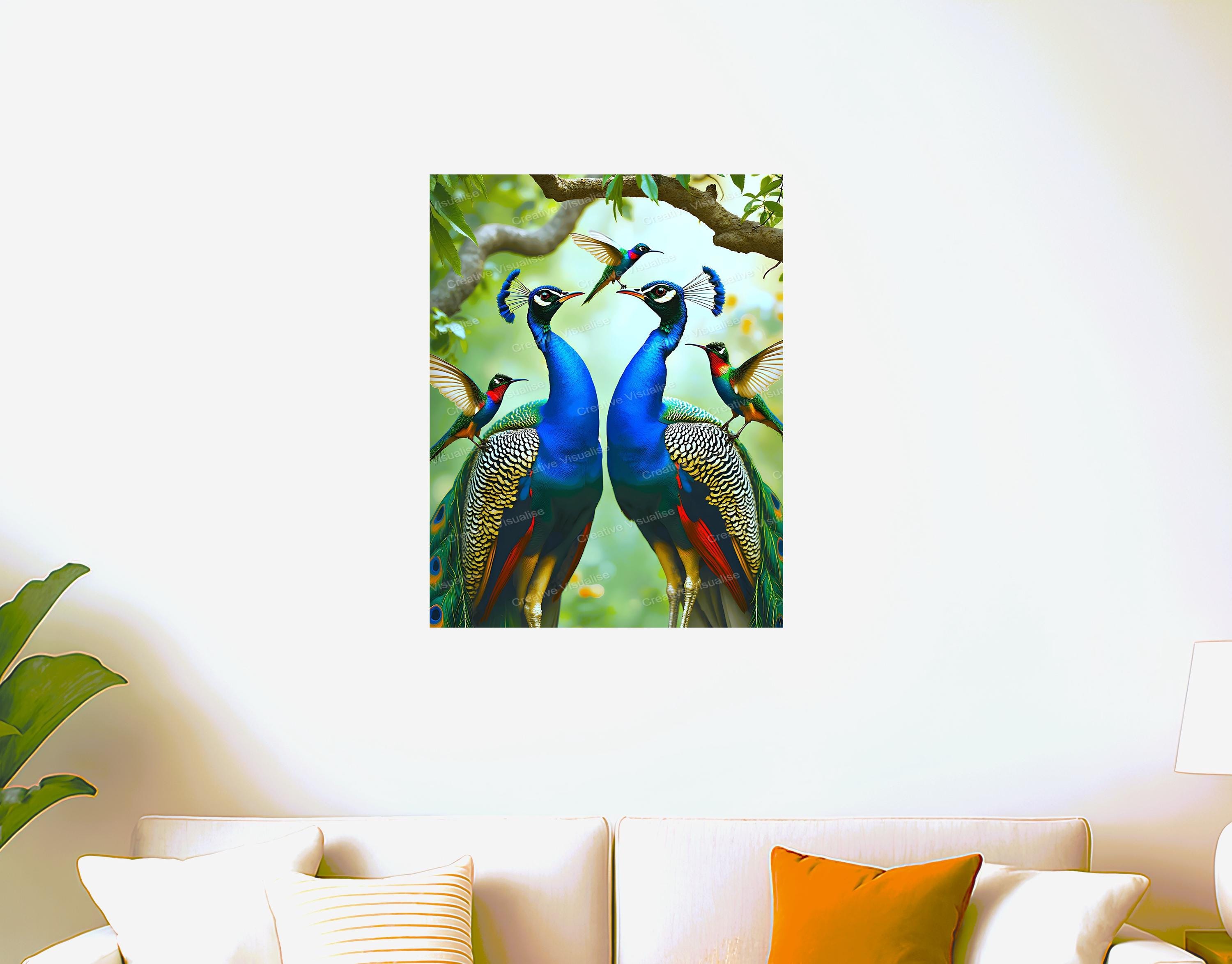 Peacocks digital photo that can be easily downloaded and printed. It is large enough for professional posters, canvas prints, and wall decor. The sizes of received digital files: 1. PNG file, 5000×6500 pixels 2. PDF file, 16×20 (8×10 and 4×6) inches 3. PDF file, 18×24 (12×16 and 6×8) inches 4. PDF file, A2 (16.5×23.4 inches) 5. PDF file, 16×16 inches All files are high-resolution 300 DPI professional quality, ensuring crisp and clear prints at every size.
