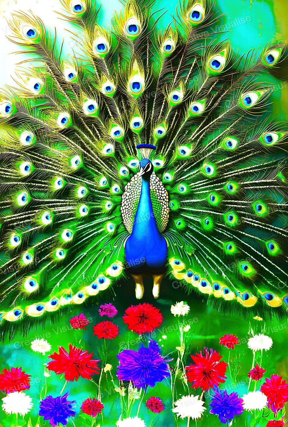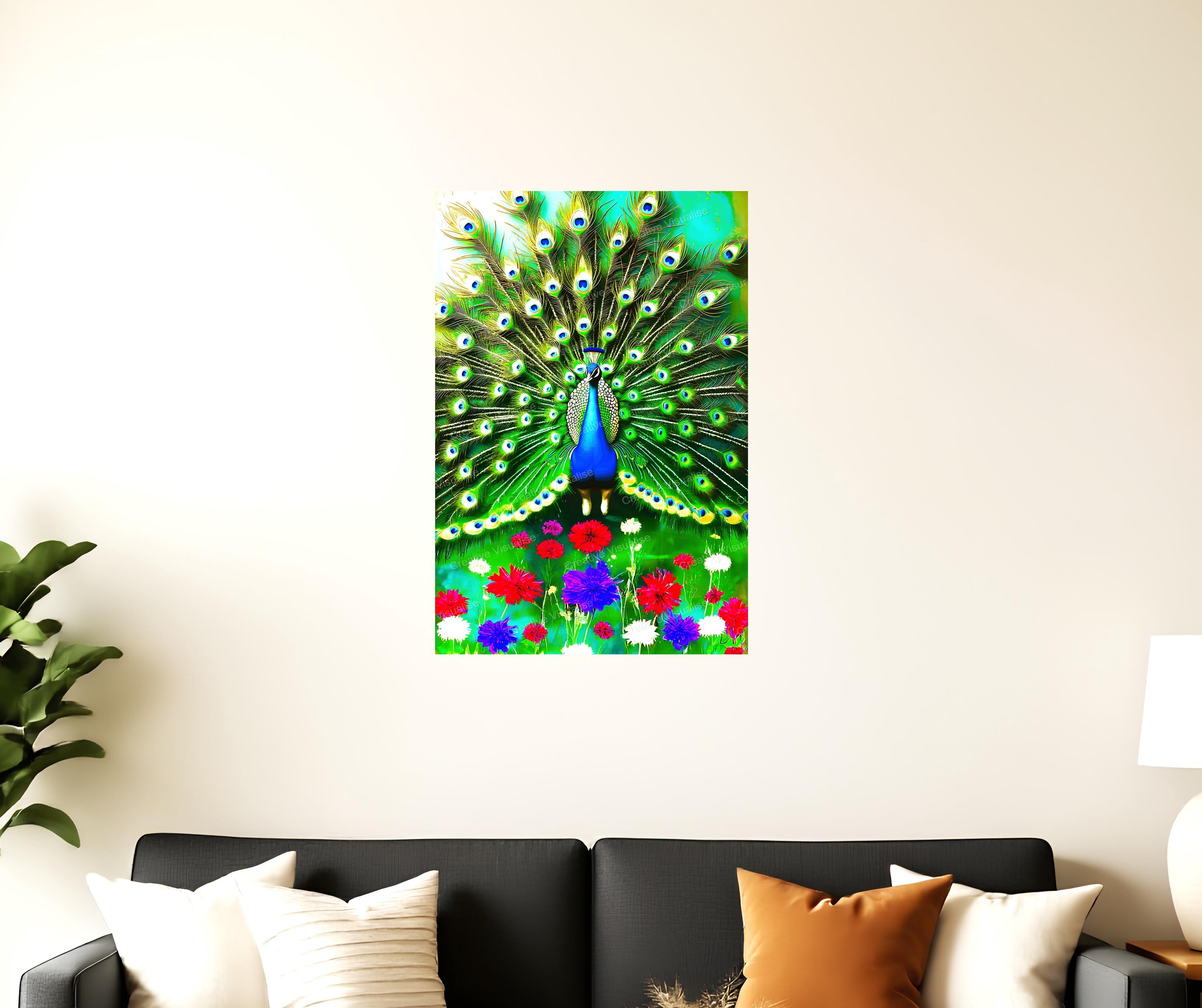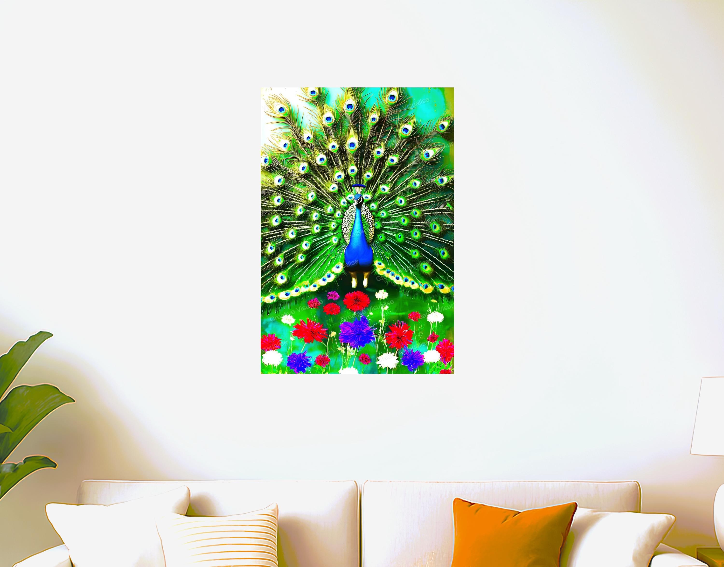 A digital photo of a peacock in flowers that can be easily downloaded and printed. It is large enough for professional posters, canvas prints, and wall décor. The sizes of received digital files: 1. PNG file, 4700×7000 pixels 2. PDF file, 16×20 (8×10 and 4×6) inches 3. PDF file, 18×24 (12×16 and 6×8) inches 4. PDF file, A2 (16.5×23.4 inches) 5. PDF file, 16×16 inches All files are high-resolution 300 DPI professional quality, ensuring crisp and clear prints at every size.