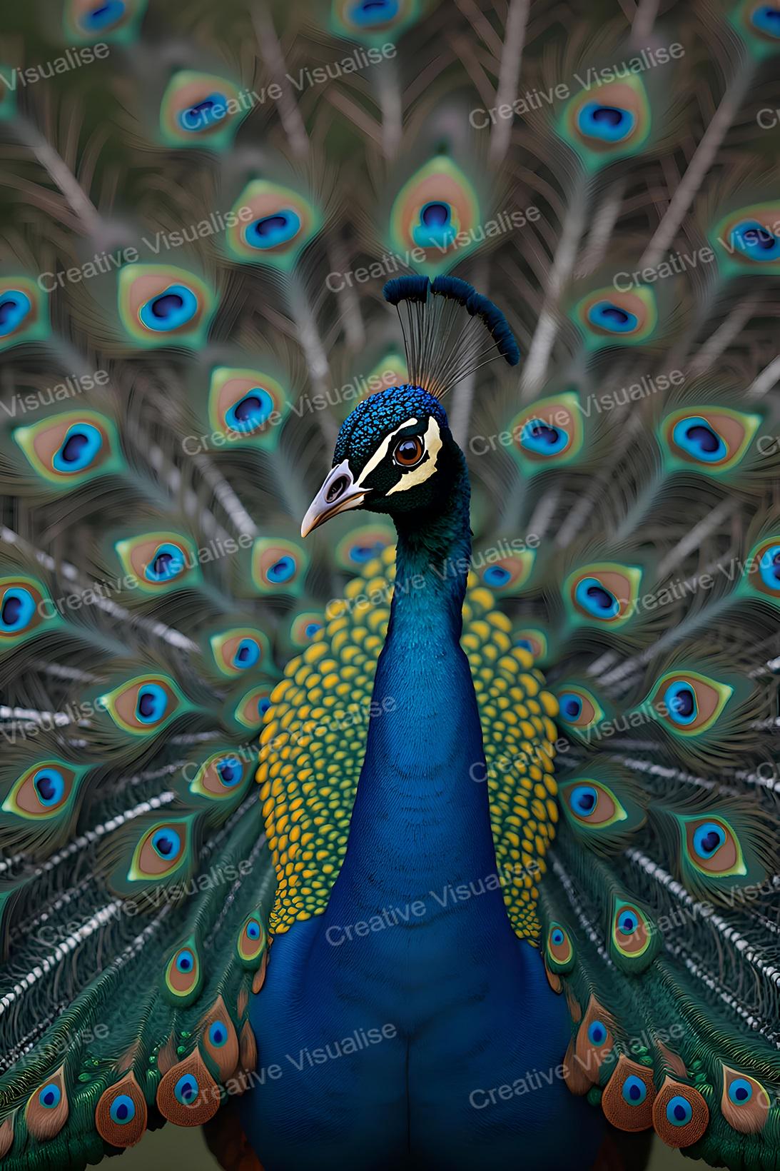 A peacock wallpaper digital photo that can be easily downloaded and printed (not a physical item for delivery). The details of the digitally received image are about 11000 × 16000 pixels, 300 DPI, JPEG and PDF formats, AI artwork, very high resolution without a watermark, and large enough for professional posters, canvas prints, and wall decor. Please send me a message if you need another file format after the original files' delivery. This price is for personal use! For commercial use, please send me a message.