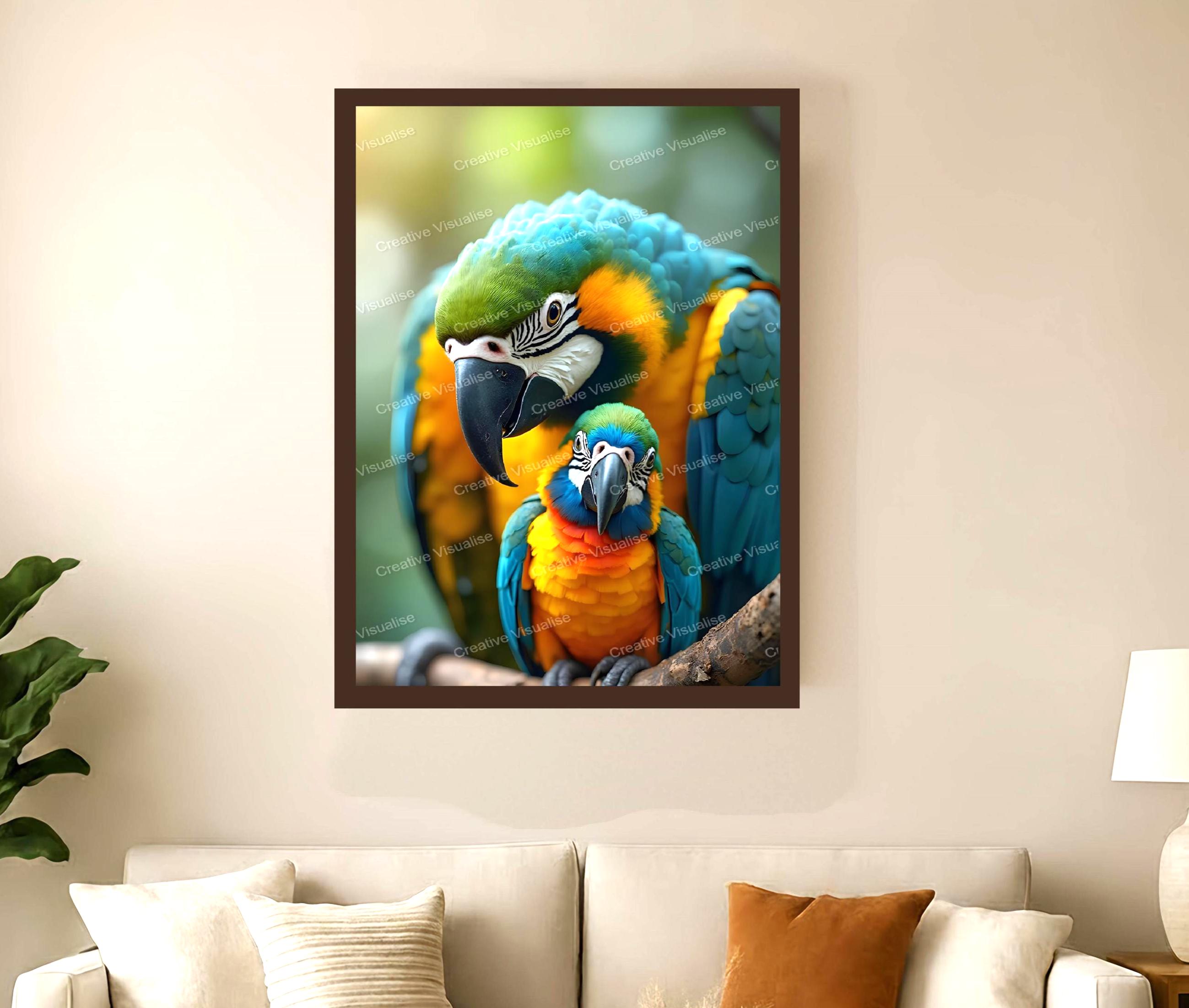 Digital photo of mom and baby Macaw parrots that can be easily downloaded and printed (not a physical item for delivery). The details of the digitally received image are about 11000 × 16000 pixels, 300 DPI, JPEG and PDF formats, AI artwork, very high resolution without a watermark, and large enough for professional posters, canvas prints, and wall decor. Please send me a message if you need another file format after the original files' delivery. This price is for personal use! For commercial use, please send me a message.