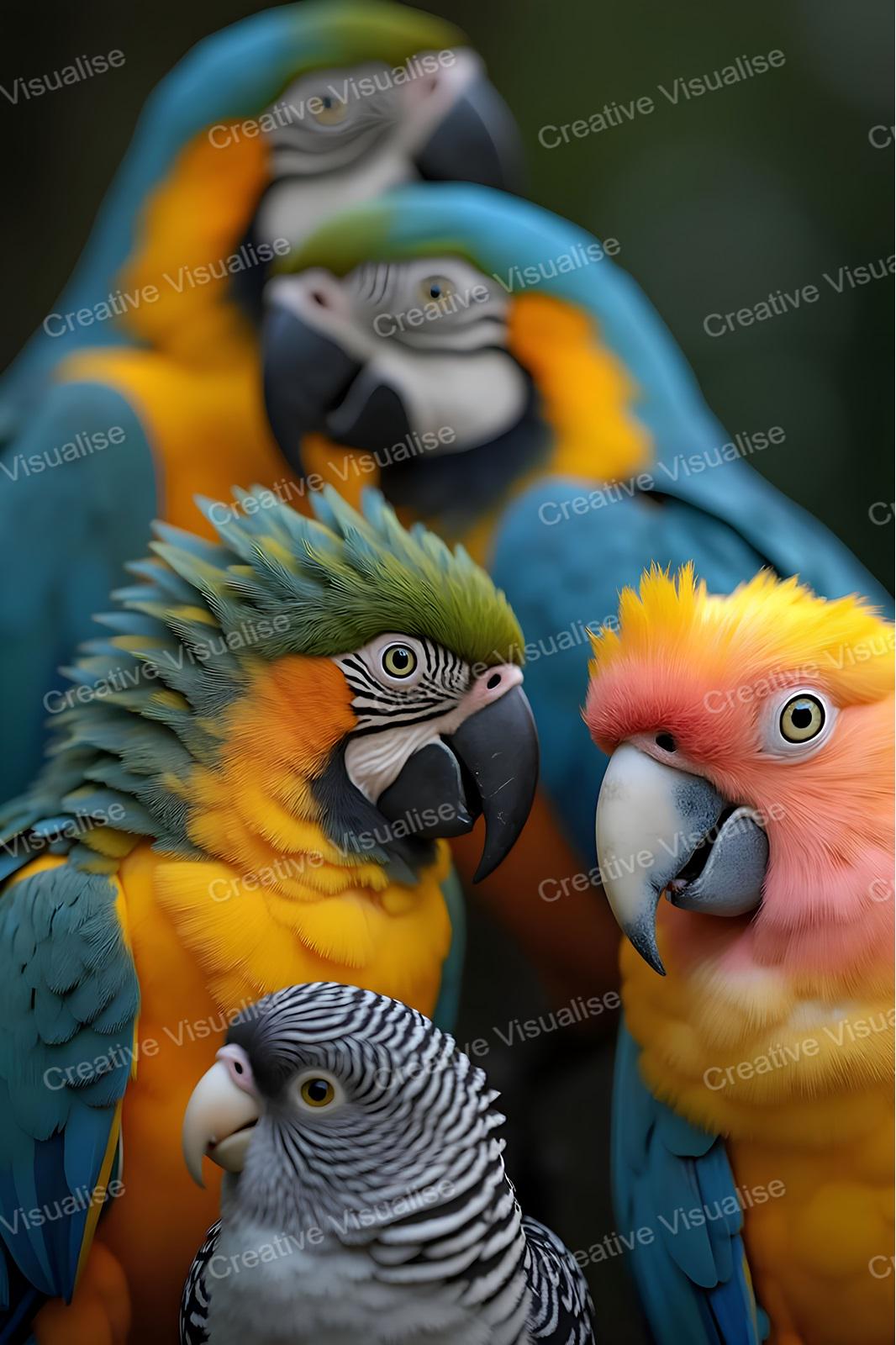 A digital photo about macaws and parrots that can be easily downloaded and printed (not a physical item for delivery). The details of the digitally received image are about 11000 × 16000 pixels, 300 DPI, JPEG and PDF formats, AI artwork, very high resolution without a watermark, and large enough for professional posters, canvas prints, and wall decor. Please send me a message if you need another file format after the original files' delivery. This price is for personal use! For commercial use, please send me a message.