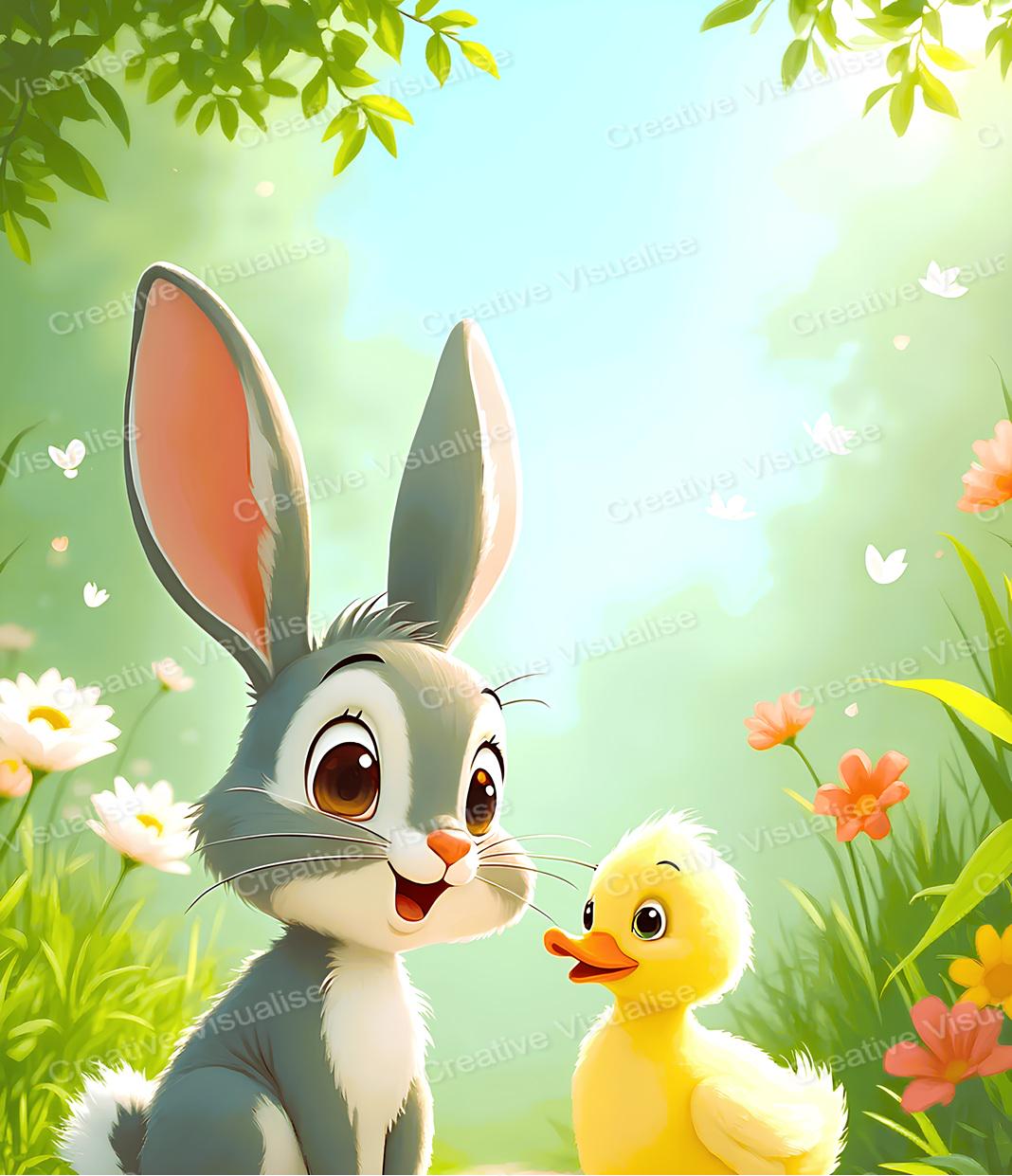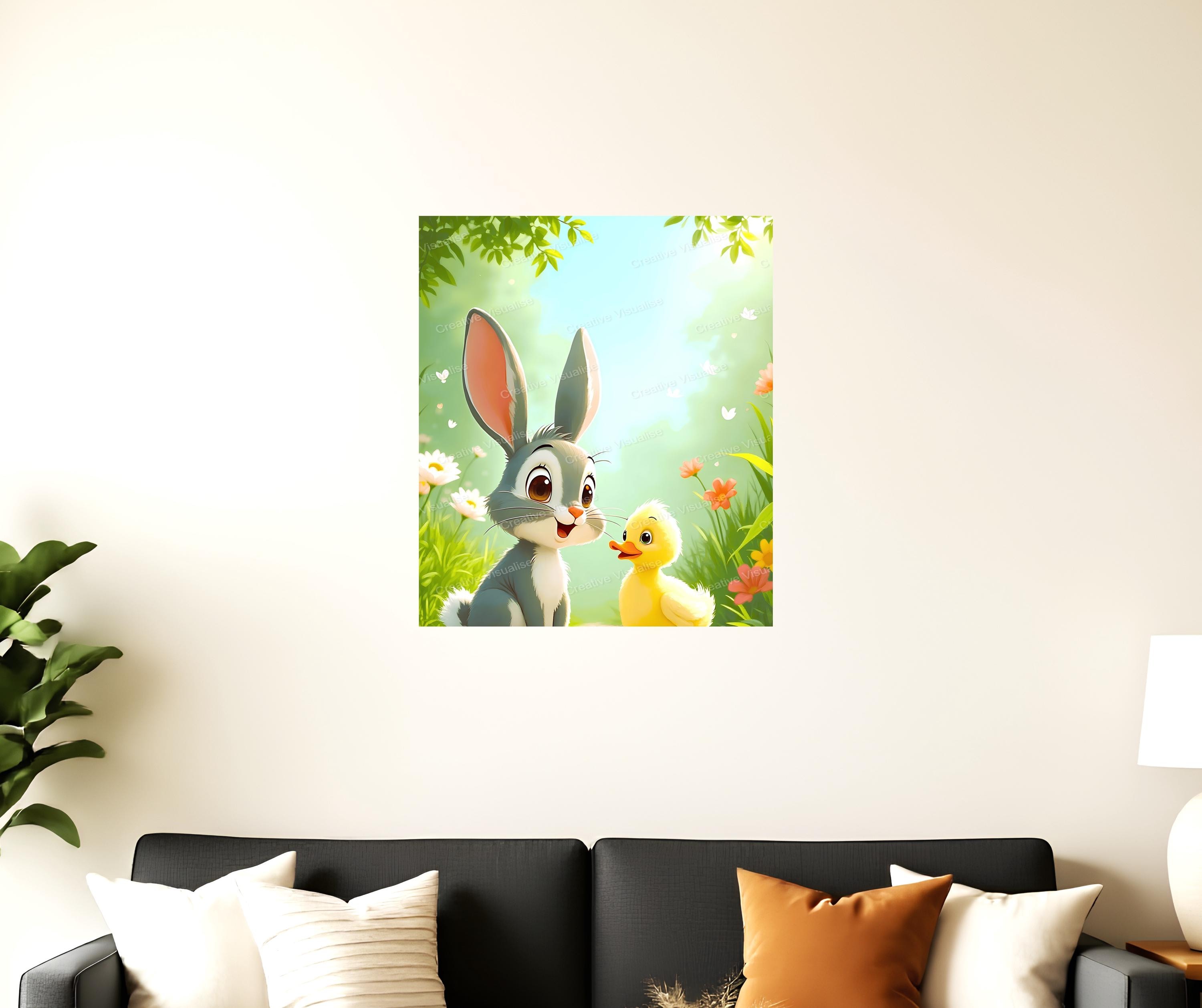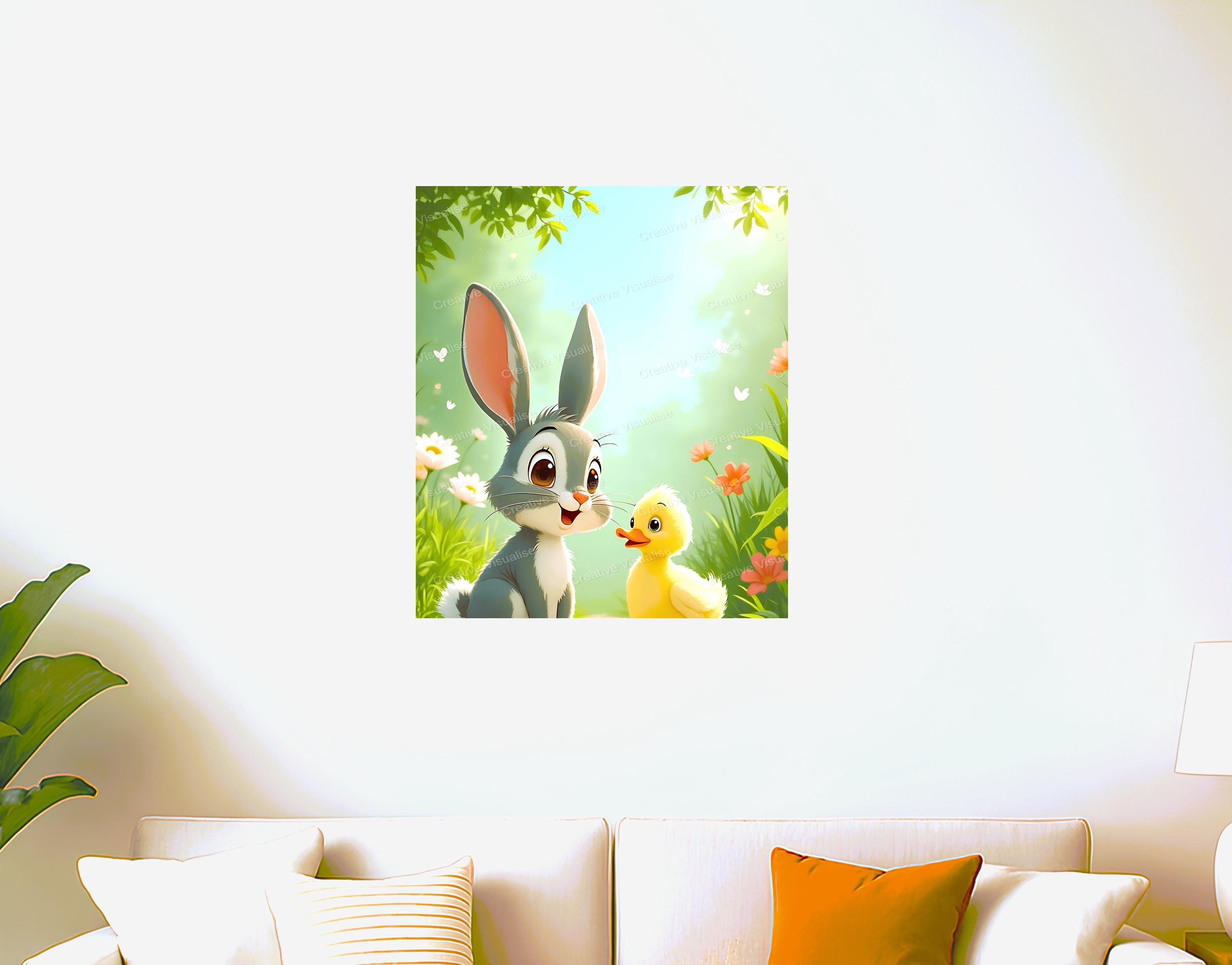 A digital photo of a duckling and baby rabbit that can be easily downloaded and printed. It is large enough for professional posters, canvas prints, and wall decor. The sizes of received digital files: 1. PNG file, 5300×6200 pixels 2. PDF file, 16×20 (8×10 and 4×6) inches 3. PDF file, 12×16 (6×8) inches 4. PDF file, A2 (16.5×23.4 inches) 5. PDF file, 16×16 inches All files are high-resolution 300 DPI professional quality, ensuring crisp and clear prints at every size.