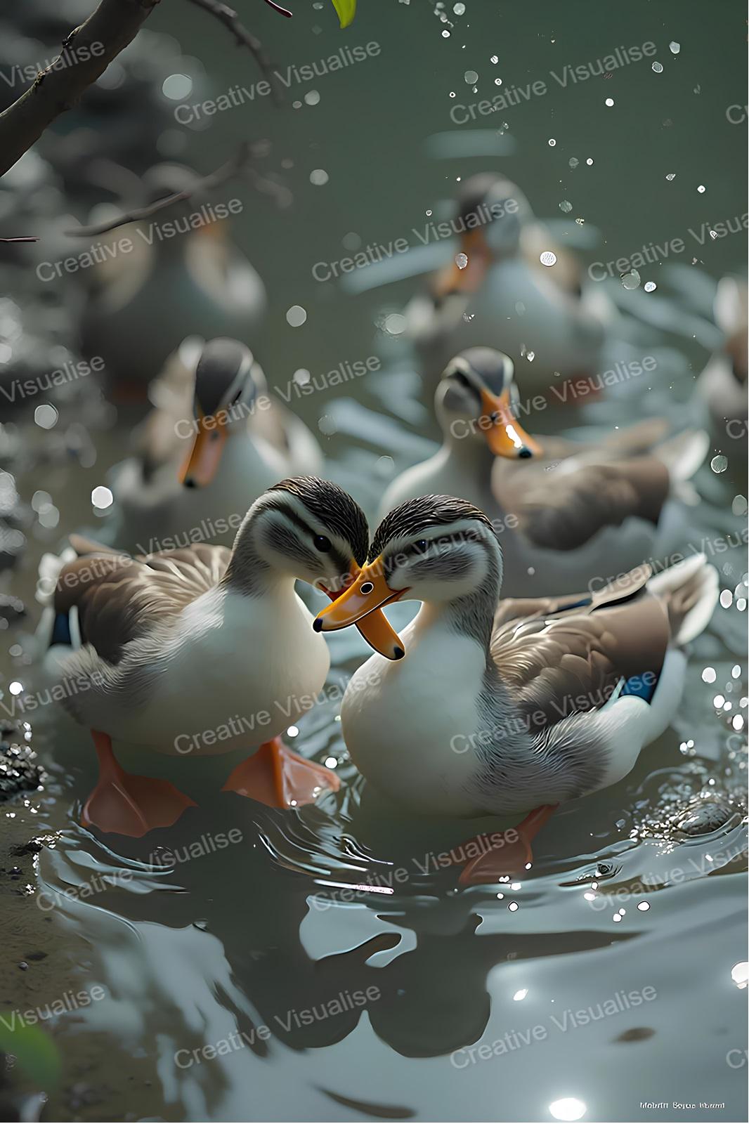 A digital photo of ducks that can be easily downloaded and printed (not a physical item for delivery). The details of the digitally received image are about 11000 × 16000 pixels, 300 DPI, JPEG and PDF formats, AI artwork, very high resolution without a watermark, and large enough for professional posters, canvas prints, and wall decor. Please send me a message if you need another file format after the original files' delivery. This price is for personal use! For commercial use, please send me a message.