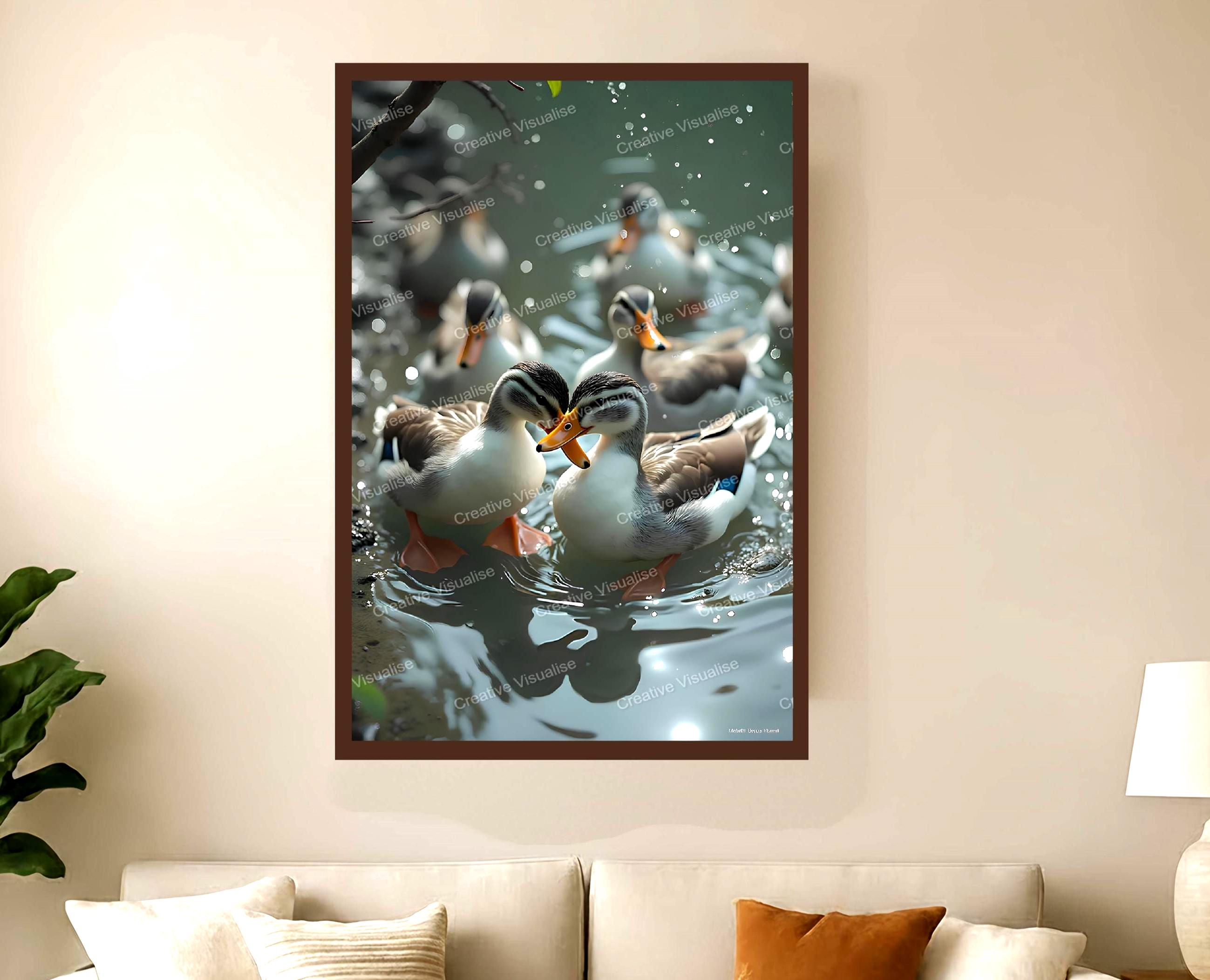 A digital photo of ducks that can be easily downloaded and printed (not a physical item for delivery). The details of the digitally received image are about 11000 × 16000 pixels, 300 DPI, JPEG and PDF formats, AI artwork, very high resolution without a watermark, and large enough for professional posters, canvas prints, and wall decor. Please send me a message if you need another file format after the original files' delivery. This price is for personal use! For commercial use, please send me a message.