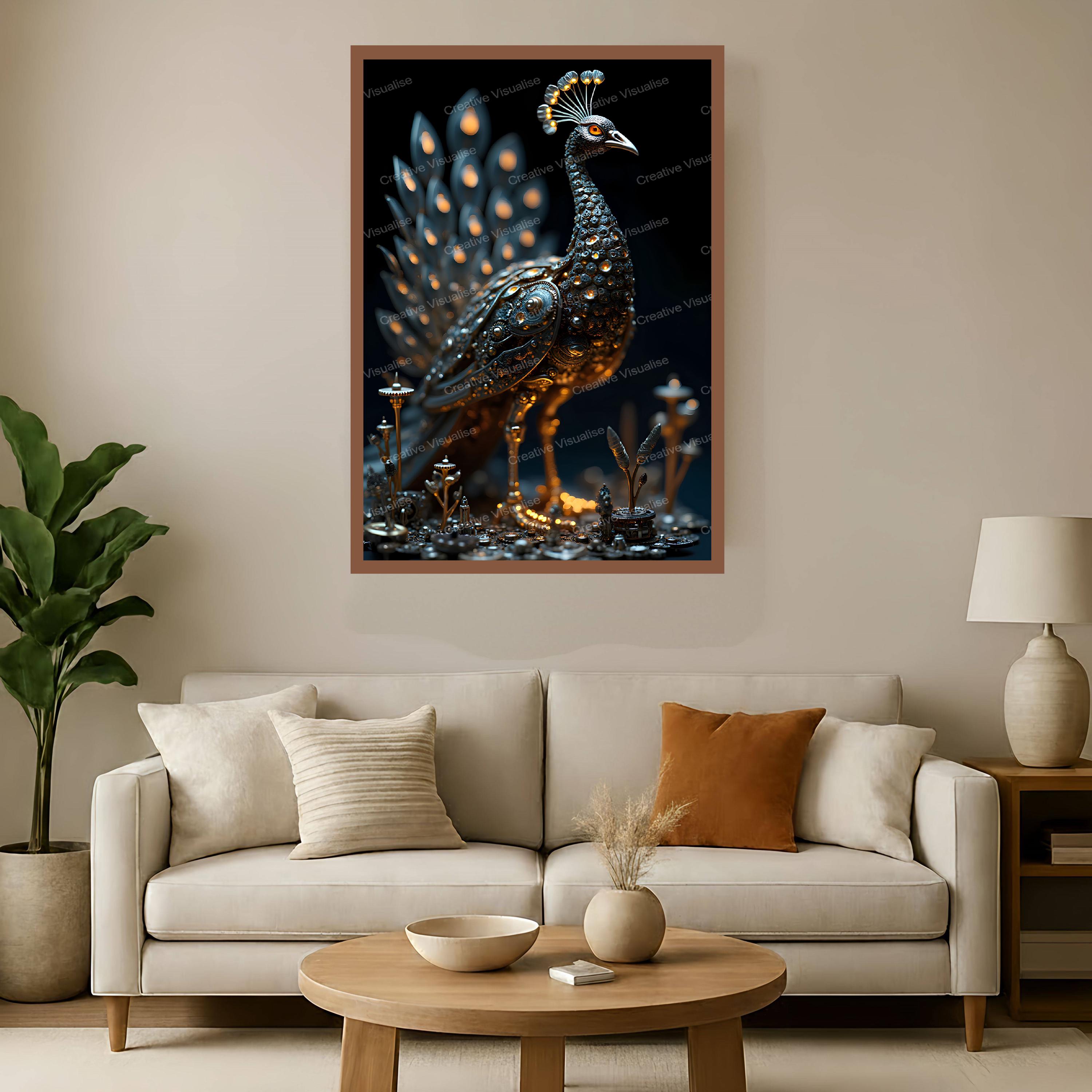 A digital photo of robot peacock wallpaper that can be easily downloaded and printed (not a physical item for delivery). The details of the digitally received image are about 11000 × 16000 pixels, 300 DPI, JPEG and PDF formats, AI artwork, very high resolution without a watermark, and large enough for professional posters, canvas prints, and wall decor. Please send me a message if you need another file format after the original files' delivery. This price is for personal use! For commercial use, please send me a message.