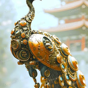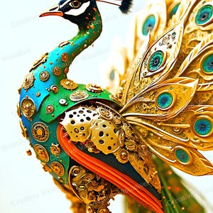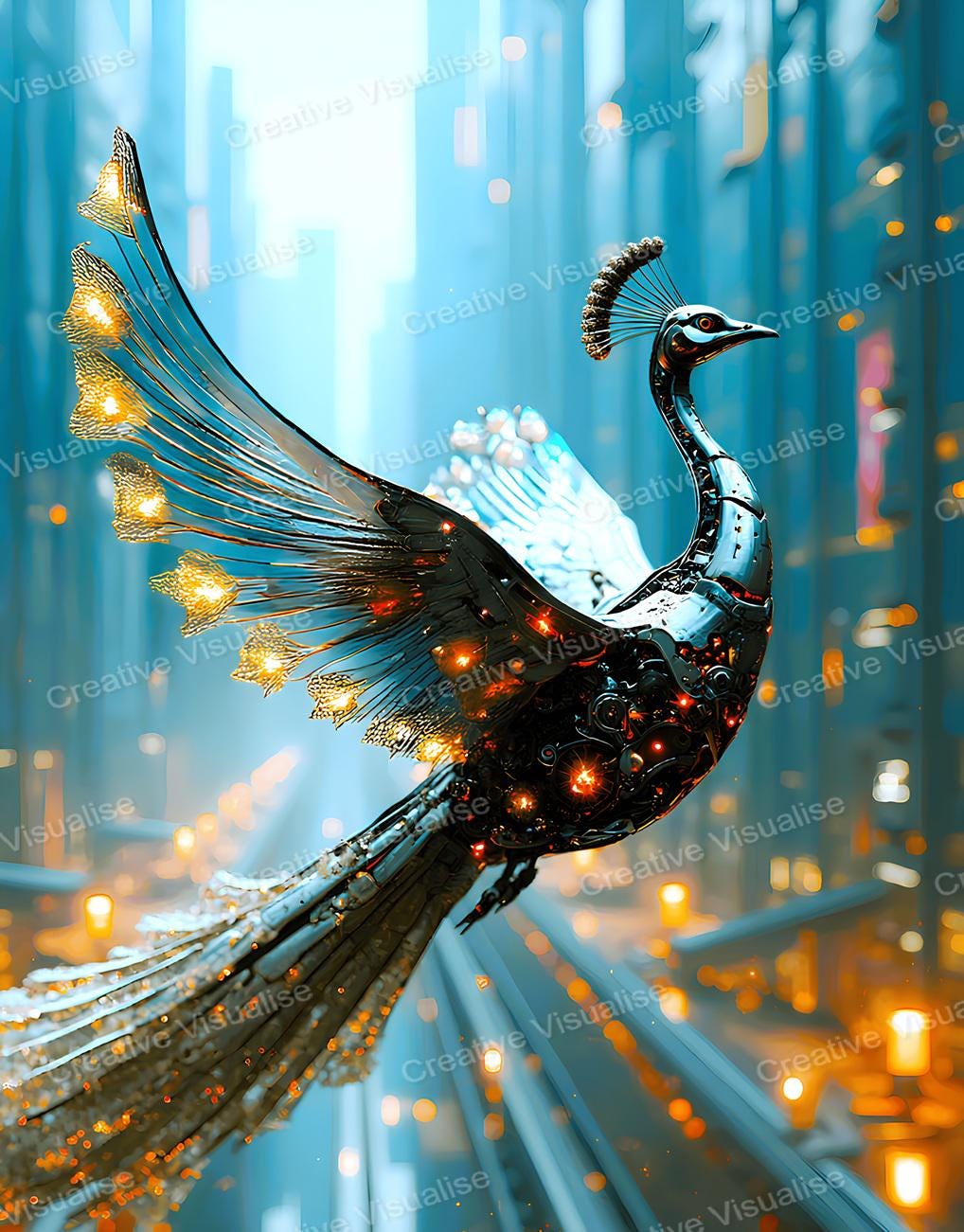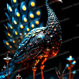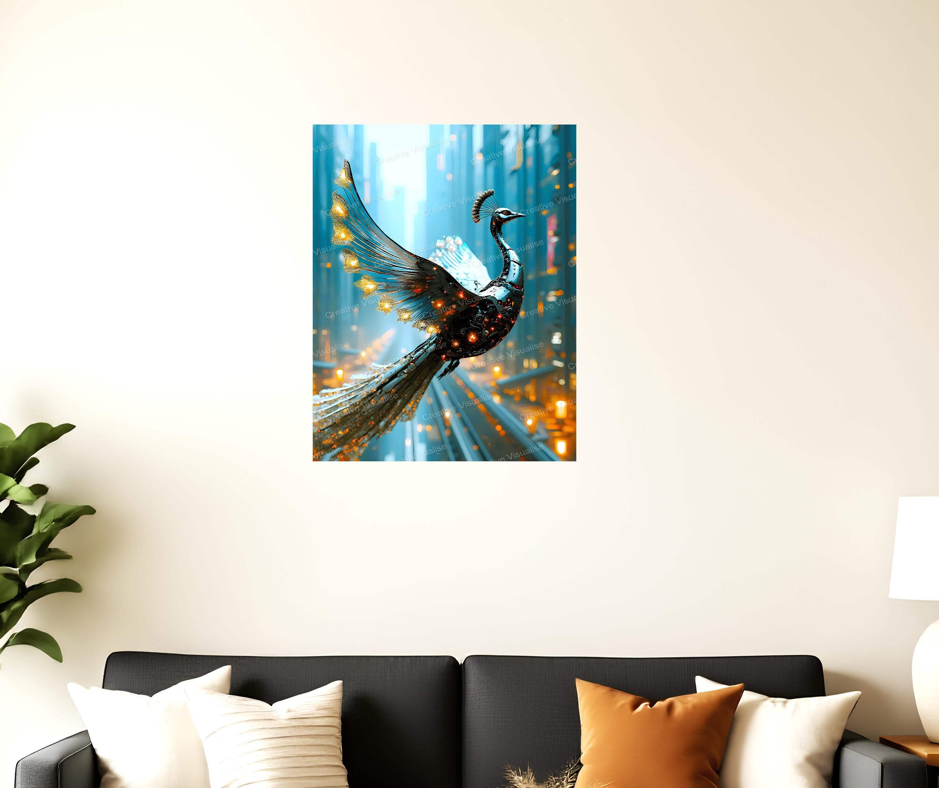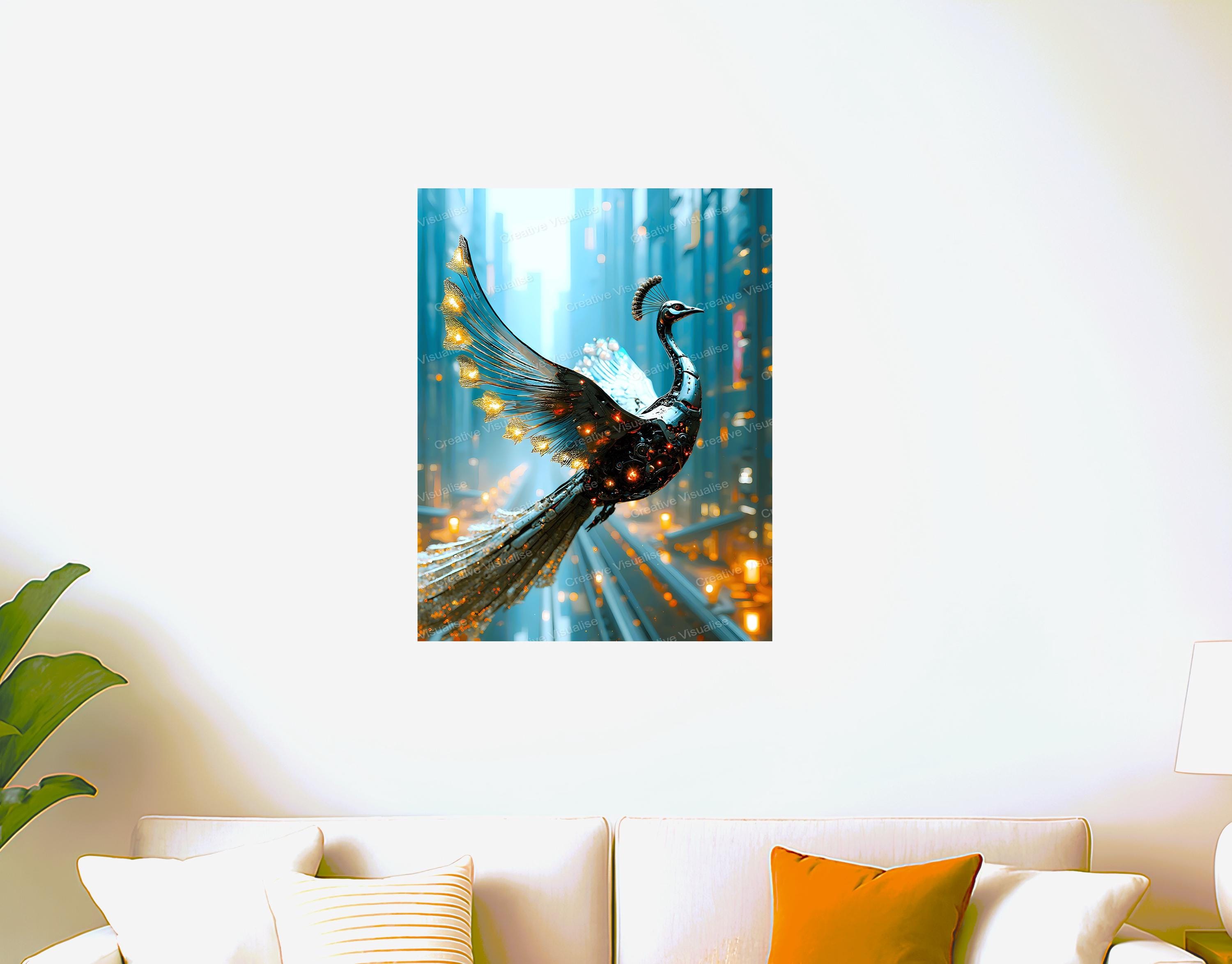Digital photo of a robotic peacock in flight that can be easily downloaded and printed. It is large enough for professional posters, canvas prints, and wall decor. The sizes of received digital files: 1. PNG file, 4700×7000 pixels 2. PDF file, 16×20 (8×10 and 4×6) inches 3. PDF file, 18×24 (12×16 and 6×8) inches 4. PDF file, A2 (16.5×23.4 inches) 5. PDF file, 16×16 inches All files are high-resolution 300 DPI professional quality, ensuring crisp and clear prints at every size.