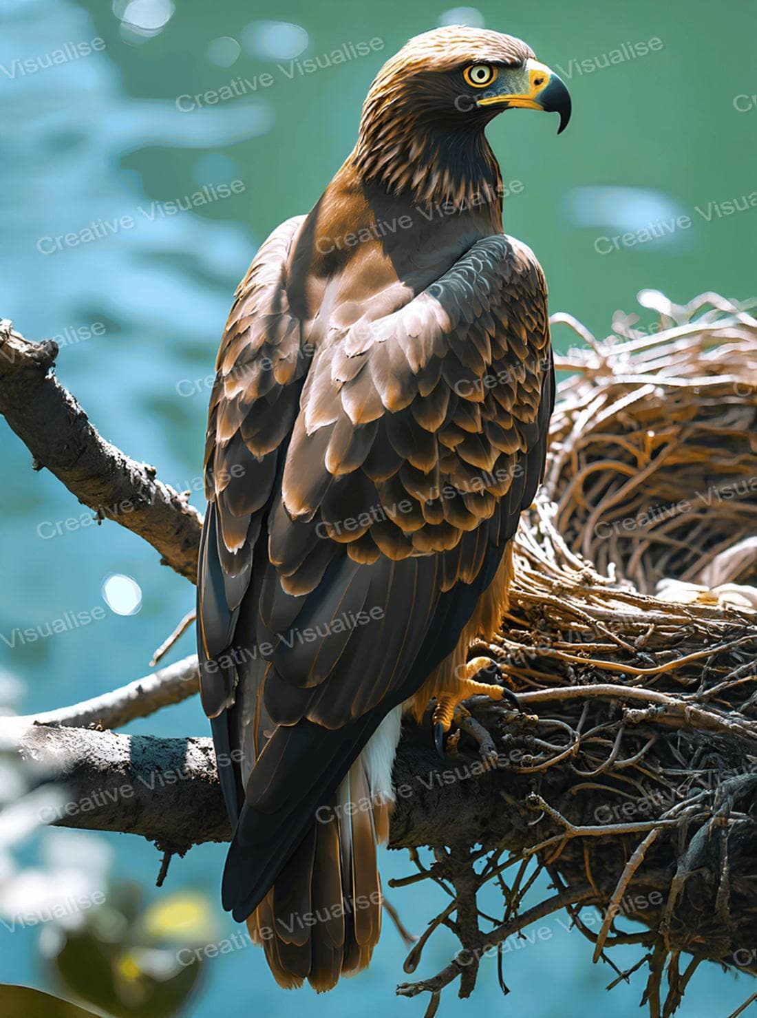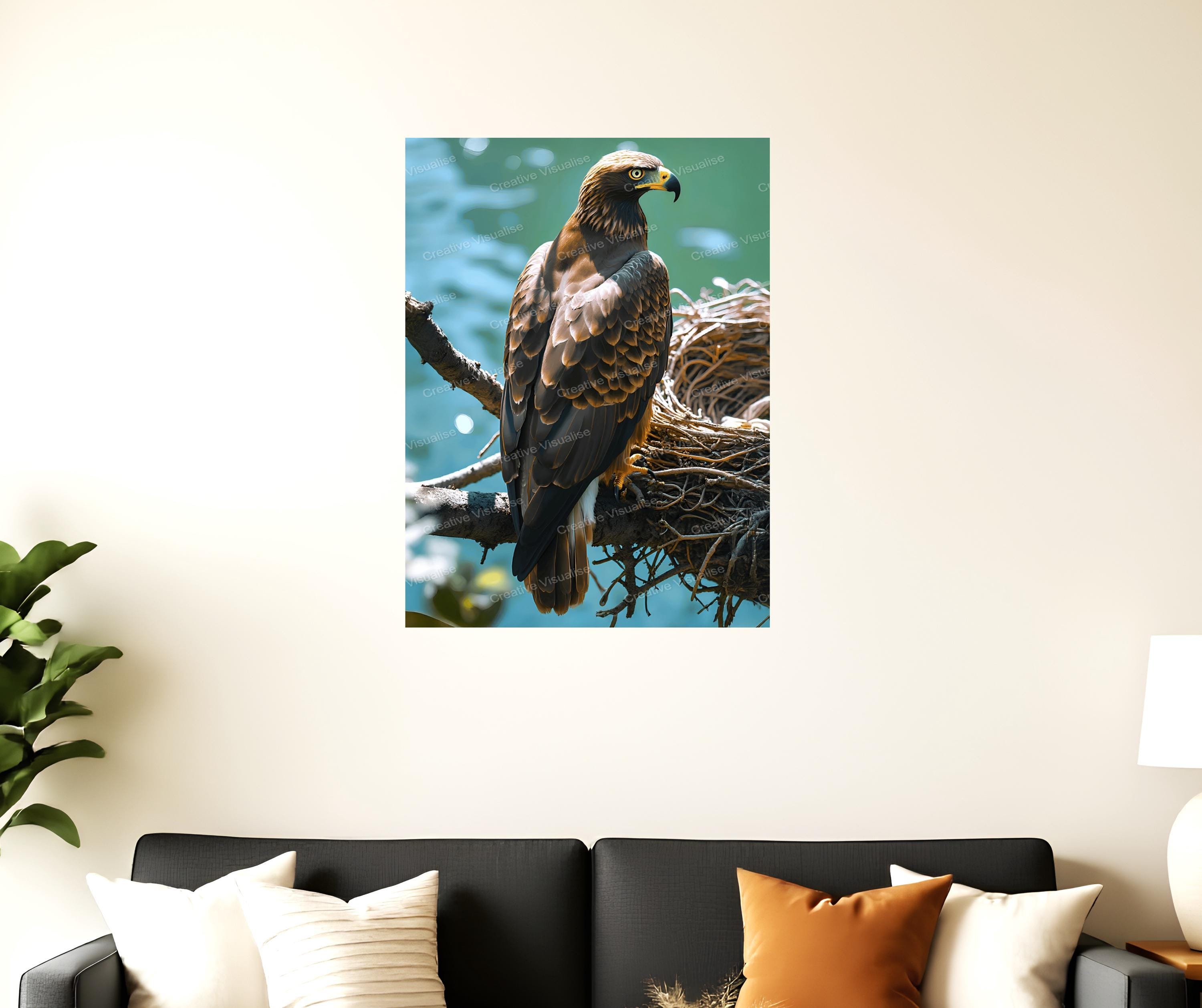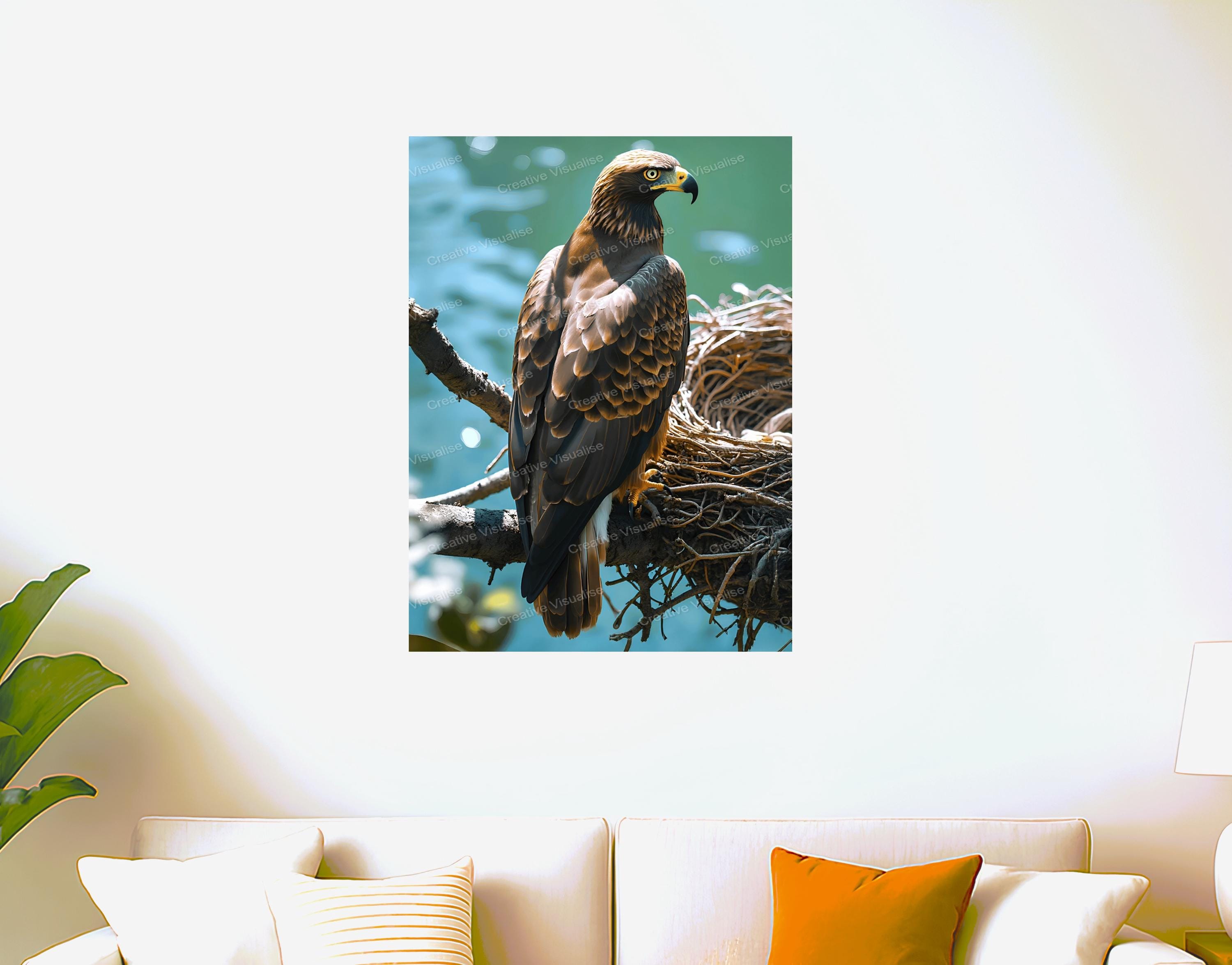 A digital photo of an eagle on a nest that can be easily downloaded and printed. It is large enough for professional posters, canvas prints, and wall decor. The sizes of received digital files: 1. PNG file, 5500×7400 pixels 2. PDF file, 16×20 (8×10 and 4×6) inches 3. PDF file, 18×24 (12×16 and 6×8) inches 4. PDF file, A2 (16.5×23.4 inches) 5. PDF file, 16×16 inches All files are high-resolution 300 DPI professional quality, ensuring crisp and clear prints at every size.