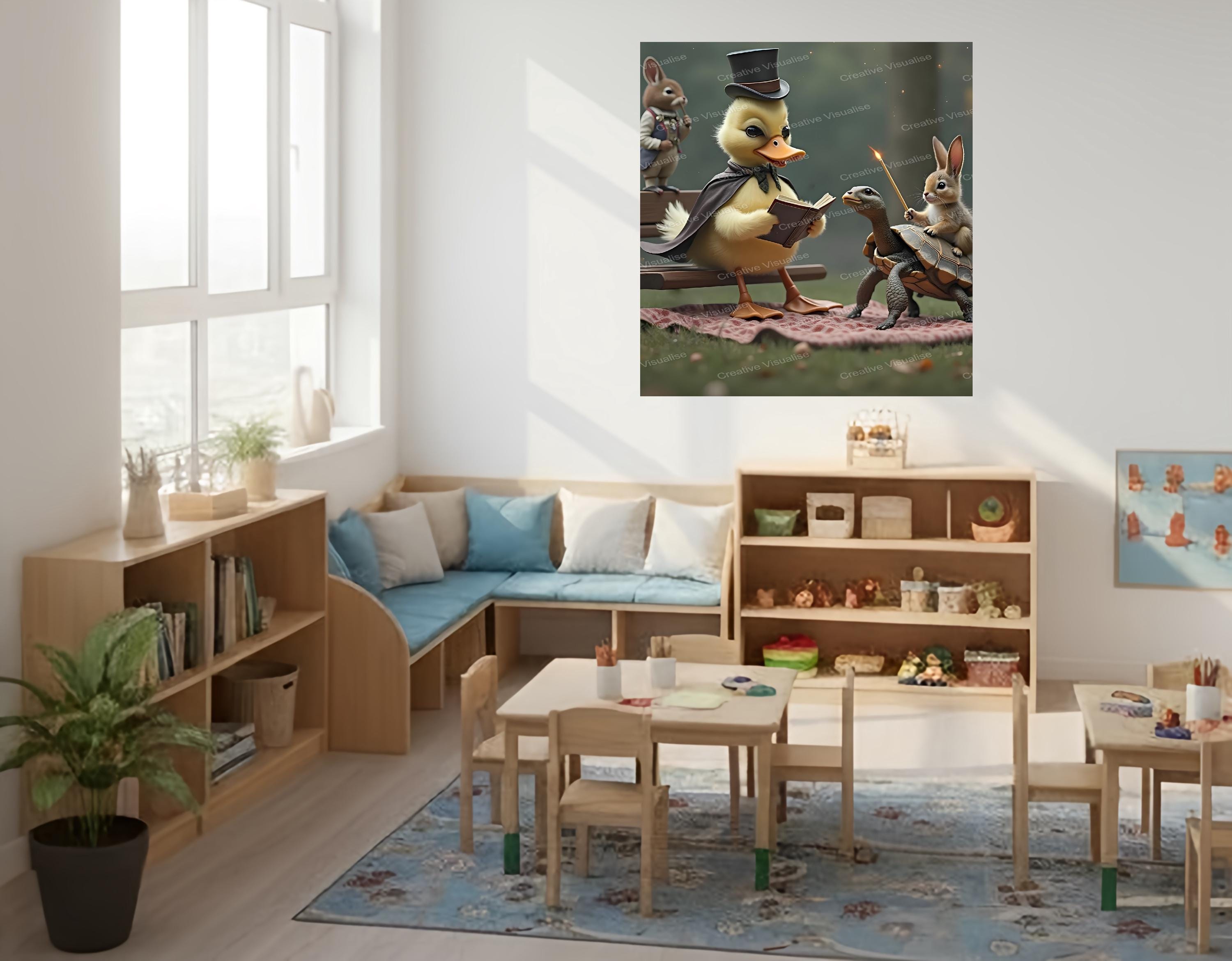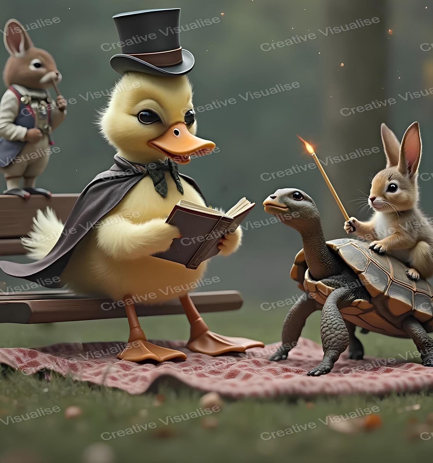 A fantasy digital printable photo of a duck reading a storybook for friends in the park that can be easily downloaded and printed (not a physical item for delivery). The details of the digitally received image are about 11000 × 16000 pixels, 300 DPI, JPEG and PDF formats, AI artwork, very high resolution without a watermark, and large enough for professional posters, canvas prints, and wall decor. Please send me a message if you need another file format after the original files' delivery. This price is for personal use! For commercial use, please send me a message.