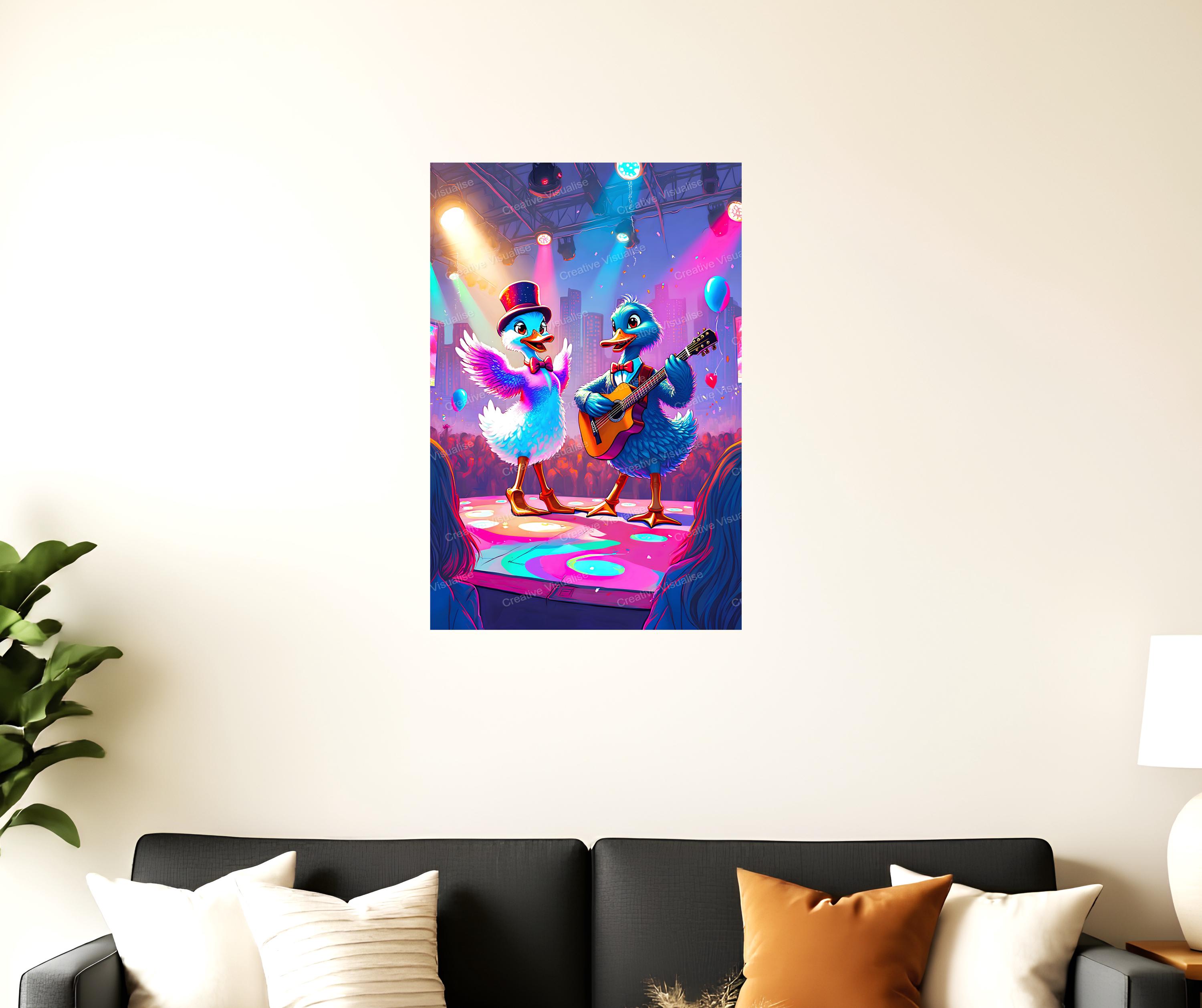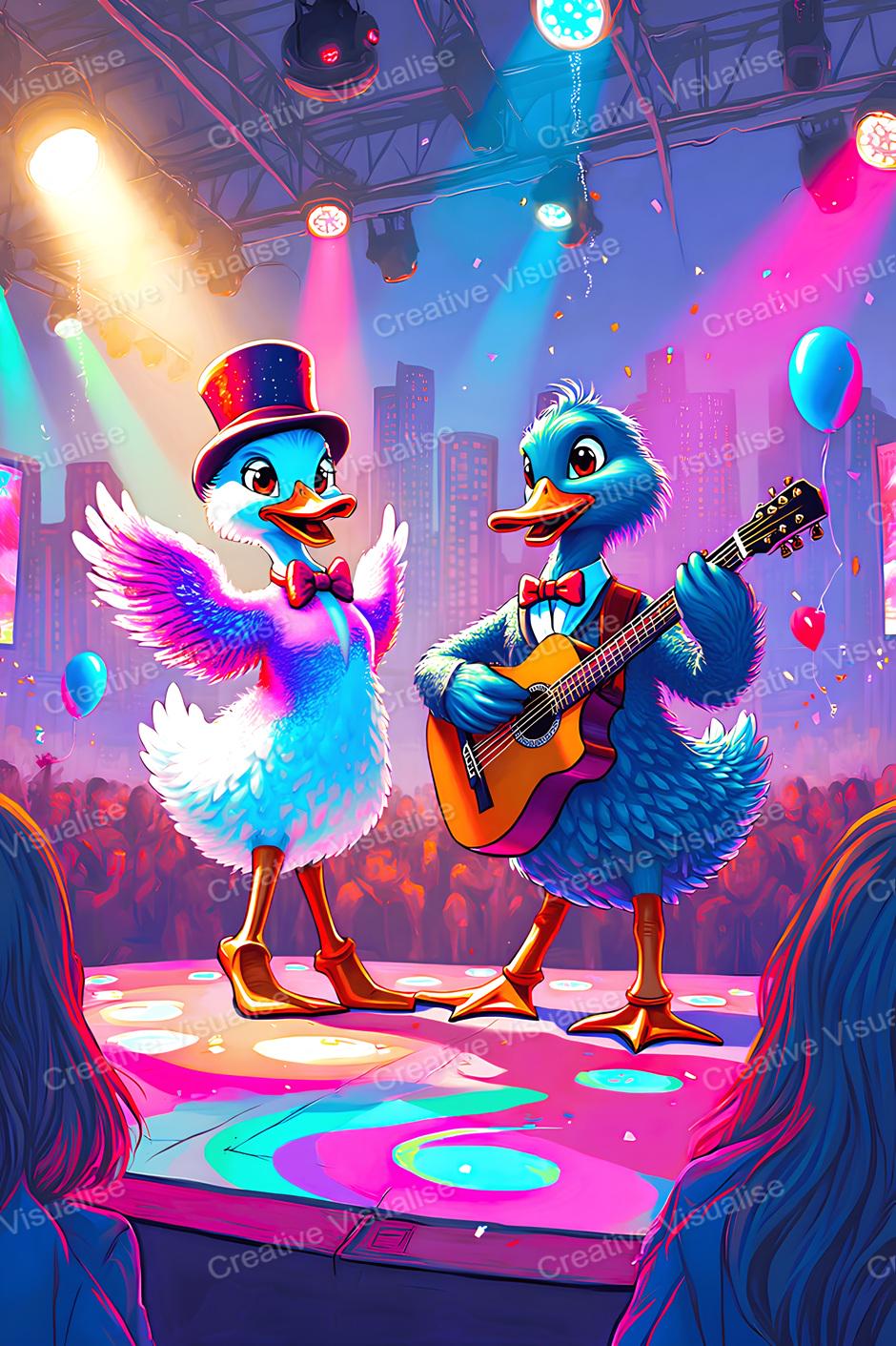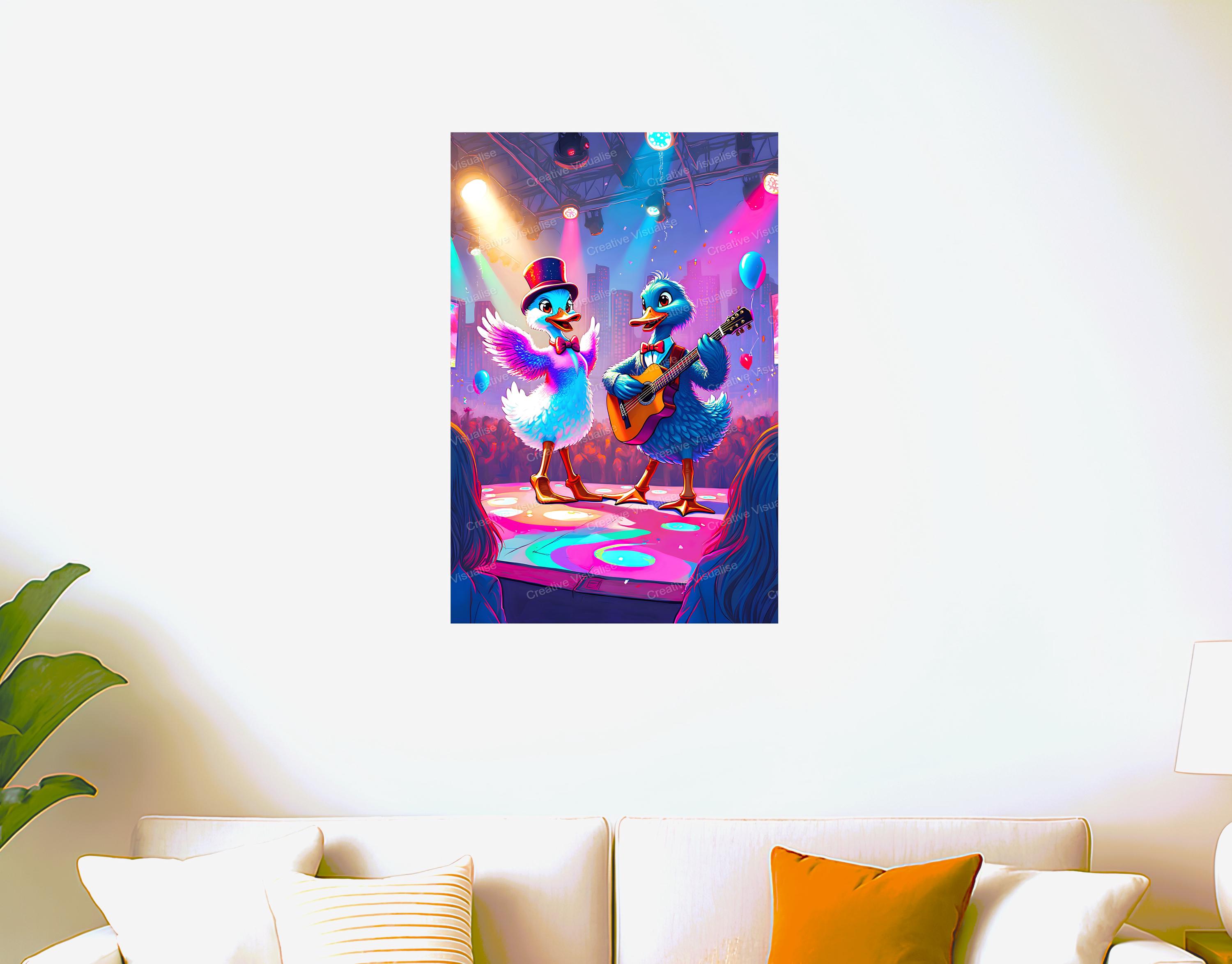 A fantasy digital printable photo of ducks playing guitar and dancing that can be easily downloaded and printed. It is large enough for professional posters, canvas prints, and wall decor. The sizes of received digital files: 1. PNG file, 4700×7000 pixels 2. PDF file, 16×20 (8×10 and 4×6) inches 3. PDF file, 18×24 (12×16 and 6×8) inches 4. PDF file, A2 (16.5×23.4 inches) 5. PDF file, 16×16 inches All files are high-resolution 300 DPI professional quality, ensuring crisp and clear prints at every size. For commercial use, please send me a message.