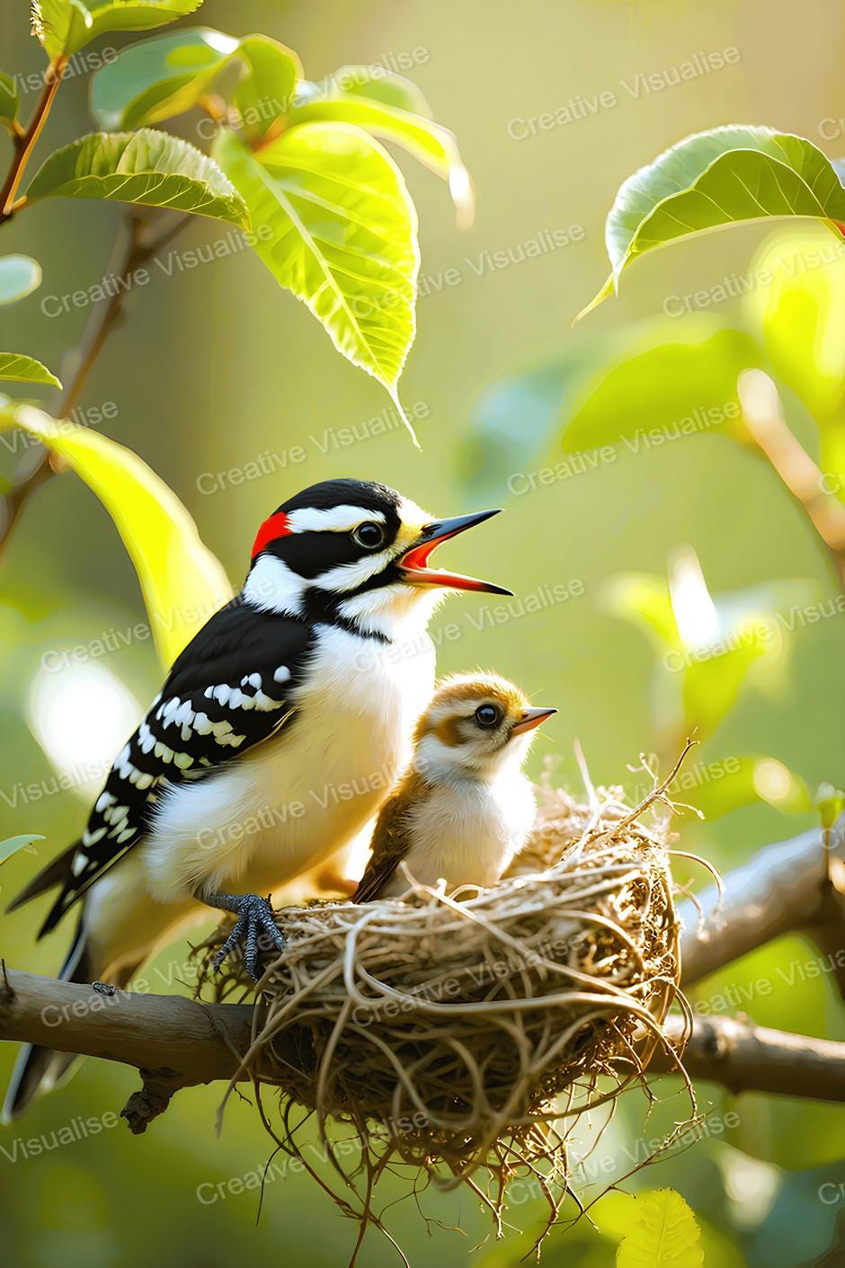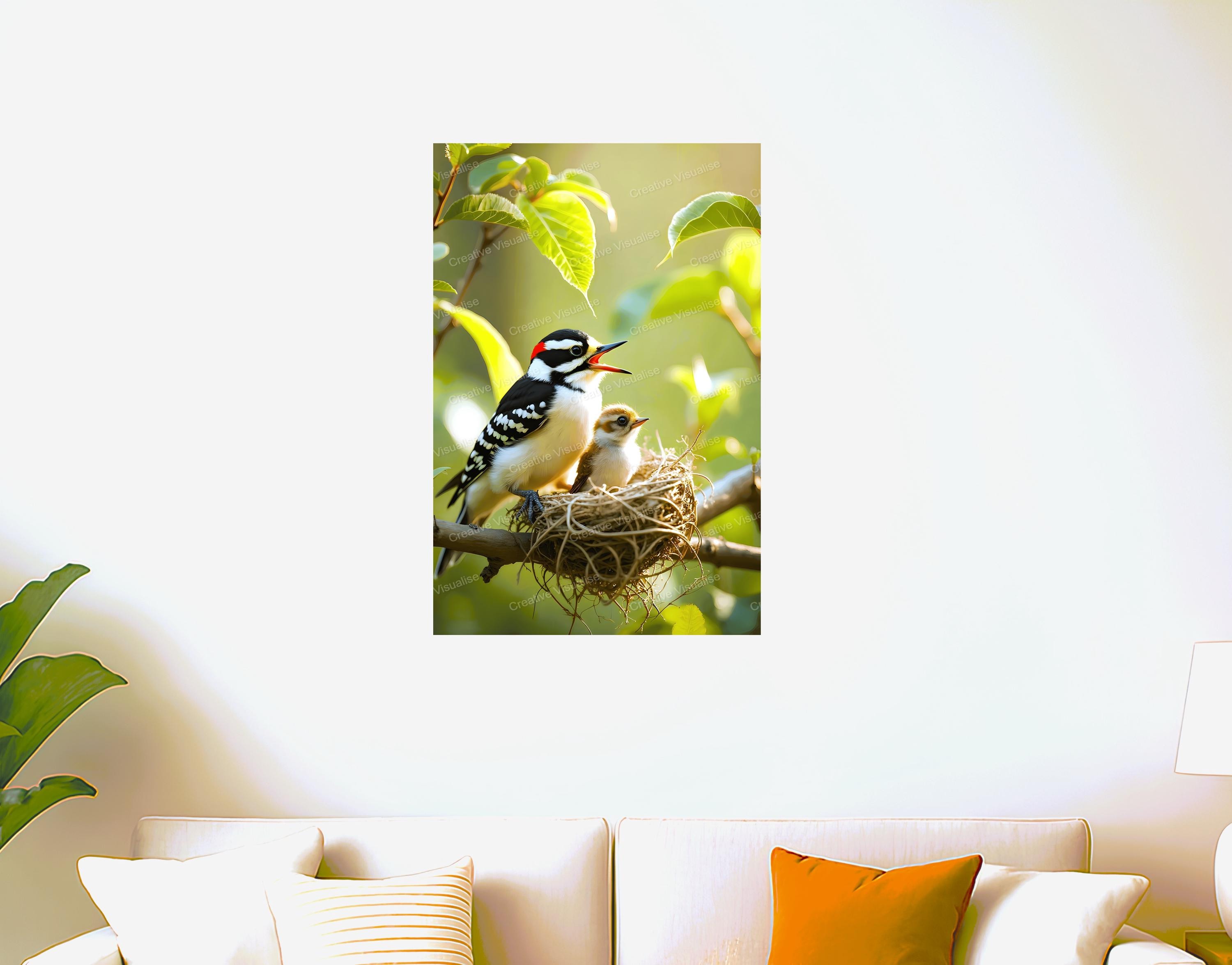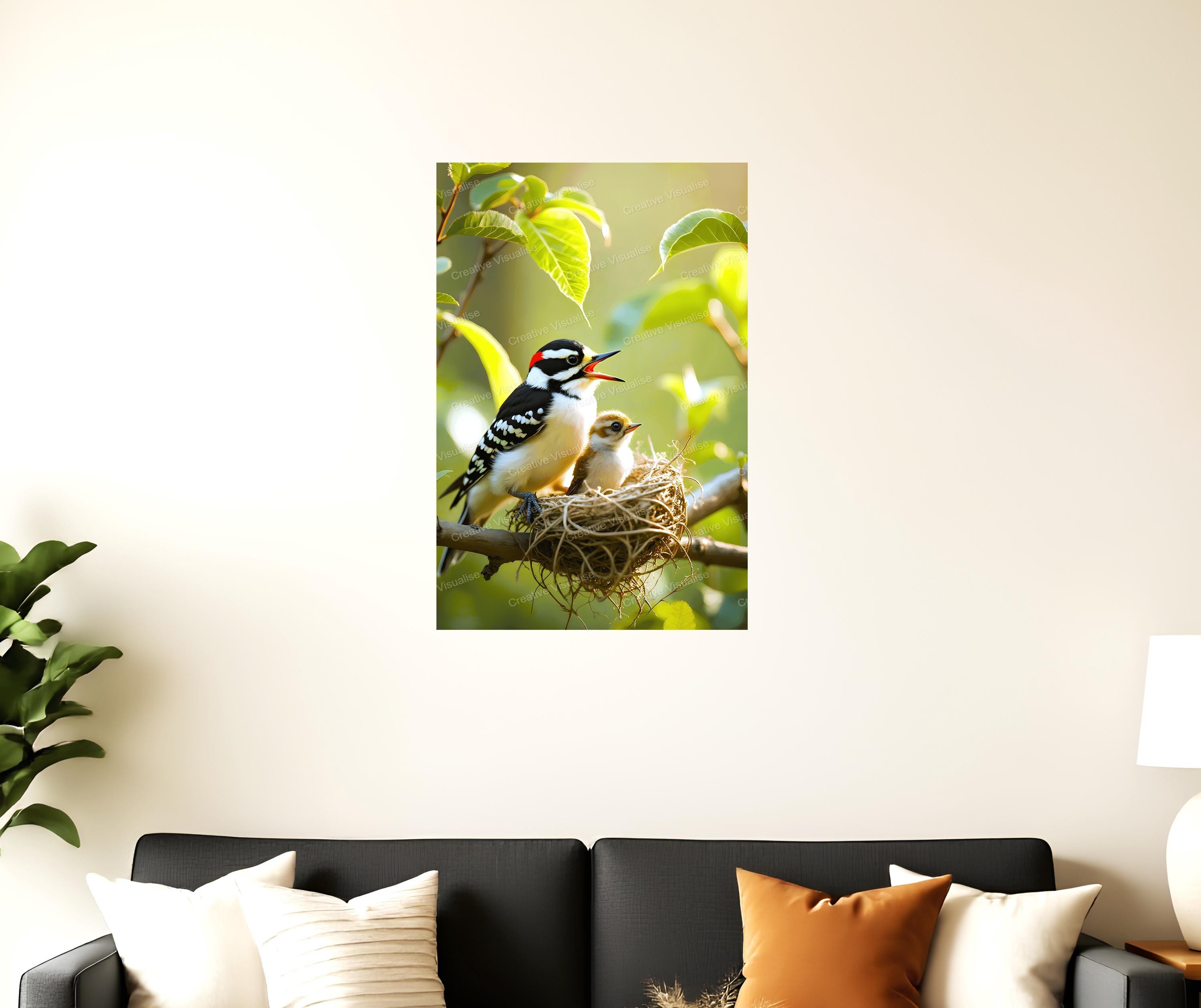 A digital photo of a bird and fledgling in a nest that can be easily downloaded and printed. It is large enough for professional posters, canvas prints, and wall decor. The sizes of received digital files: 1. PNG file, 4700×7000 pixels 2. PDF file, 16×20 (8×10 and 4×6) inches 3. PDF file, 18×24 (12×16 and 6×8) inches 4. PDF file, A2 (16.5×23.4 inches) 5. PDF file, 16×16 inches All files are high-resolution 300 DPI professional quality, ensuring crisp and clear prints at every size. For commercial use, please send me a message.