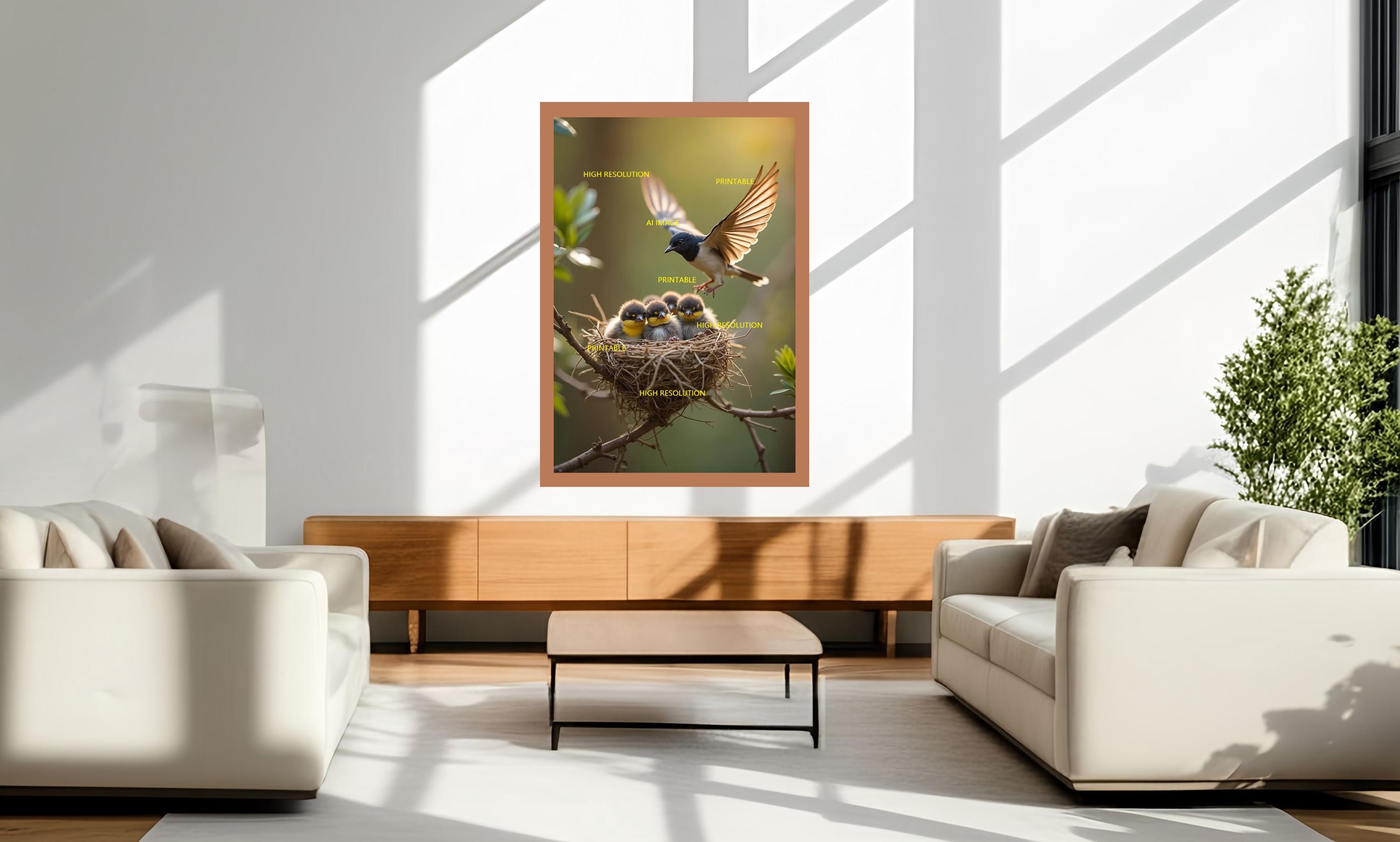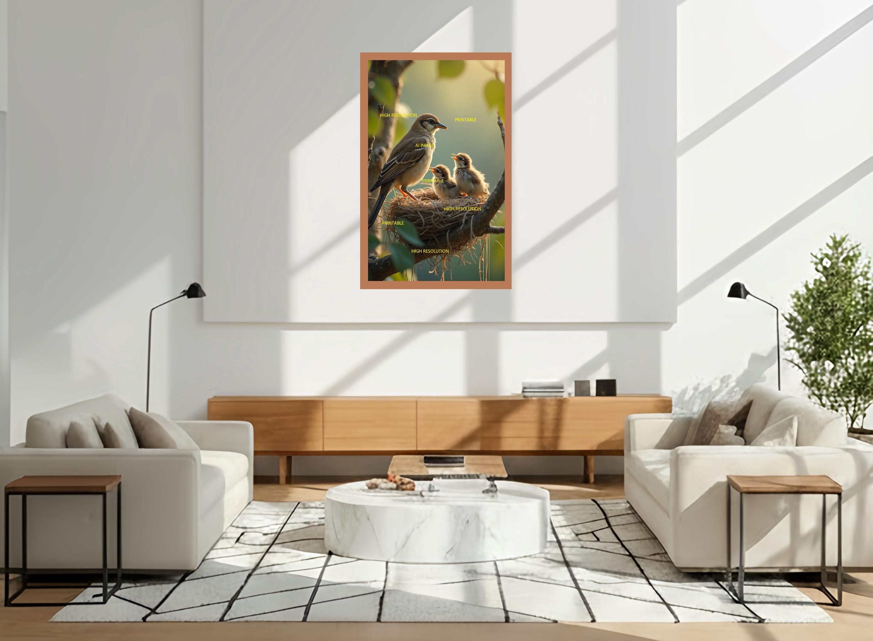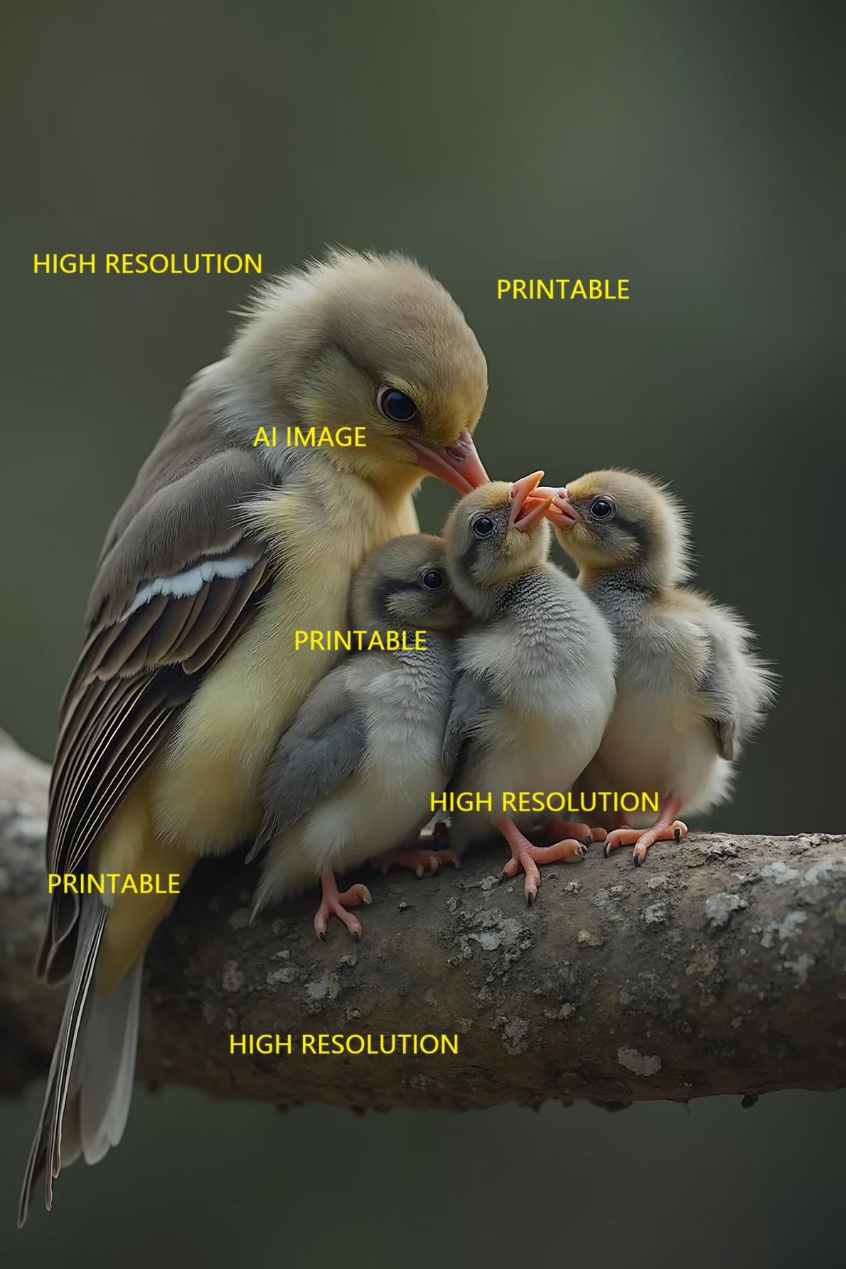 5 digital photos about birds with their fledglings that can be easily downloaded and printed (not a physical item for delivery). The details of the digitally received images are about 5000 × 8000 pixels, 300 DPI, AI artwork, very high resolution without a watermark, and large enough for professional posters, canvas prints, and wall decor. This price is for personal use, not for commercial use!