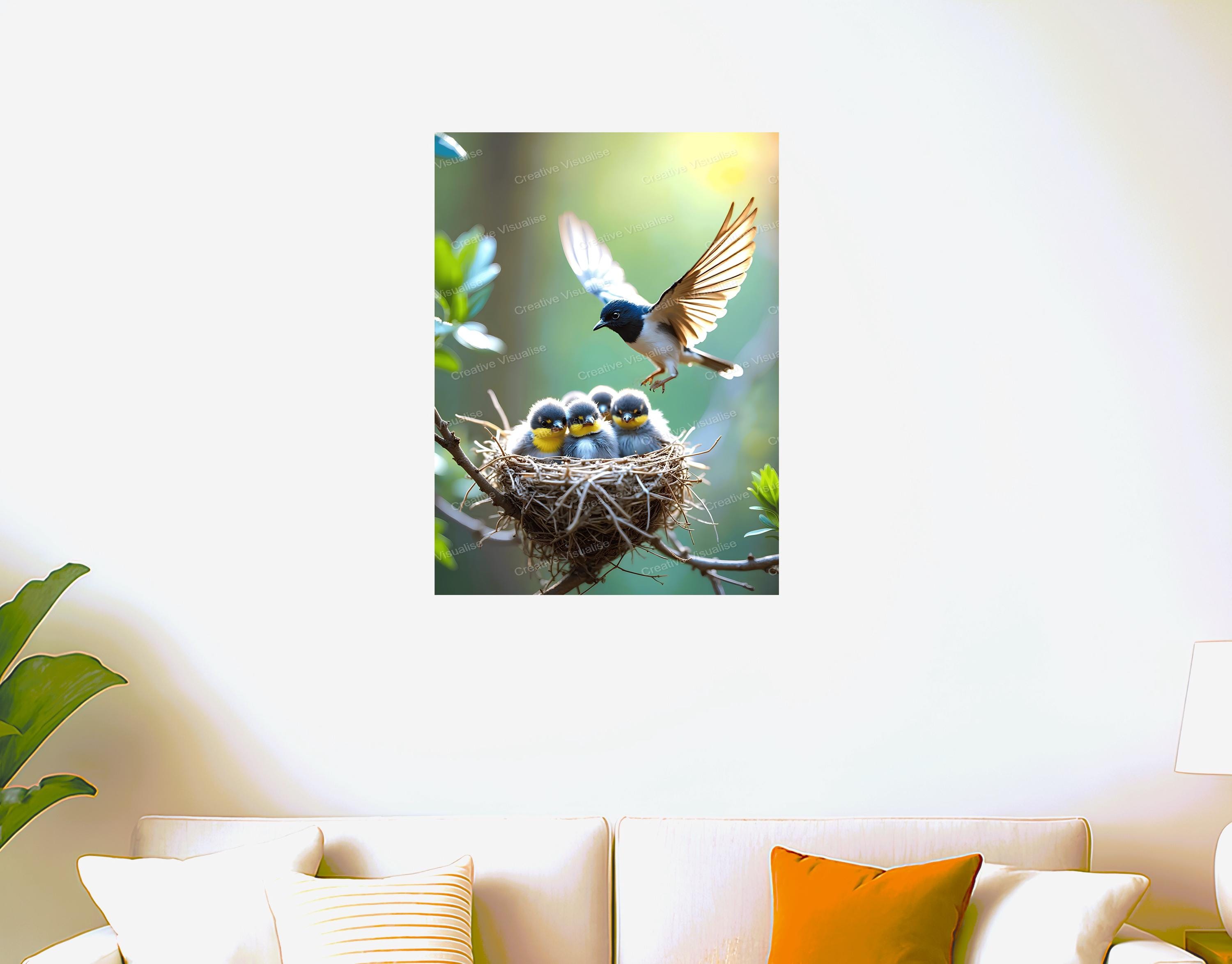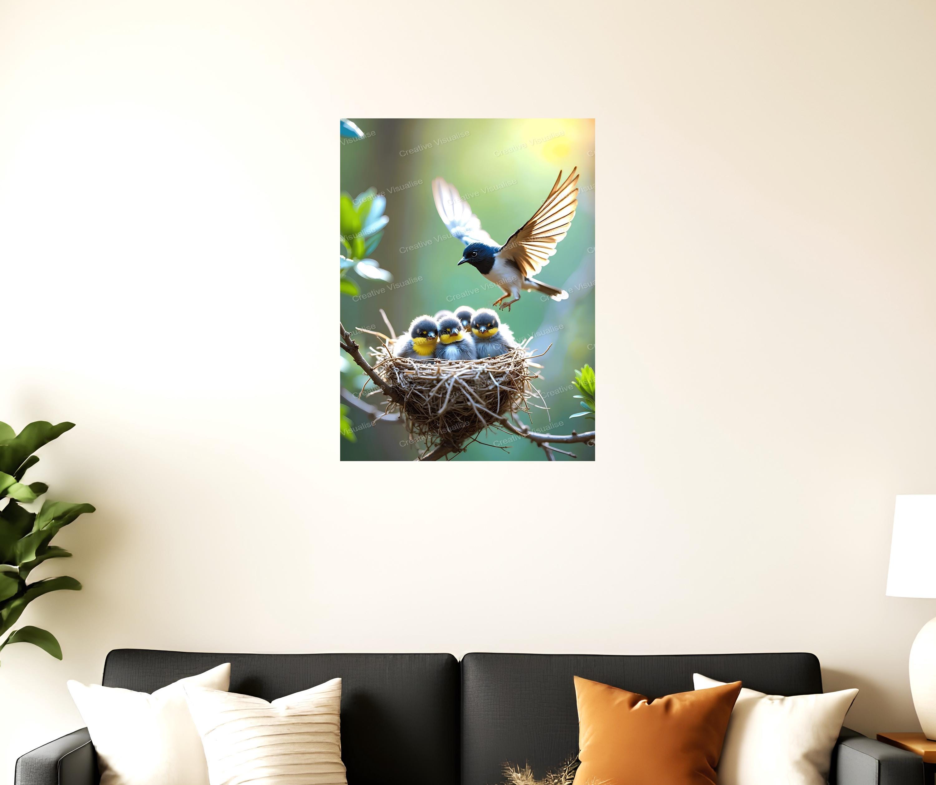 Bird Flying Above Fledglings in Nest Printable Wall Art, Digital PNG PDF 300 DPI