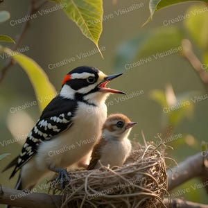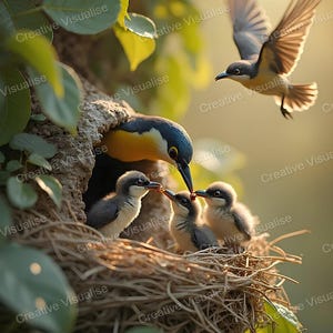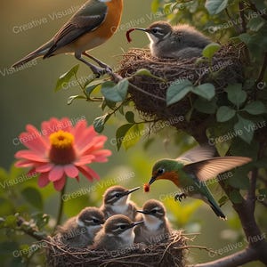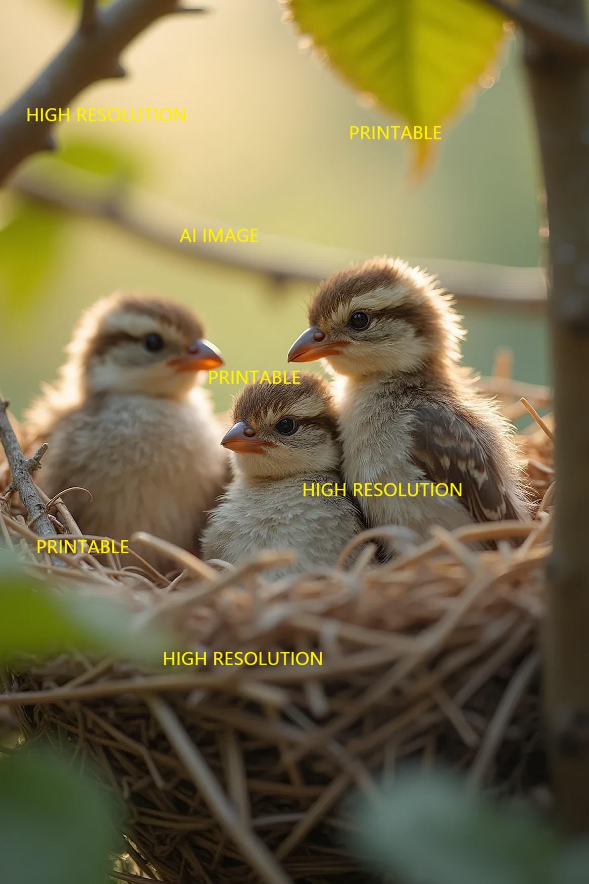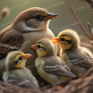 Digital photo of fledglings that can be easily downloaded and printed (not a physical item for delivery). The details of the digitally received image are about 5000 × 8000 pixels, 300 DPI, AI artwork, very high resolution without a watermark, and large enough for professional posters, canvas prints, and wall decor. This price is for personal use, not for commercial use!