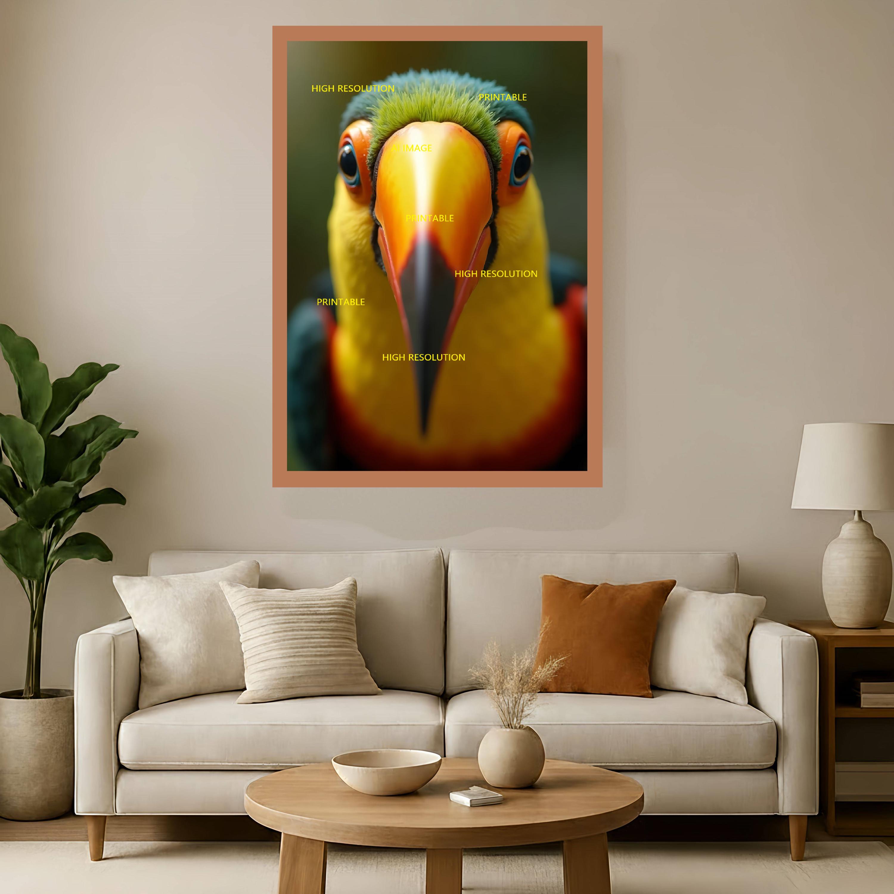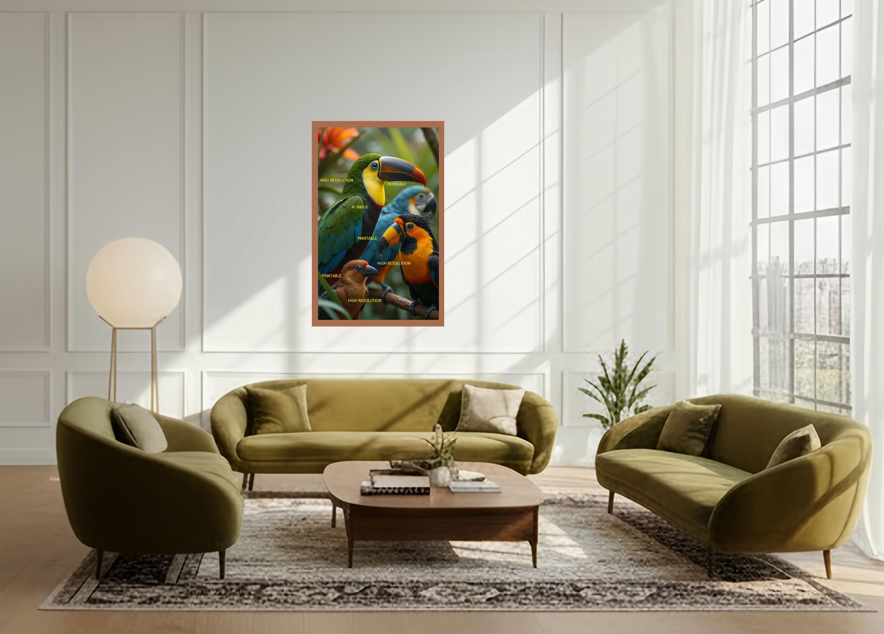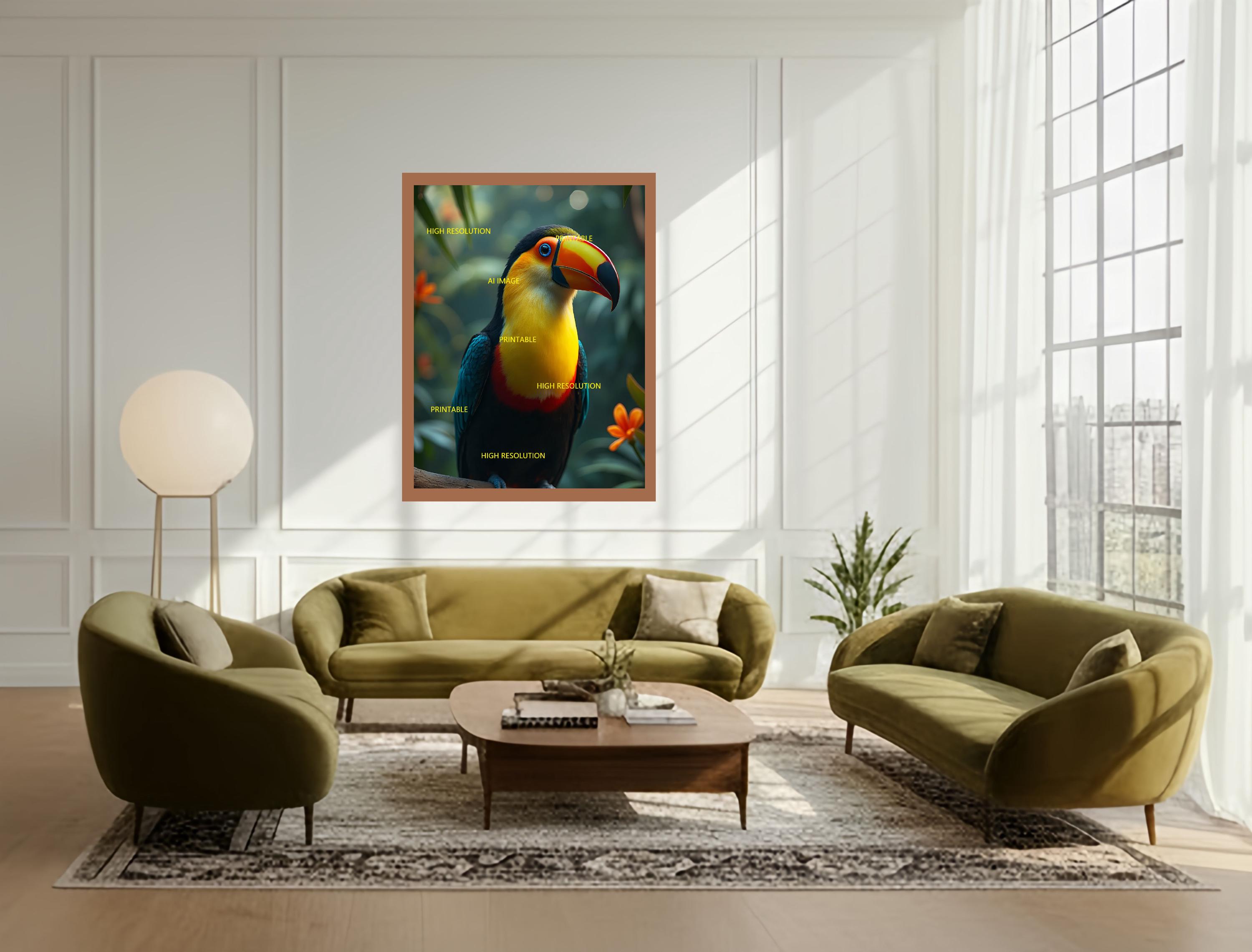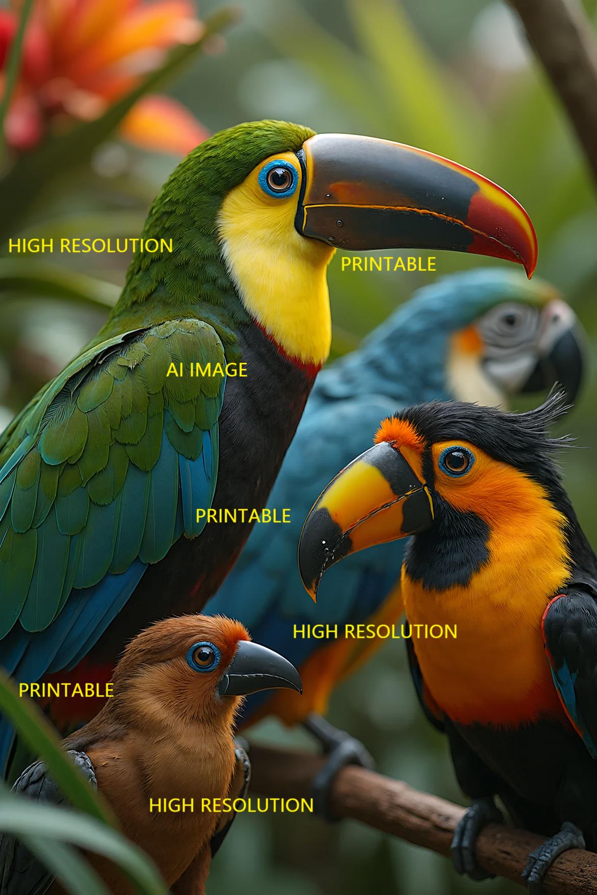 5 digital photos of toucan birds that can be easily downloaded and printed (not a physical item for delivery). The details of the digitally received images are about 5000 × 8000 pixels, 300 DPI, AI artwork, very high resolution without a watermark, and large enough for professional posters, canvas prints, and wall decor. This price is for personal use, not for commercial use!