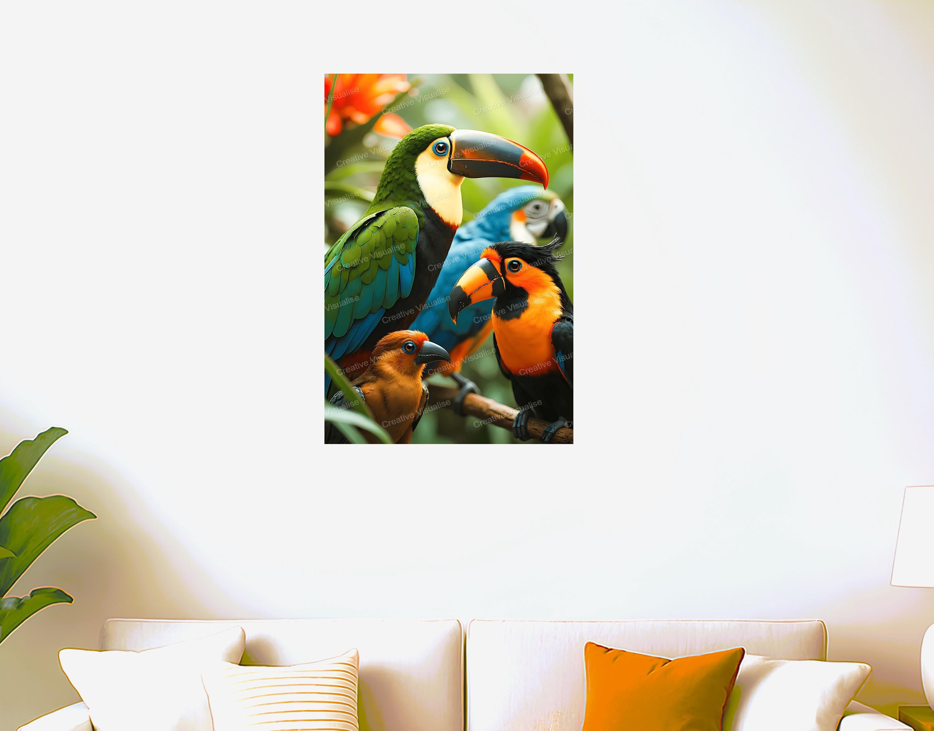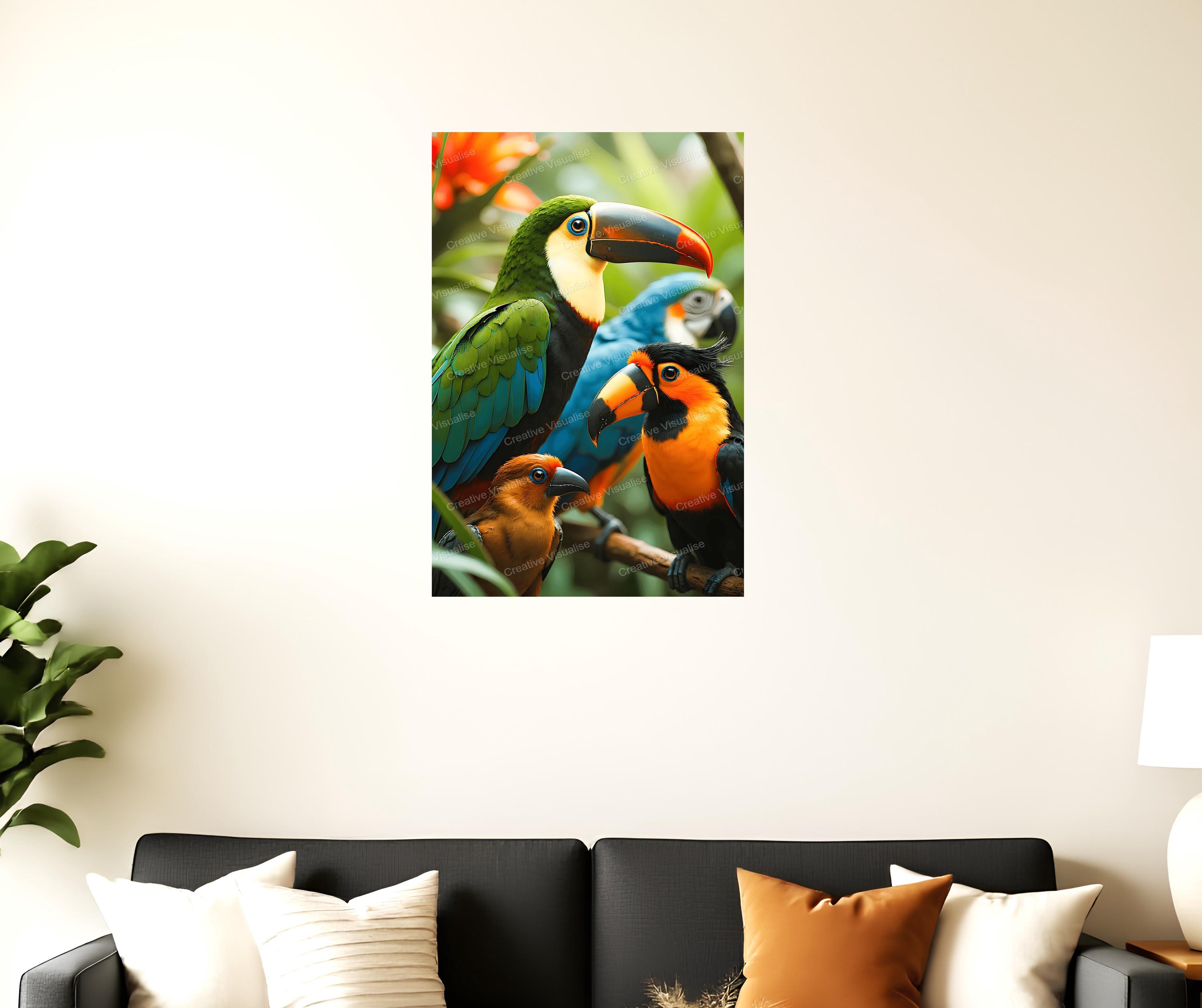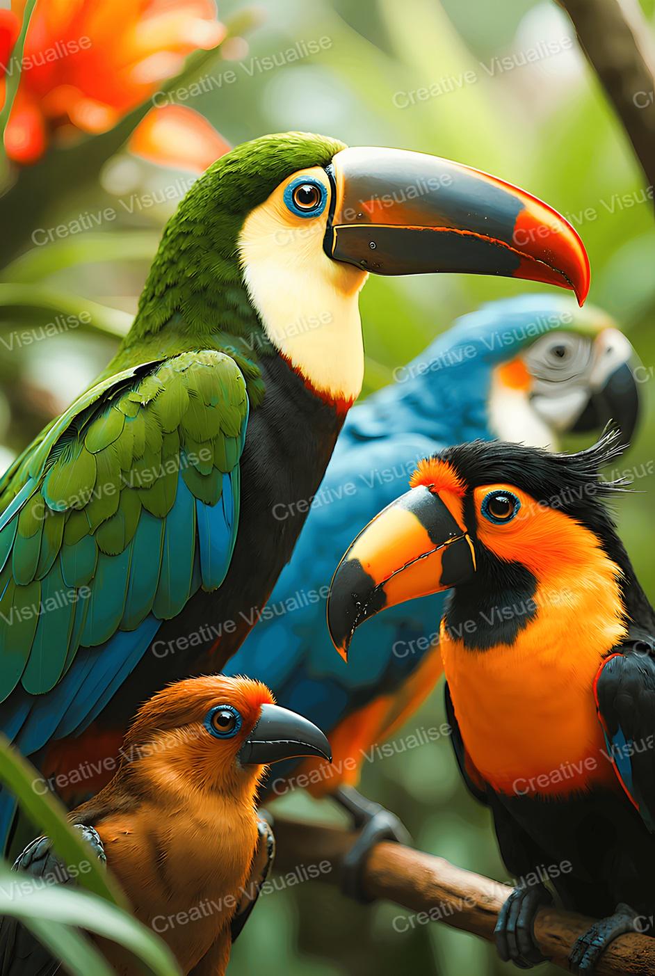 A digital photo of a toucan birds and parrot that can be easily downloaded and printed. It is large enough for professional posters, canvas prints, and wall decor. The sizes of received digital files: 1. PNG file, 4700×7000 pixels 2. PDF 4:5 ratio, 16×20 (8×10 and 4×5) inches 3. PDF 3:4 ratio, 18×24 (12×16 and 6×8) inches 4. PDF 2:3 ratio, 16×24 (12×18, 8×12, and 4×6) inches 5. PDF file, A2 (16.5×23.4 inches) All files are high-resolution 300 DPI professional quality, ensuring crisp and clear prints at every size. For commercial use, please send me a message.