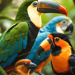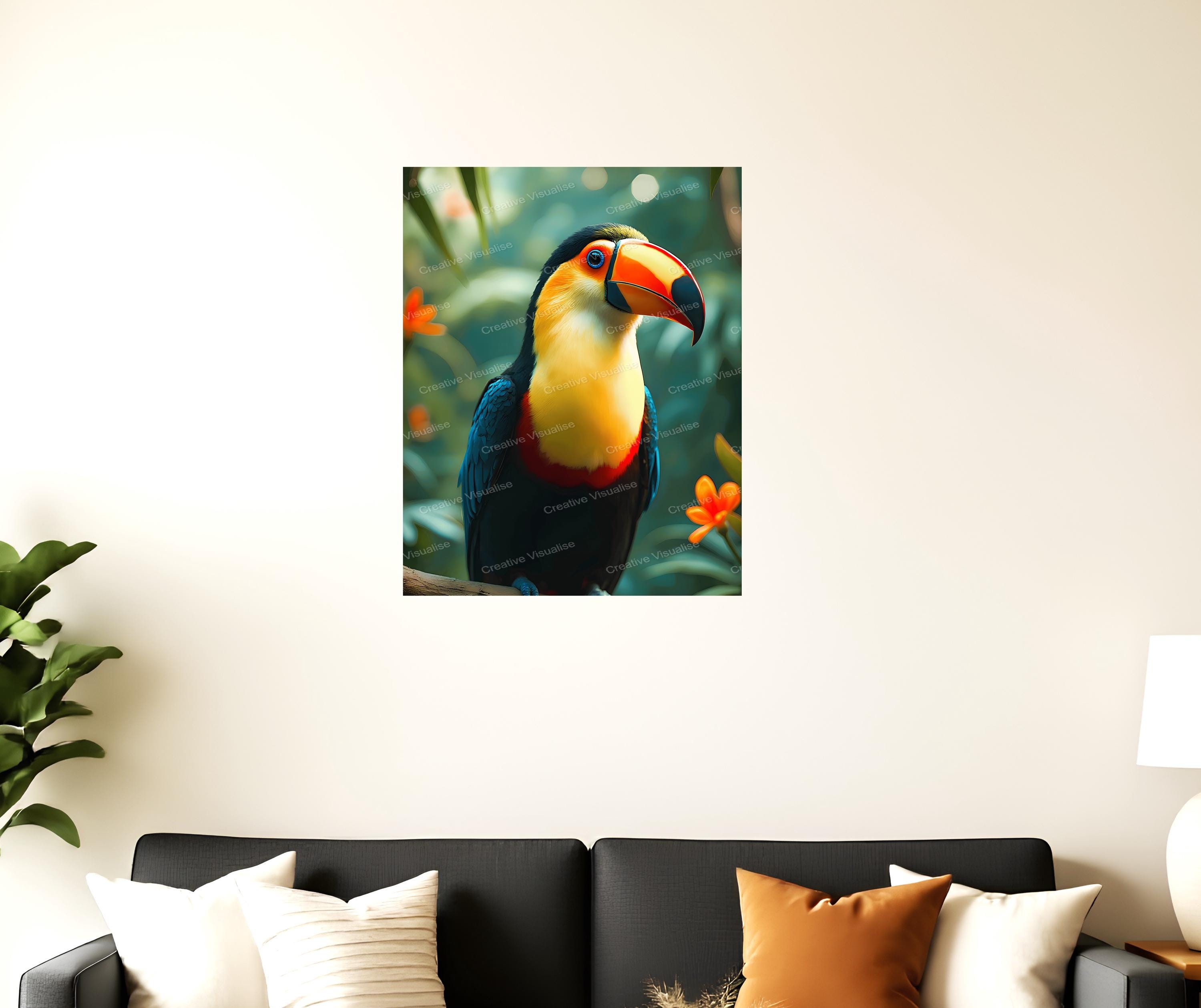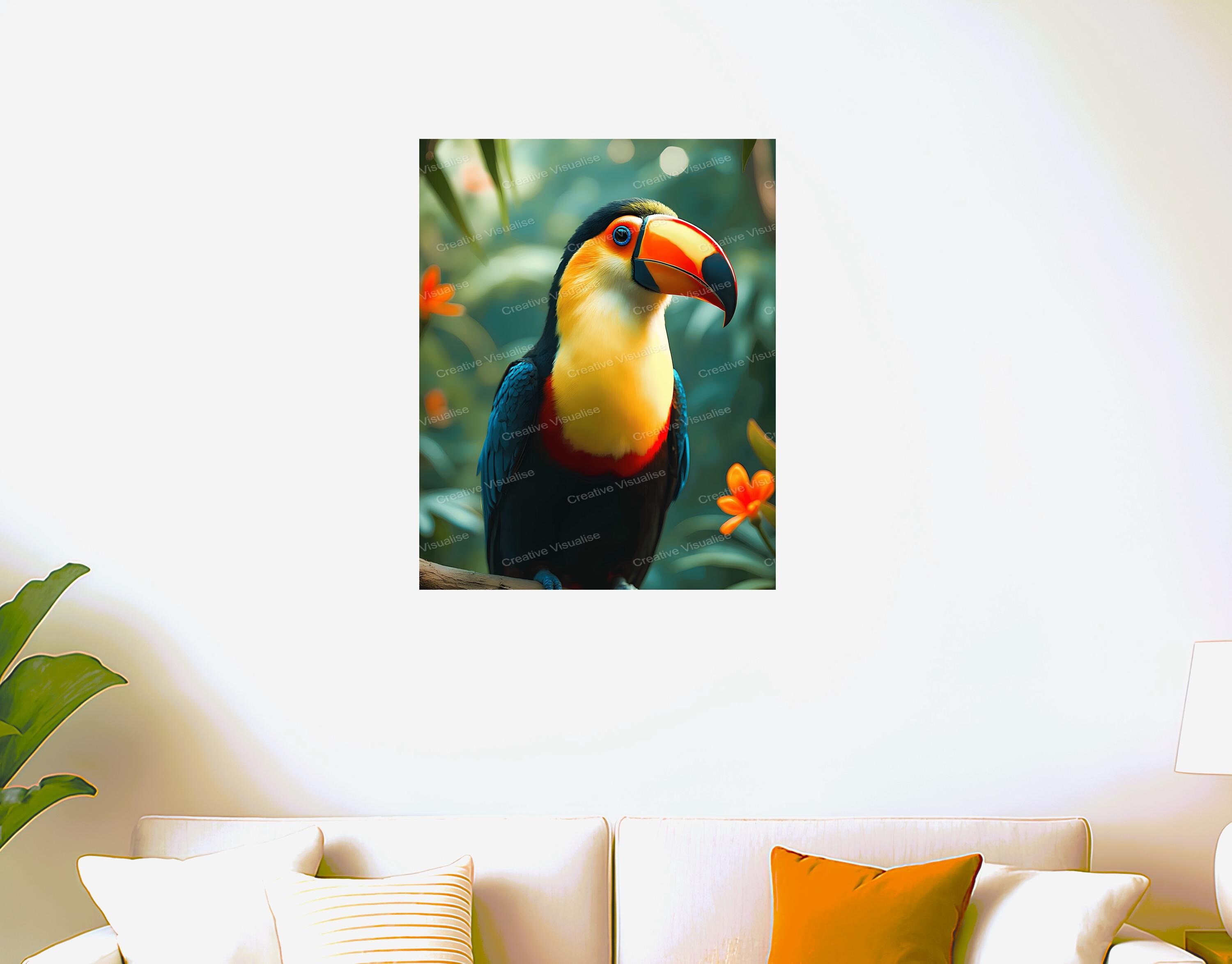 A digital photo of a toucan bird in flowers that can be easily downloaded and printed. It is large enough for professional posters, canvas prints, and wall decor. The sizes of received digital files: 1. PNG file, 4700×7000 pixels 2. PDF 4:5 ratio, 16×20 (8×10 and 4×5) inches 3. PDF 3:4 ratio, 18×24 (12×16 and 6×8) inches 4. PDF 2:3 ratio, 16×24 (12×18, 8×12, and 4×6) inches 5. PDF file, A2 (16.5×23.4 inches) All files are high-resolution 300 DPI professional quality, ensuring crisp and clear prints at every size. For commercial use, please send me a message.