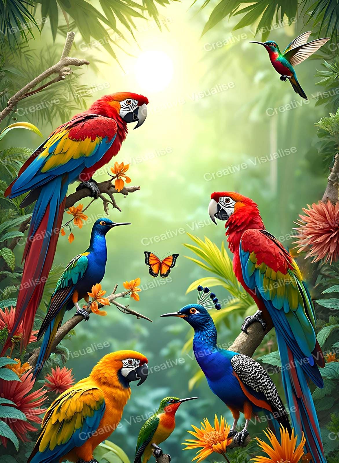Set of 5 digital photos of beautiful exotic birds that can be easily downloaded and printed (not a physical item for delivery). The details of the digitally received image are about 11000 × 16000 pixels, 300 DPI, JPEG and PDF formats, AI artwork, very high resolution without a watermark, and large enough for professional posters, canvas prints, and wall decor. Please send me a message if you need another file format after the original files' delivery. This price is for personal use! For commercial use, please send me a message.