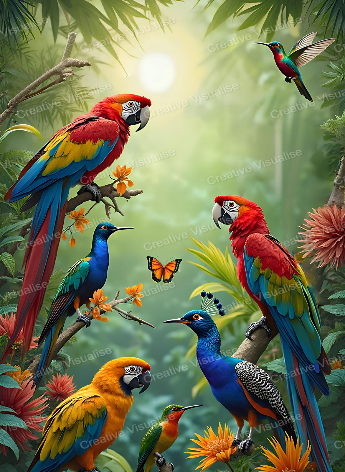 A digital photo of parrots, macaws, and hummingbirds that can be easily downloaded and printed (not a physical item for delivery). The details of the digitally received image are about 11000 × 16000 pixels, 300 DPI, JPEG and PDF formats, AI artwork, very high resolution without a watermark, and large enough for professional posters, canvas prints, and wall decor. Please send me a message if you need another file format after the original files' delivery. This price is for personal use! For commercial use, please send me a message.