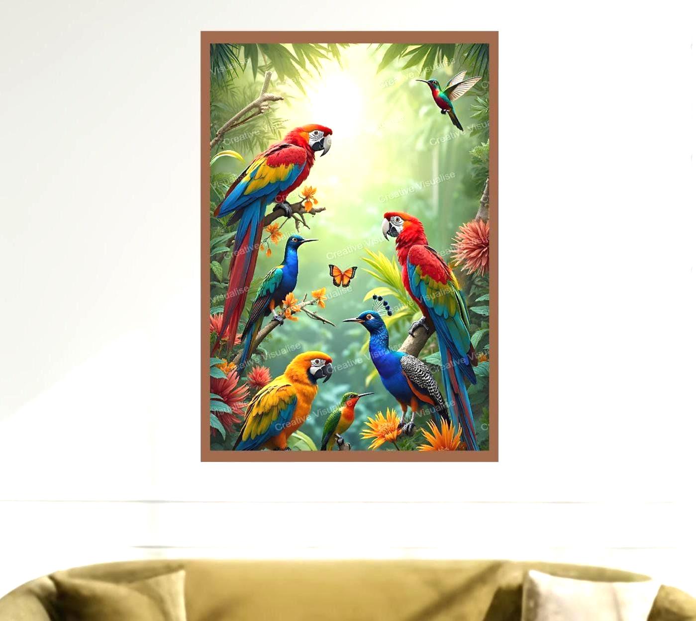 A digital photo of parrots, macaws, and hummingbirds that can be easily downloaded and printed (not a physical item for delivery). The details of the digitally received image are about 11000 × 16000 pixels, 300 DPI, JPEG and PDF formats, AI artwork, very high resolution without a watermark, and large enough for professional posters, canvas prints, and wall decor. Please send me a message if you need another file format after the original files' delivery. This price is for personal use! For commercial use, please send me a message.