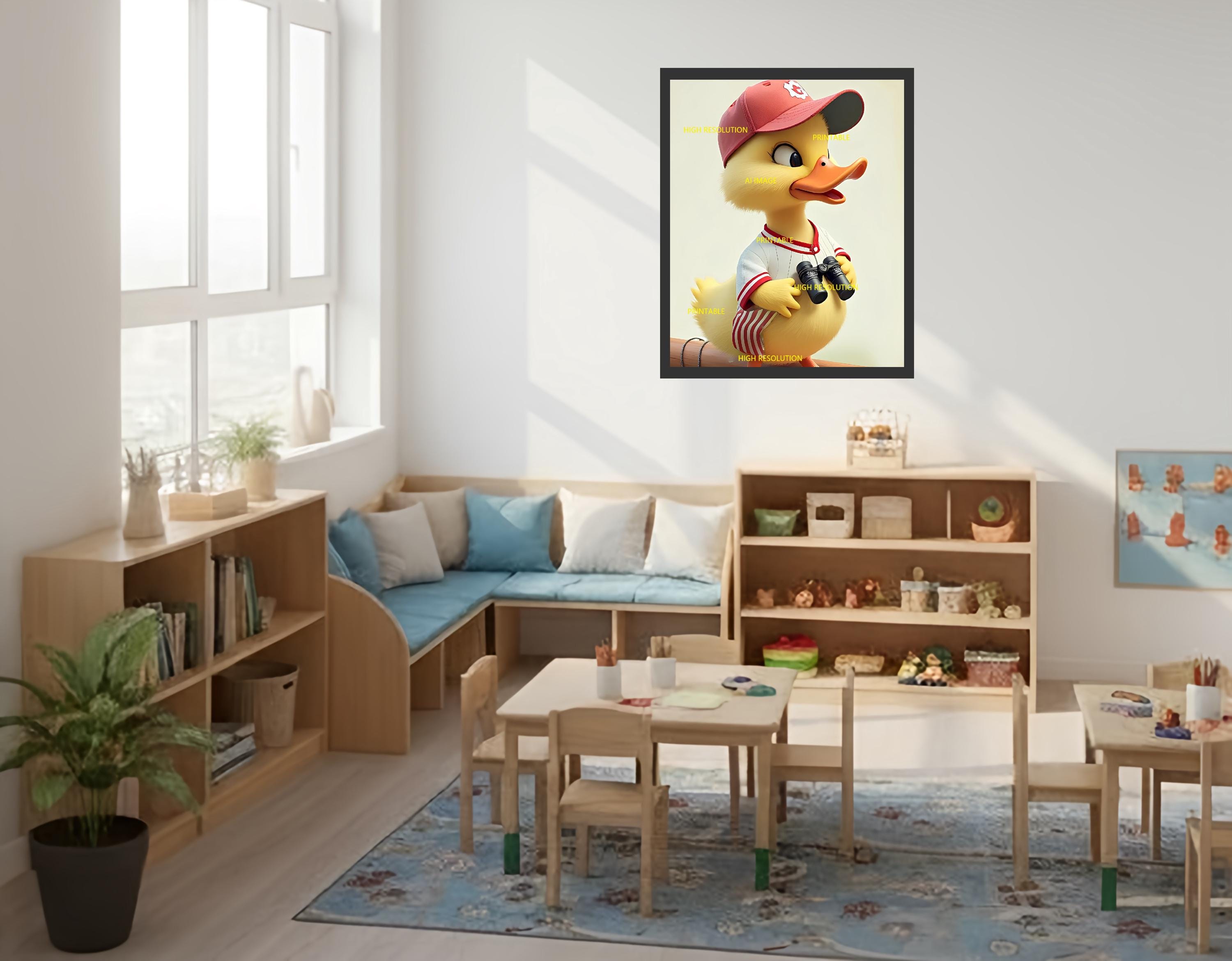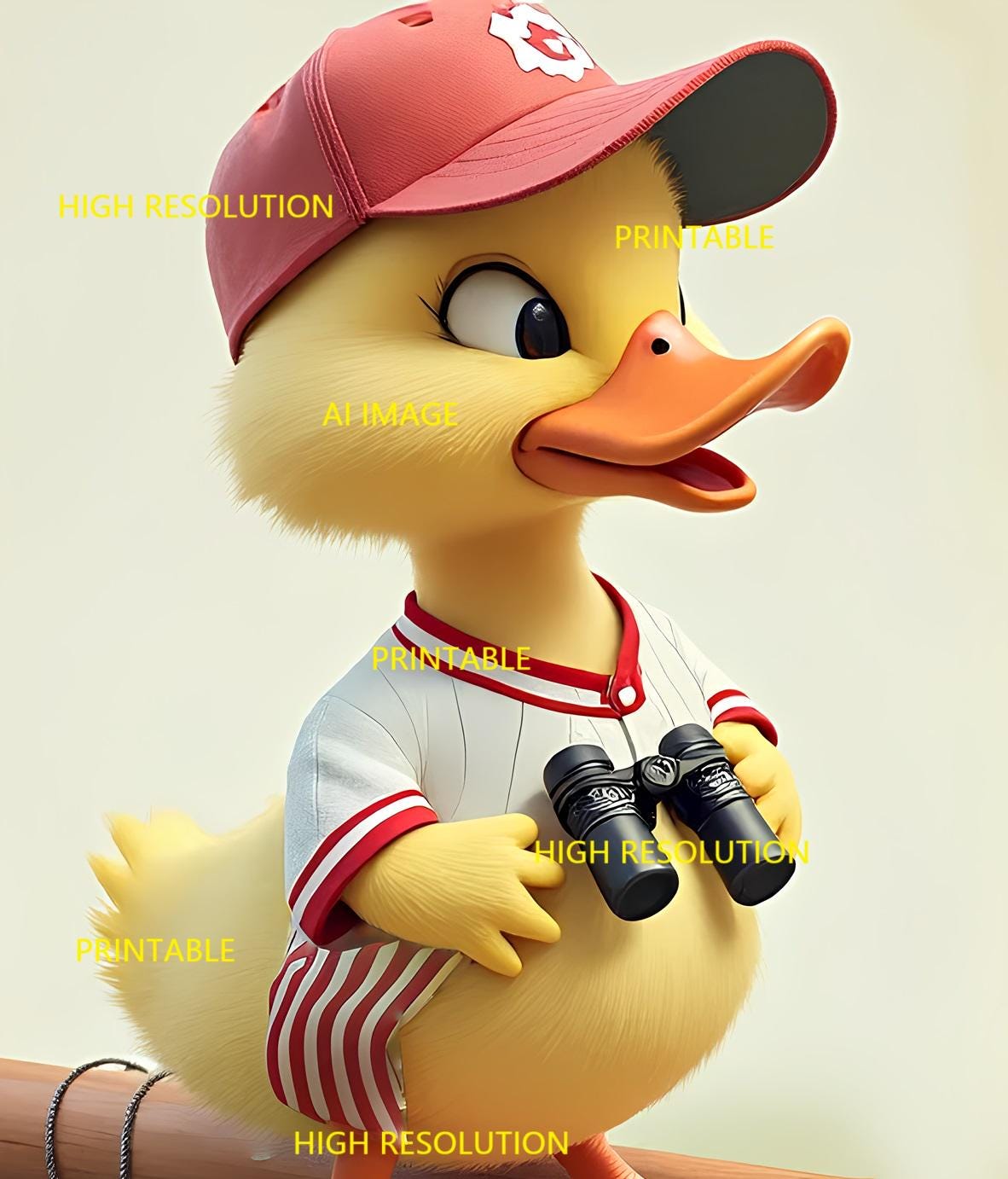 Digital photo of a baseball duck, yay sports quack, that can be easily downloaded and printed (not a physical item for delivery). The details of the digitally received image are about 5000 × 8000 pixels, 300 DPI, AI artwork, very high resolution without a watermark, and large enough for professional posters, canvas prints, and wall decor. This price is for personal use, not for commercial use!