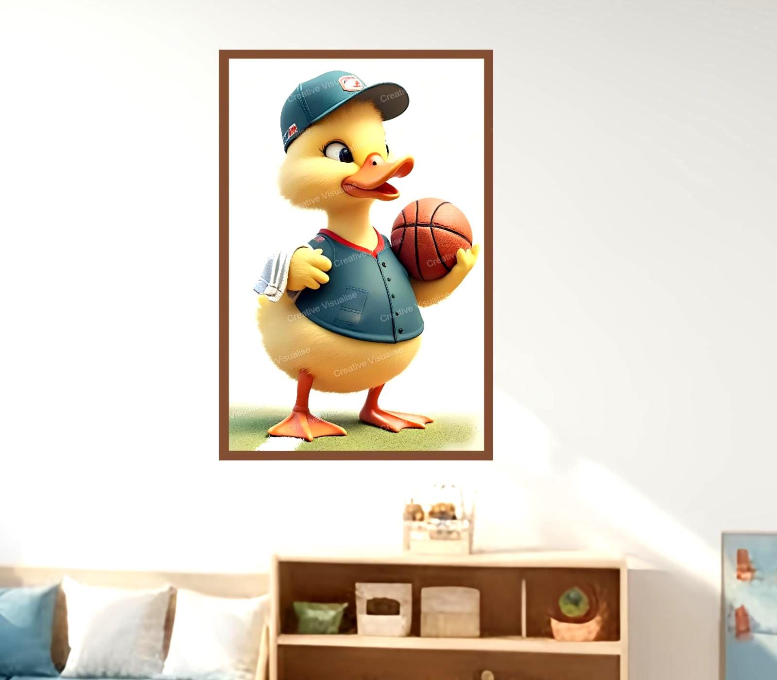 Digital photo of cute basketball duck that can be easily downloaded and printed (not a physical item for delivery). The details of the digitally received image are about 11000 × 16000 pixels, 300 DPI, JPEG and PDF formats, AI artwork, very high resolution without a watermark, and large enough for professional posters, canvas prints, and wall decor. Please send me a message if you need another file format after the original files' delivery. This price is for personal use! For commercial use, please send me a message.