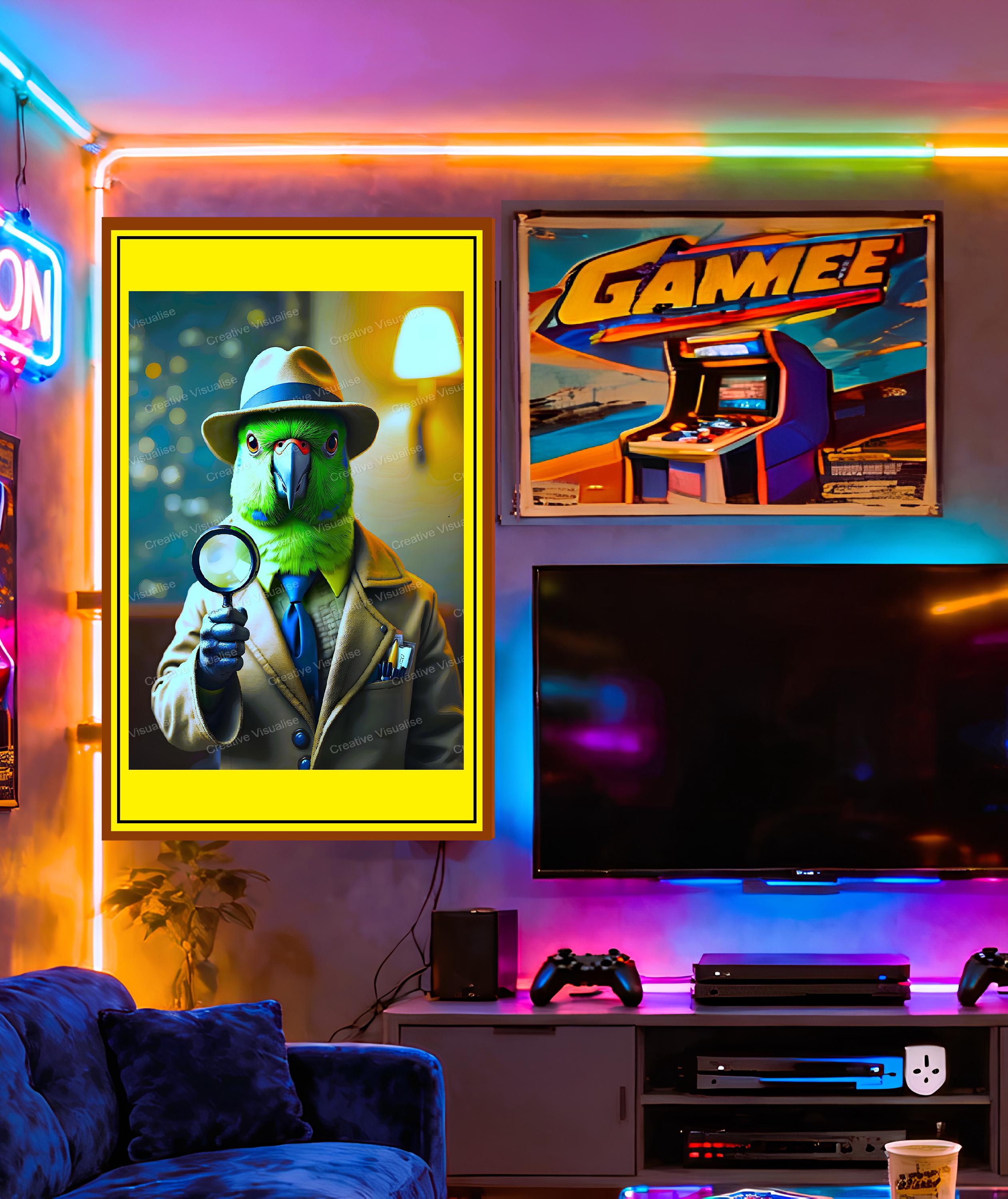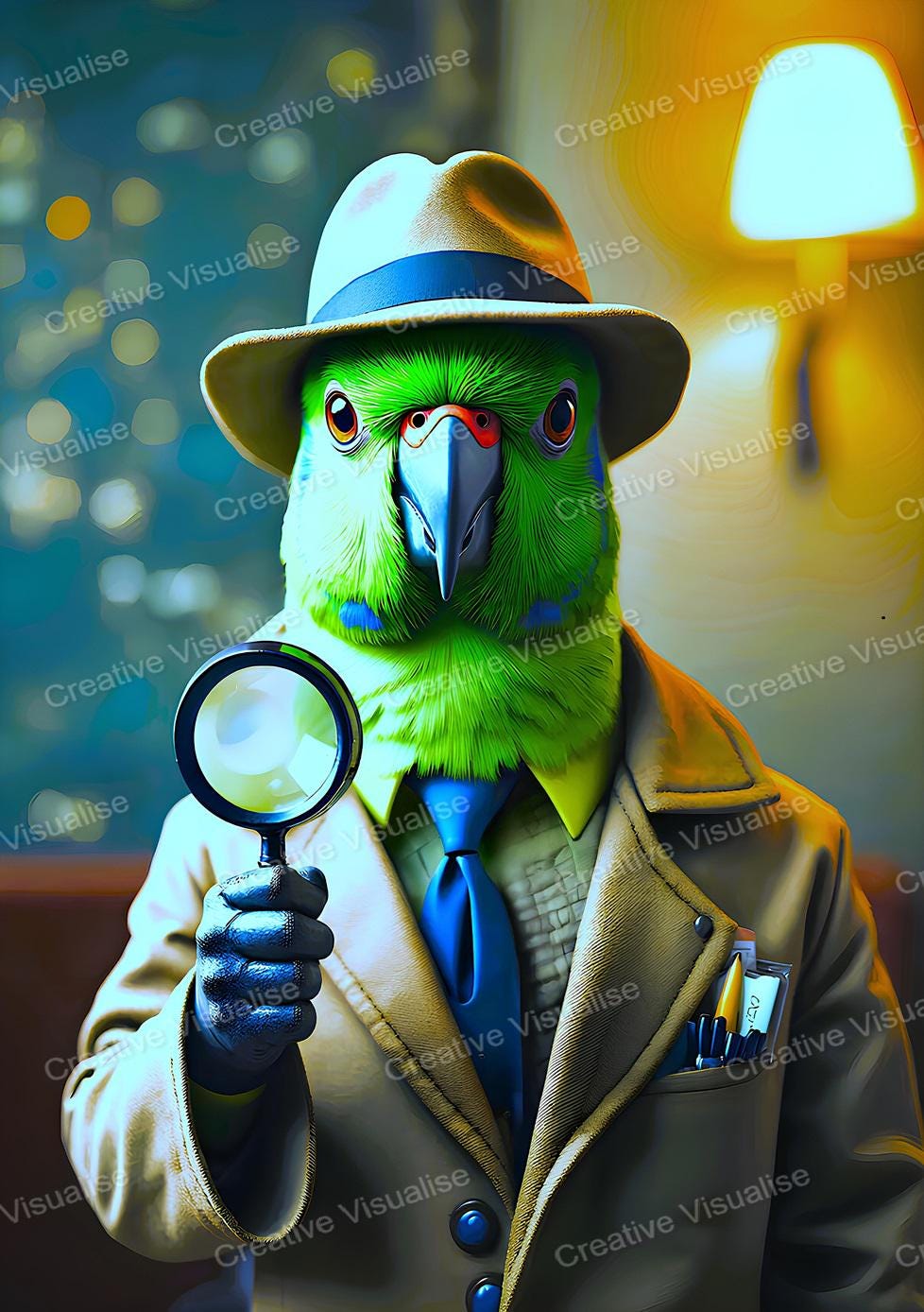 A digital photo of a parrot as an inspector that can be easily downloaded and printed. It is large enough for professional posters, canvas prints, and wall decor. The sizes of received digital files: 1. PNG file, 3600×5100 pixels 2. PDF 4:5 ratio, 8×10 and 4×5 inches 3. PDF 3:4 ratio, 12×16 and 6×8 inches 4. PDF 2:3 ratio, 12×18, 8×12, and 4×6 inches 5. PDF file, A3 (11.7×16.5) inches All files are high-resolution 300 DPI professional quality, ensuring crisp and clear prints at every size. For commercial use, please send me a message.