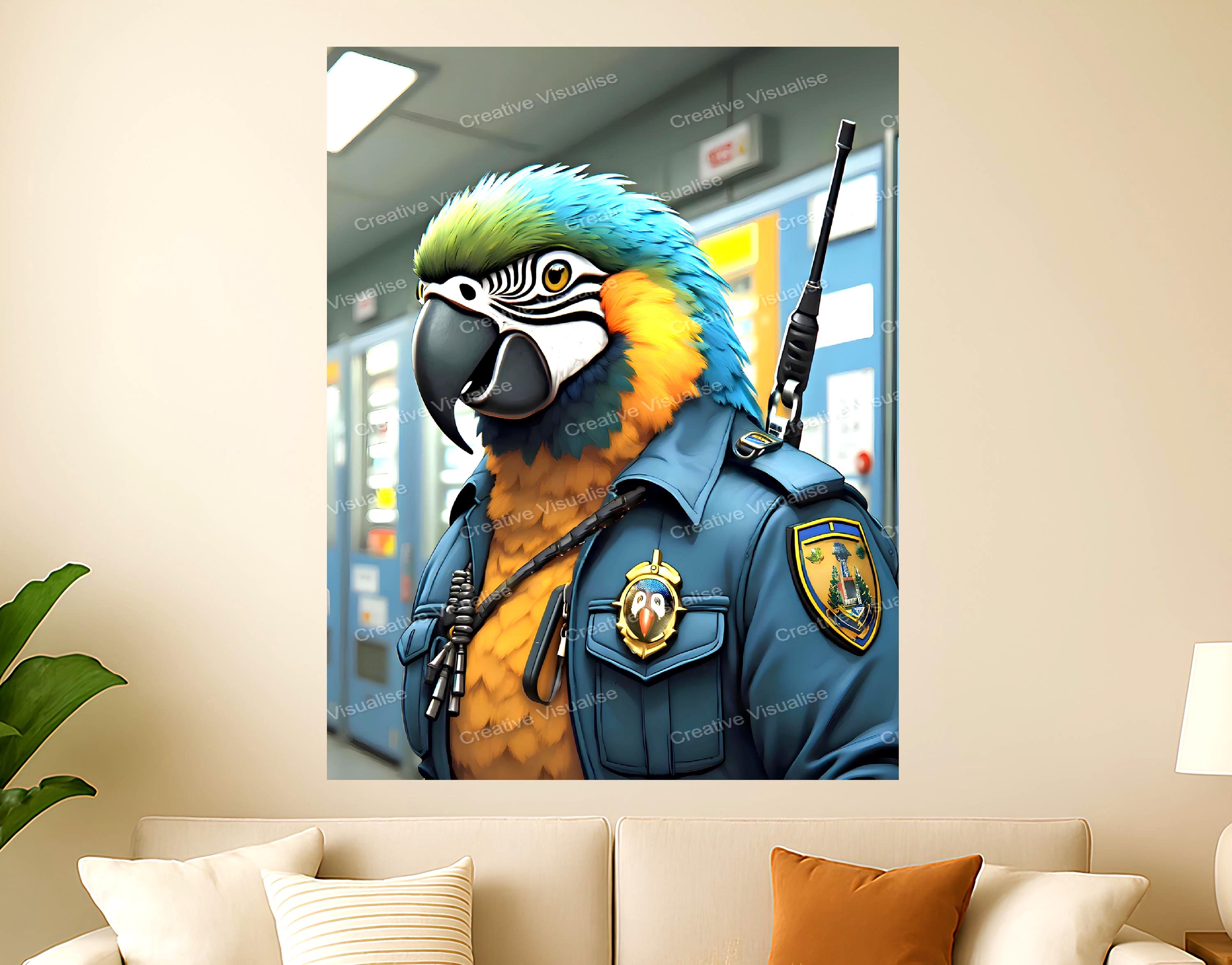 A digital photo of a macaw parrot as a security staff that can be easily downloaded and printed (not a physical item for delivery). The details of the digitally received image are about 11000 × 16000 pixels, 300 DPI, JPEG and PDF formats, AI artwork, very high resolution without a watermark, and large enough for professional posters, canvas prints, and wall decor. Please send me a message if you need another file format after the original files' delivery. This price is for personal use! For commercial use, please send me a message.