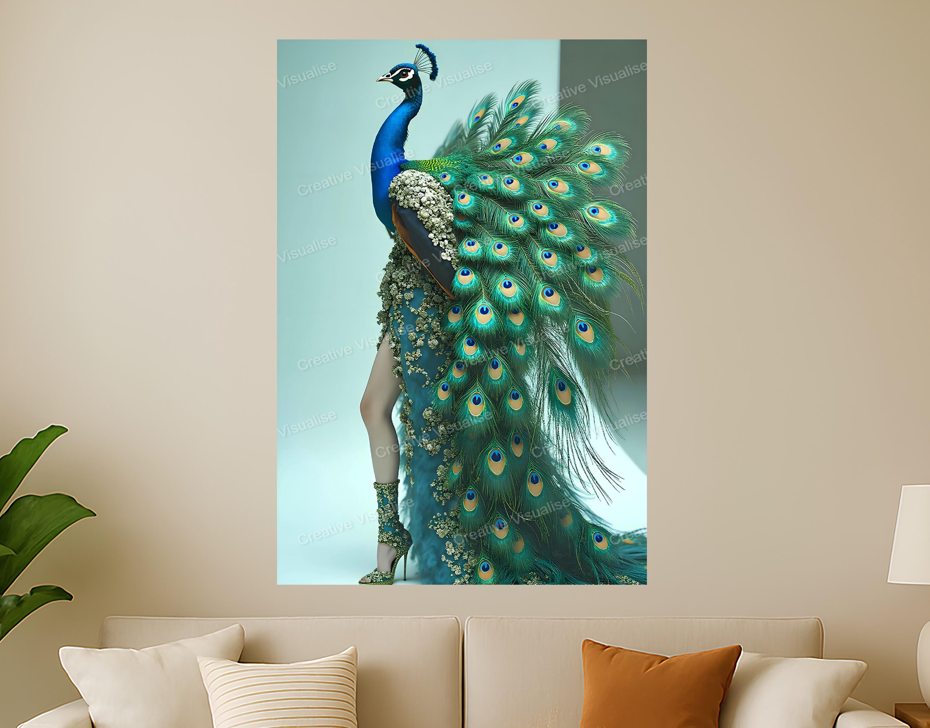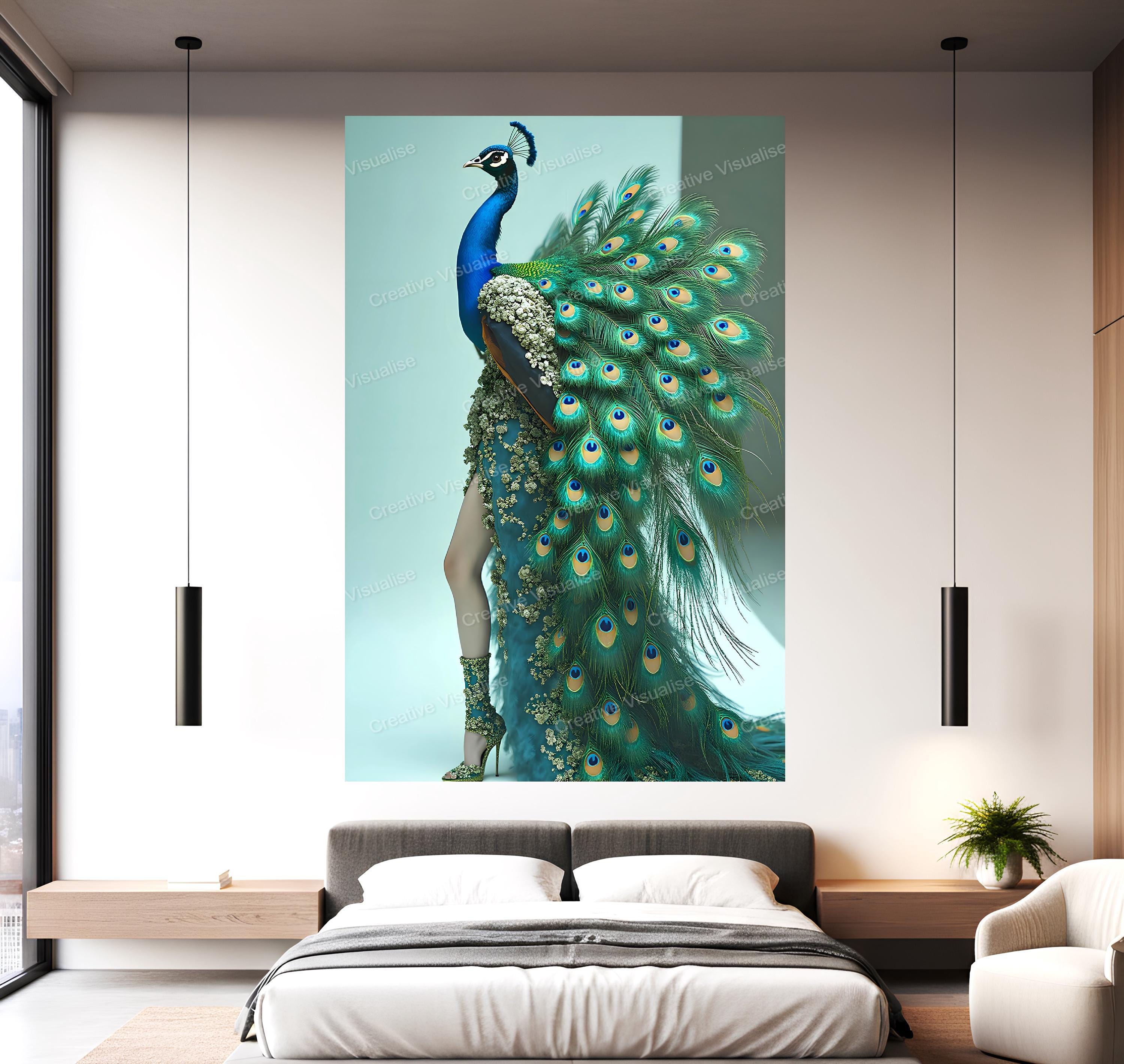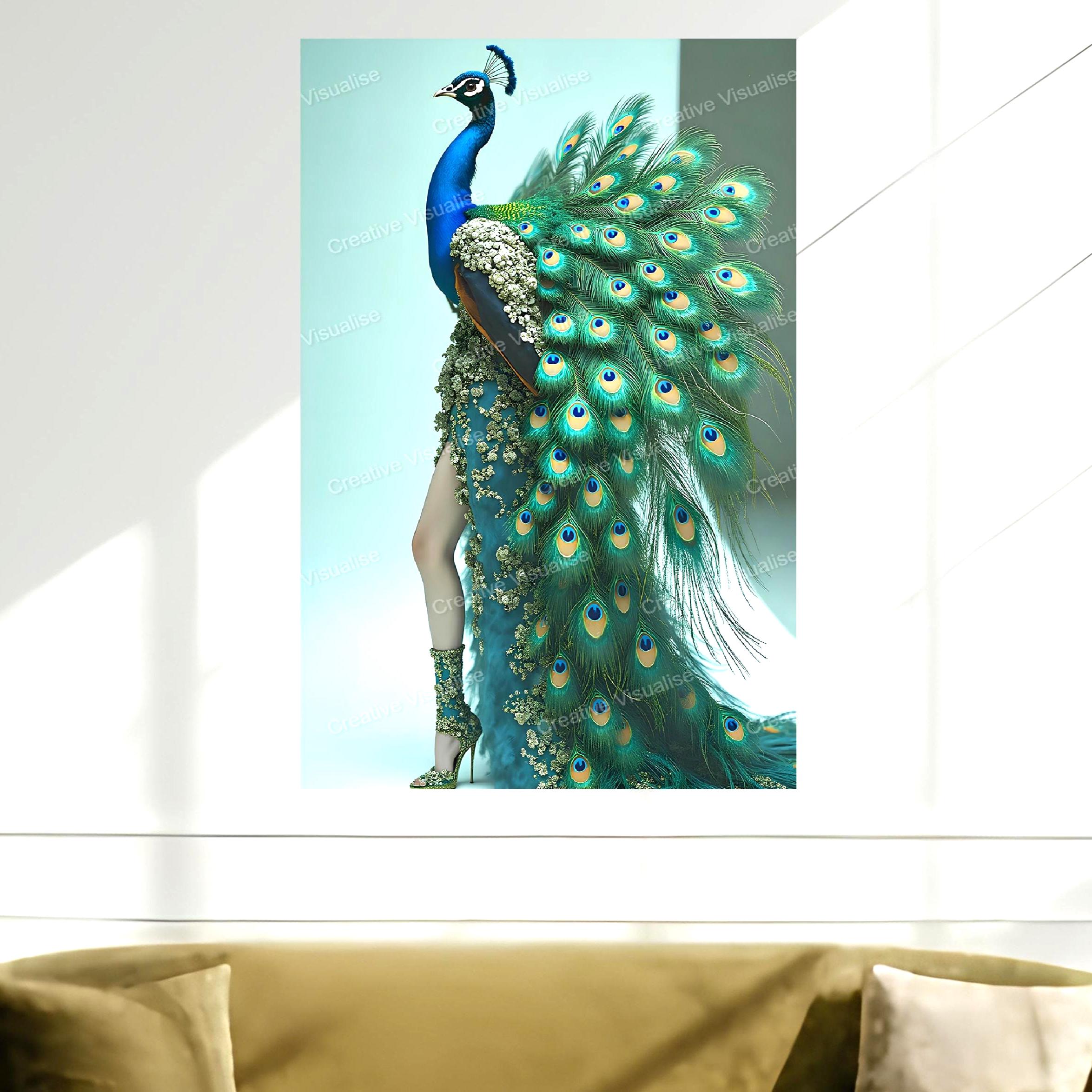 Digital photo of a peacock dress fashion model poster that can be easily downloaded and printed (not a physical item for delivery). The details of the digitally received image are about 11000 × 14000 pixels, 300 DPI, JPEG and PDF formats, AI artwork, very high resolution without a watermark, and large enough for professional posters, canvas prints, and wall decor. Please send me a message if you need another file format after the original files' delivery. This price is for personal use! For commercial use, please send me a message.