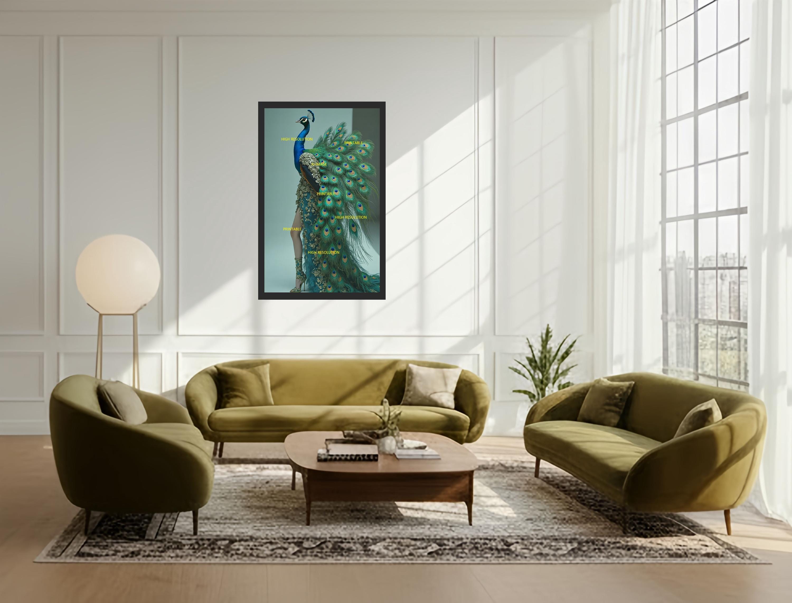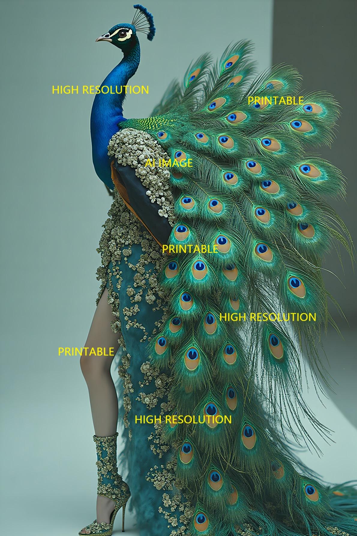 Digital photo of a peacock dress fashion model poster that can be easily downloaded and printed (not a physical item for delivery). The details of the digitally received image are about 5000 × 8000 pixels, 300 DPI, AI artwork, very high resolution without a watermark, and large enough for professional posters, canvas prints, and wall decor. This price is for personal use! For commercial use, please send me a message.