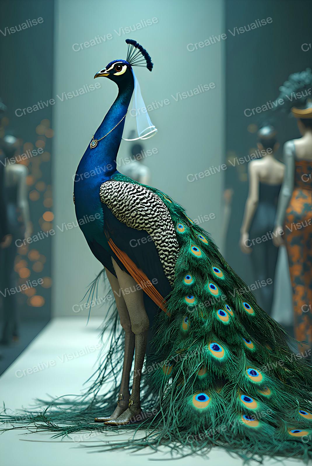 Digital photo of a peacock dress fashion model poster that can be easily downloaded and printed (not a physical item for delivery). The details of the digitally received image are about 11000 × 16000 pixels, 300 DPI, JPEG and PDF formats, AI artwork, very high resolution without a watermark, and large enough for professional posters, canvas prints, and wall decor. Please send me a message if you need another file format after the original files' delivery. This price is for personal use! For commercial use, please send me a message.