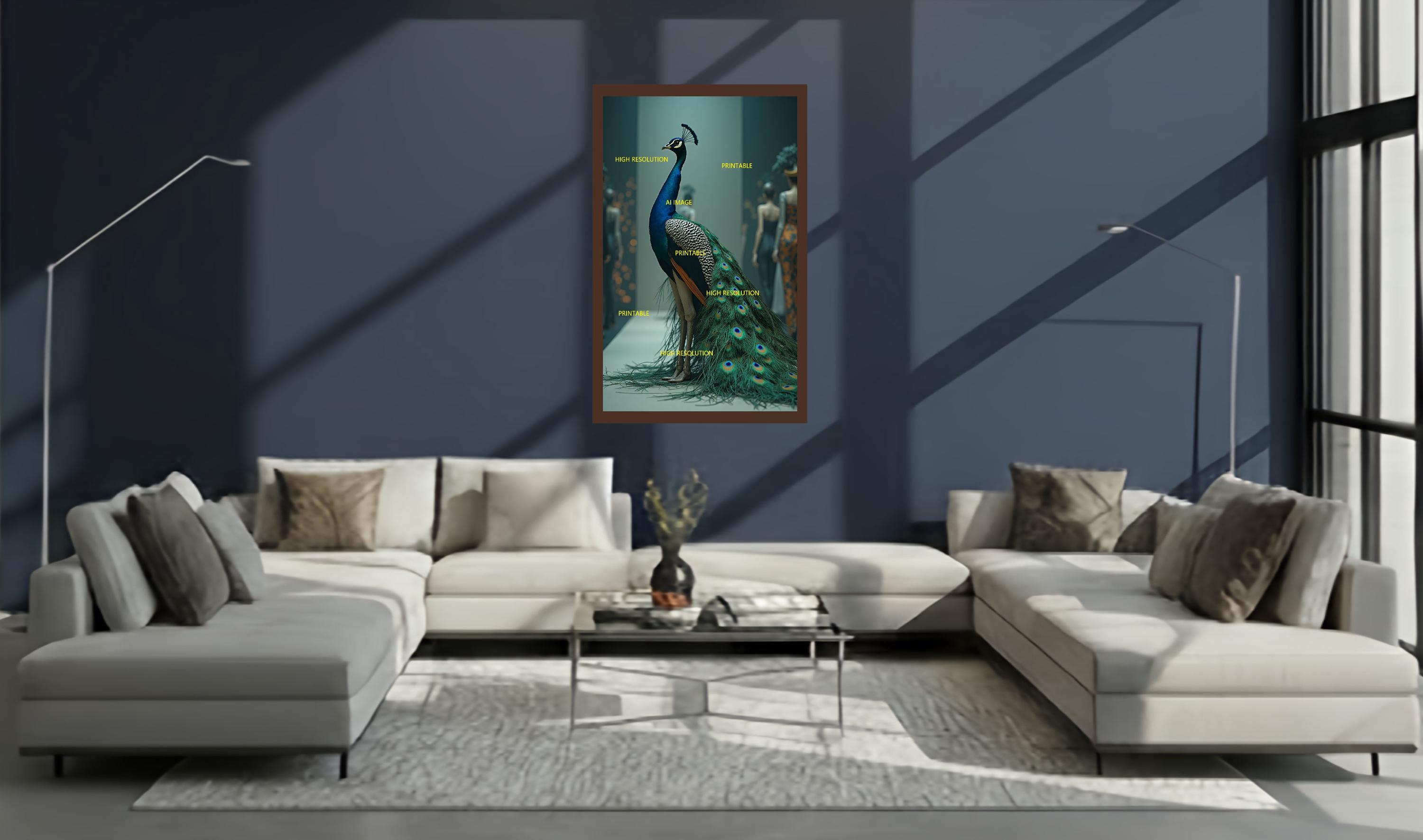 Digital photo of a peacock dress fashion model poster that can be easily downloaded and printed (not a physical item for delivery). The details of the digitally received image are about 5000 × 8000 pixels, 300 DPI, AI artwork, very high resolution without a watermark, and large enough for professional posters, canvas prints, and wall decor. This price is for personal use, not for commercial use!