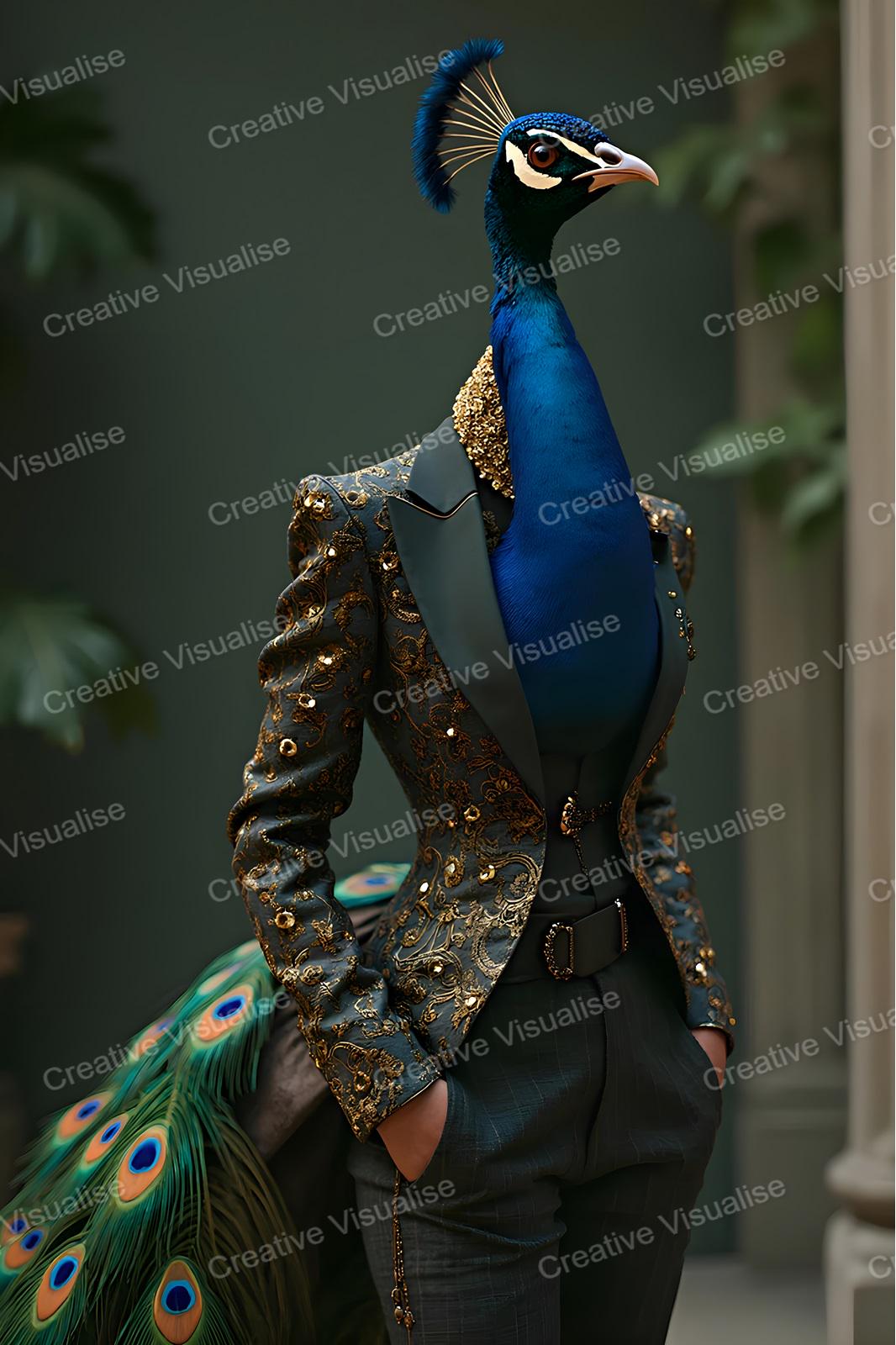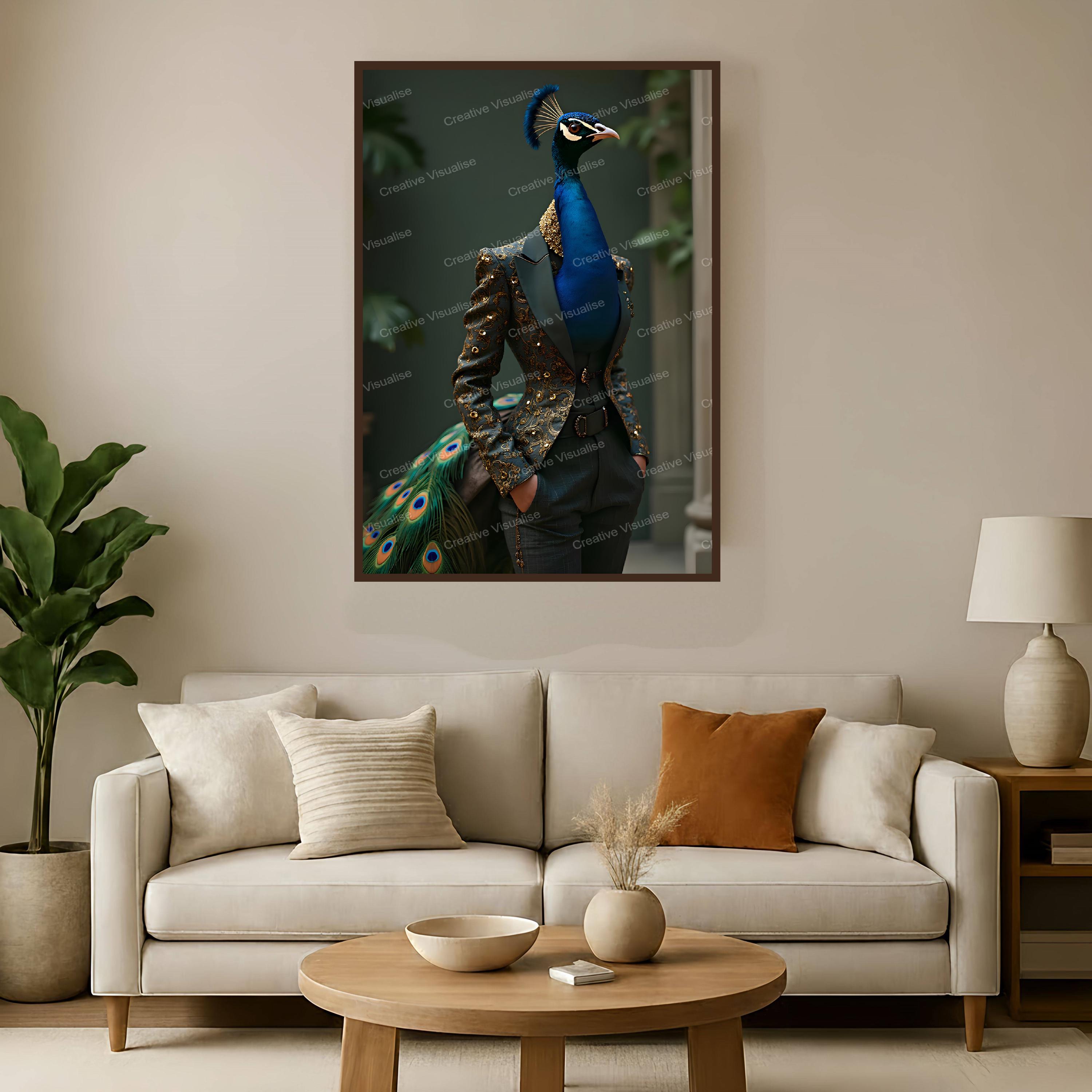 Digital photo of a peacock dress fashion model poster that can be easily downloaded and printed (not a physical item for delivery). The details of the digitally received image are about 11000 × 16000 pixels, 300 DPI, JPEG and PDF formats, AI artwork, very high resolution without a watermark, and large enough for professional posters, canvas prints, and wall decor. Please send me a message if you need another file format after the original files' delivery. This price is for personal use! For commercial use, please send me a message.