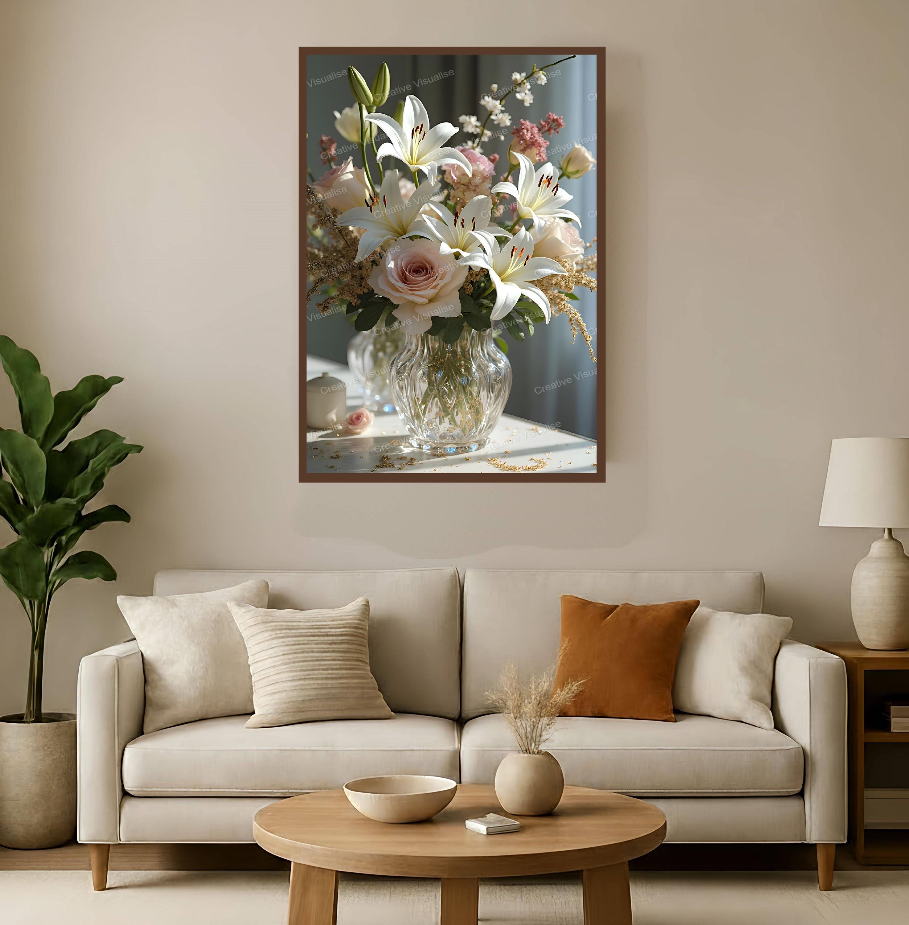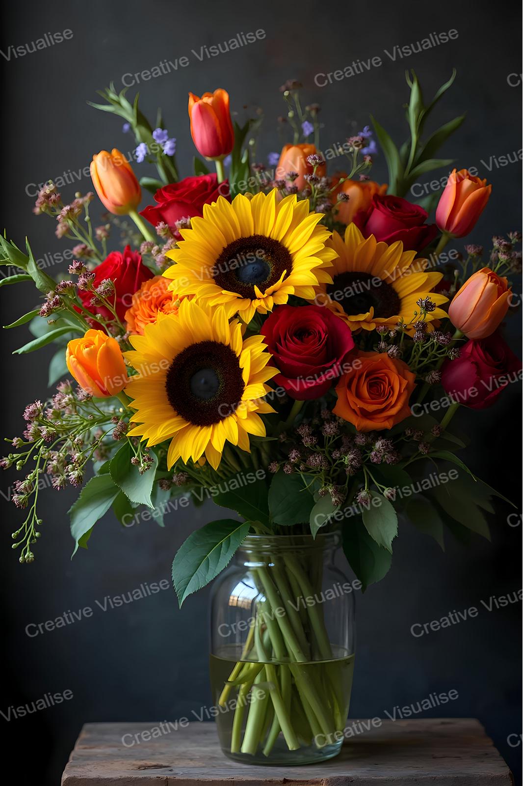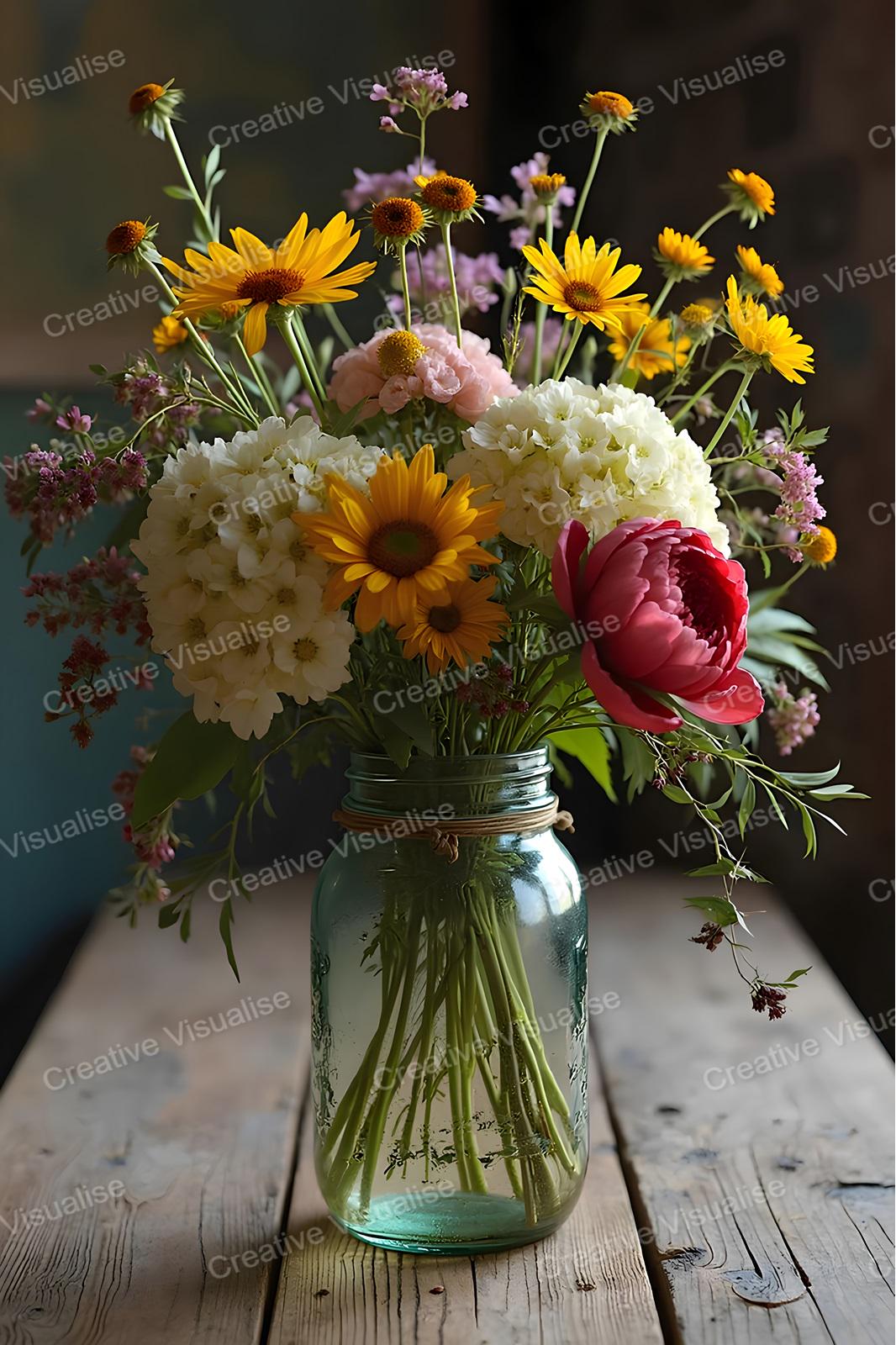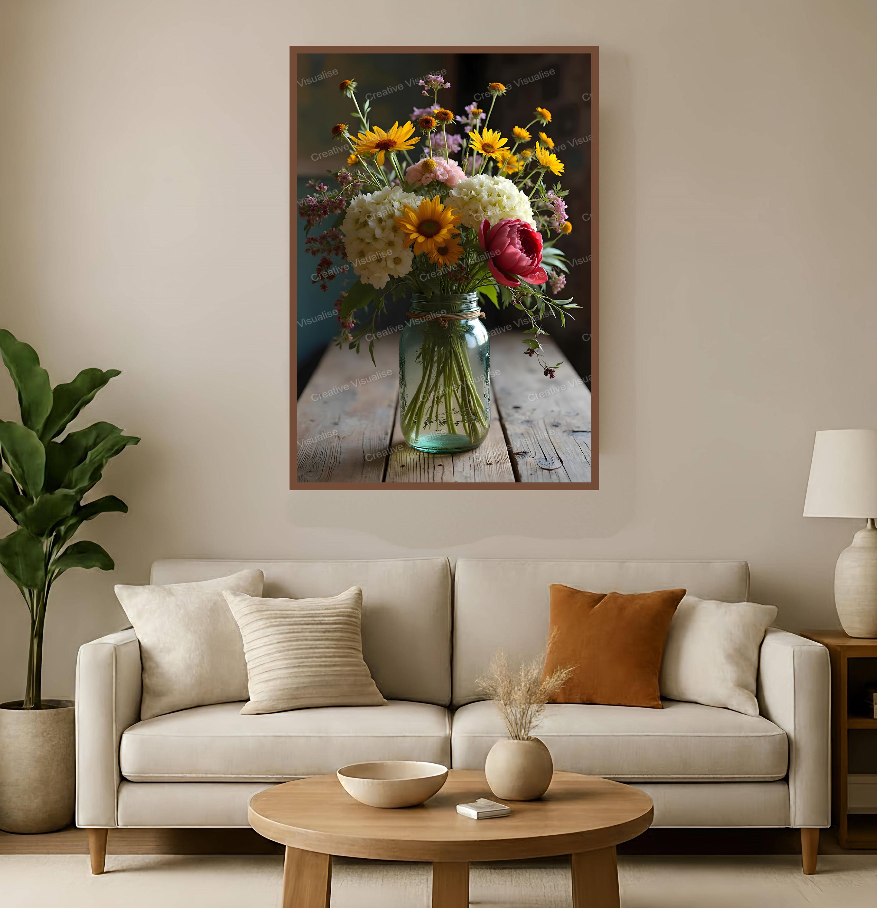 Set of 5 digital photos of a bouquet of flowers in a glass jar that can be easily downloaded and printed (not a physical item for delivery). The details of the digitally received image are about 11000 × 16000 pixels, 300 DPI, JPEG and PDF formats, AI artwork, very high resolution without a watermark, and large enough for professional posters, canvas prints, and wall decor. Please send me a message if you need another file format after the original files' delivery. This price is for personal use! For commercial use, please send me a message.