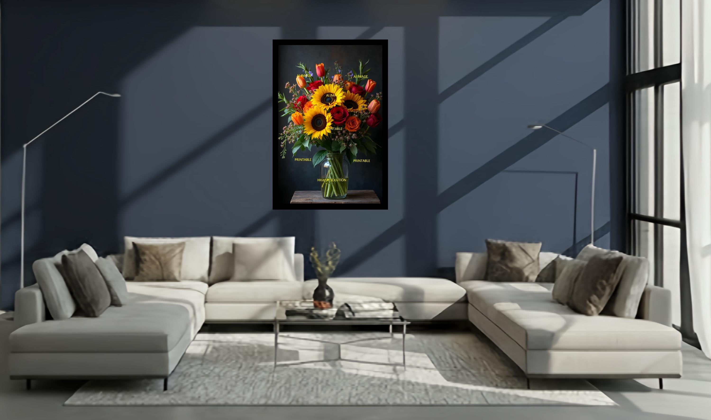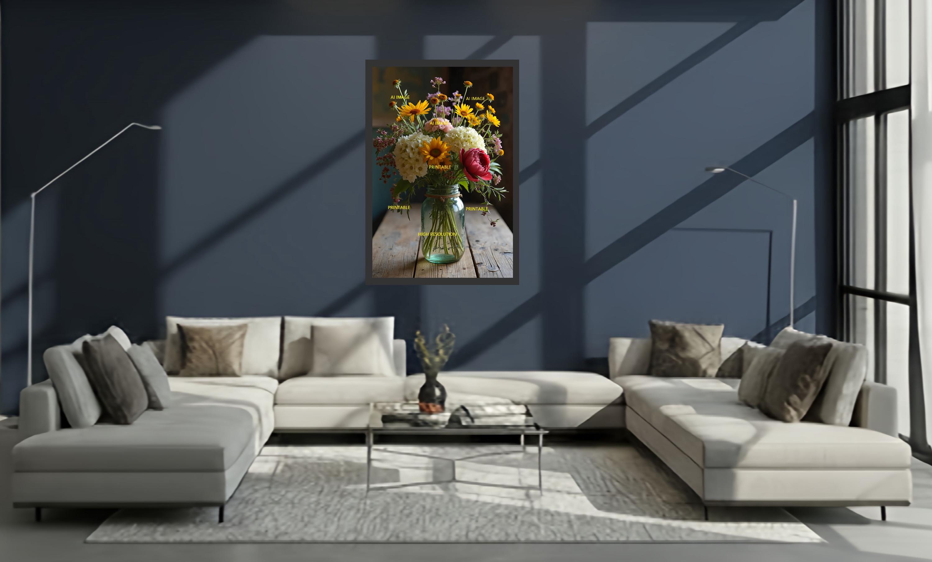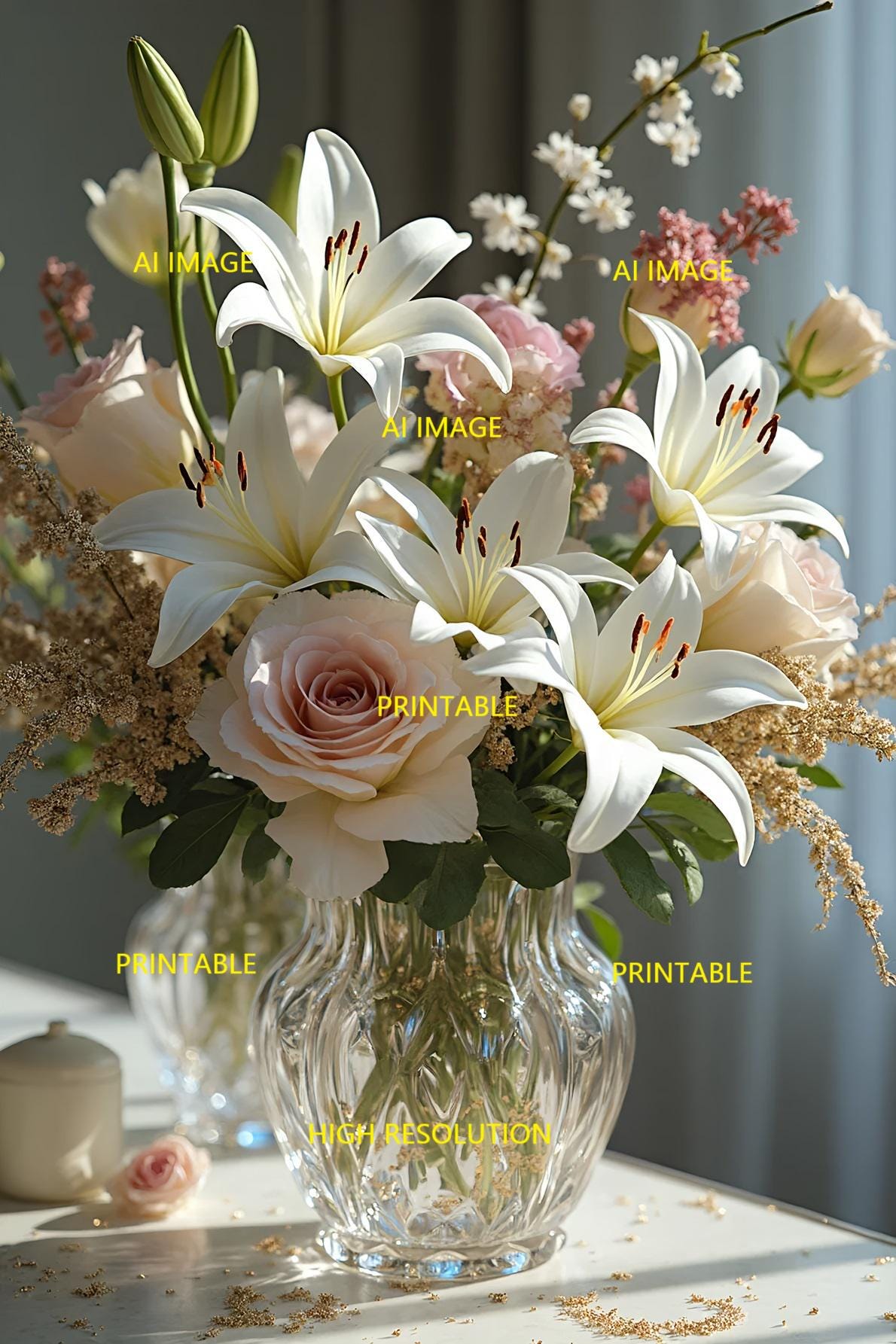 5 digital photos of a bouquet of flowers in a glass jar that can be easily downloaded and printed (not a physical item for delivery). The details of the digitally received images are about 5000 × 8000 pixels, 300 DPI, AI artwork, very high resolution without a watermark, and large enough for professional posters, canvas prints, and wall decor. This price is for personal use, not for commercial use!
