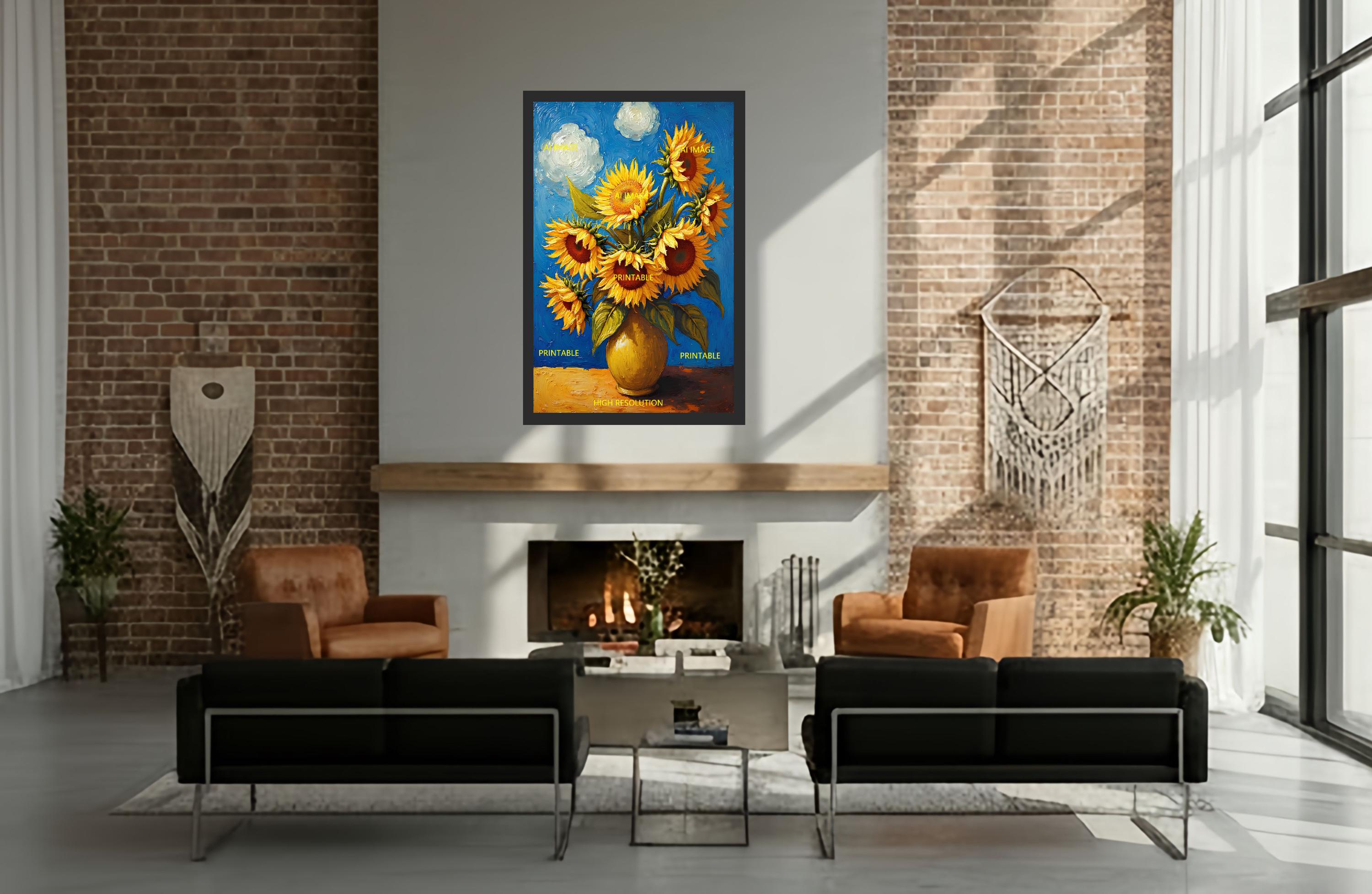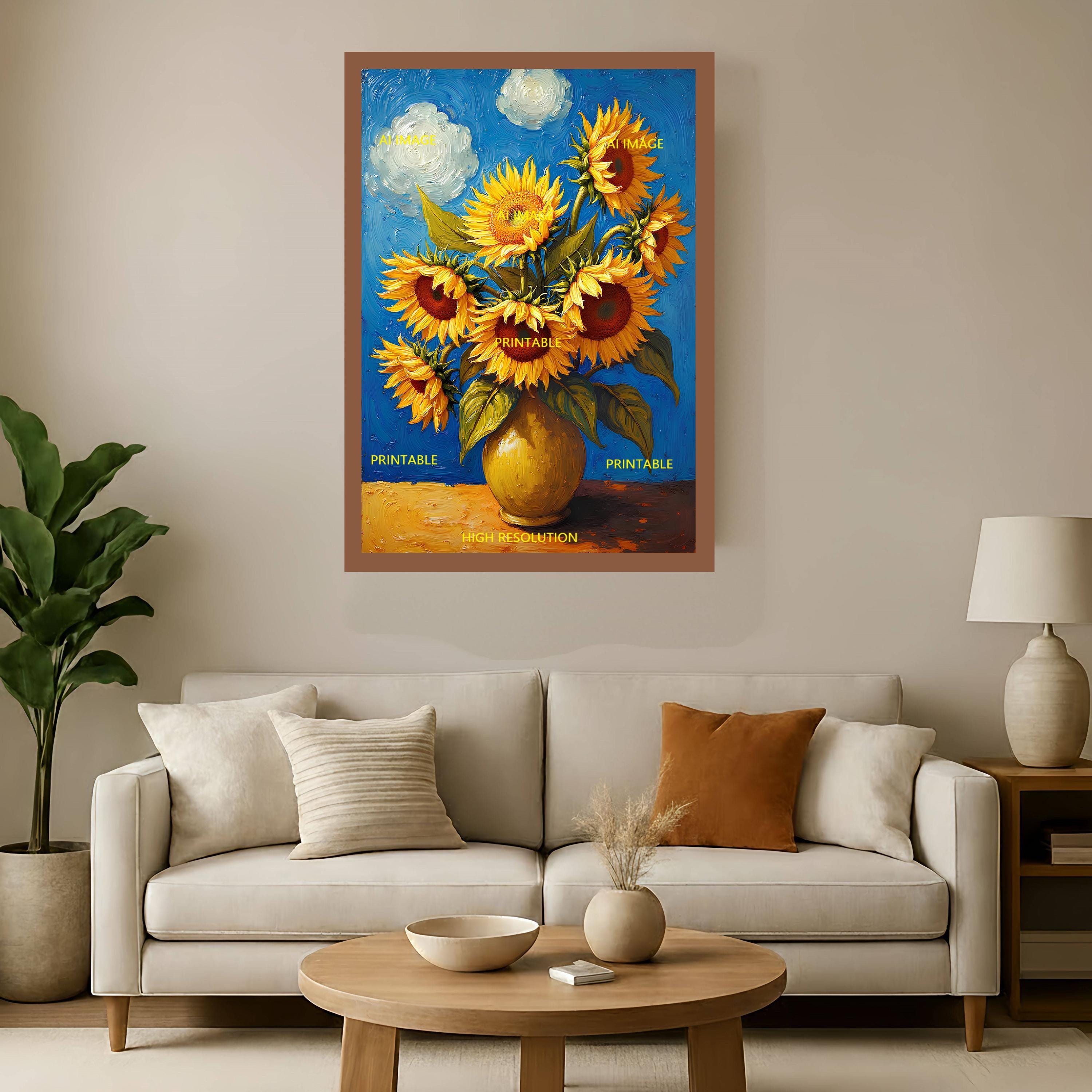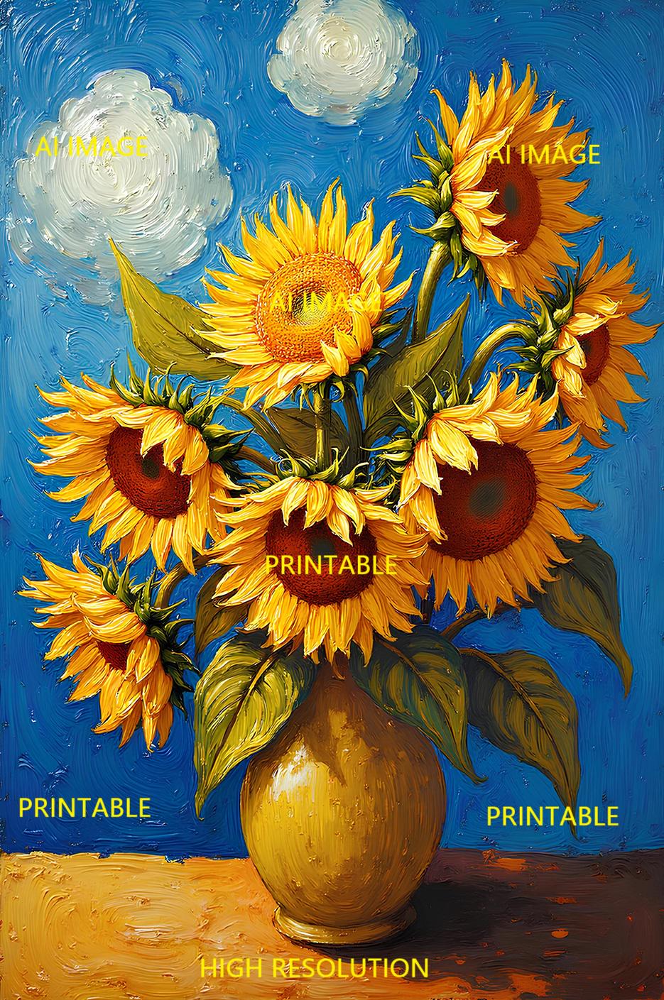 Digital photo of a bouquet of sunflowers that can be easily downloaded and printed (not a physical item for delivery). The details of the digitally received image are about 5000 × 8000 pixels, 300 DPI, AI artwork, very high resolution without a watermark, and large enough for professional posters, canvas prints, and wall decor. This price is for personal use, not for commercial use!