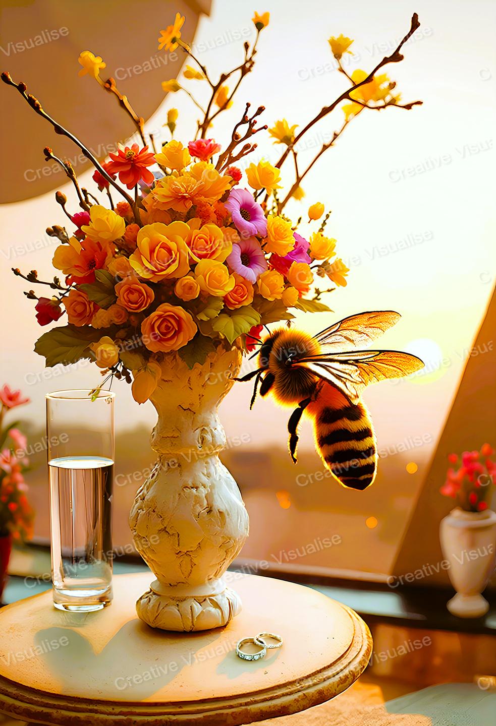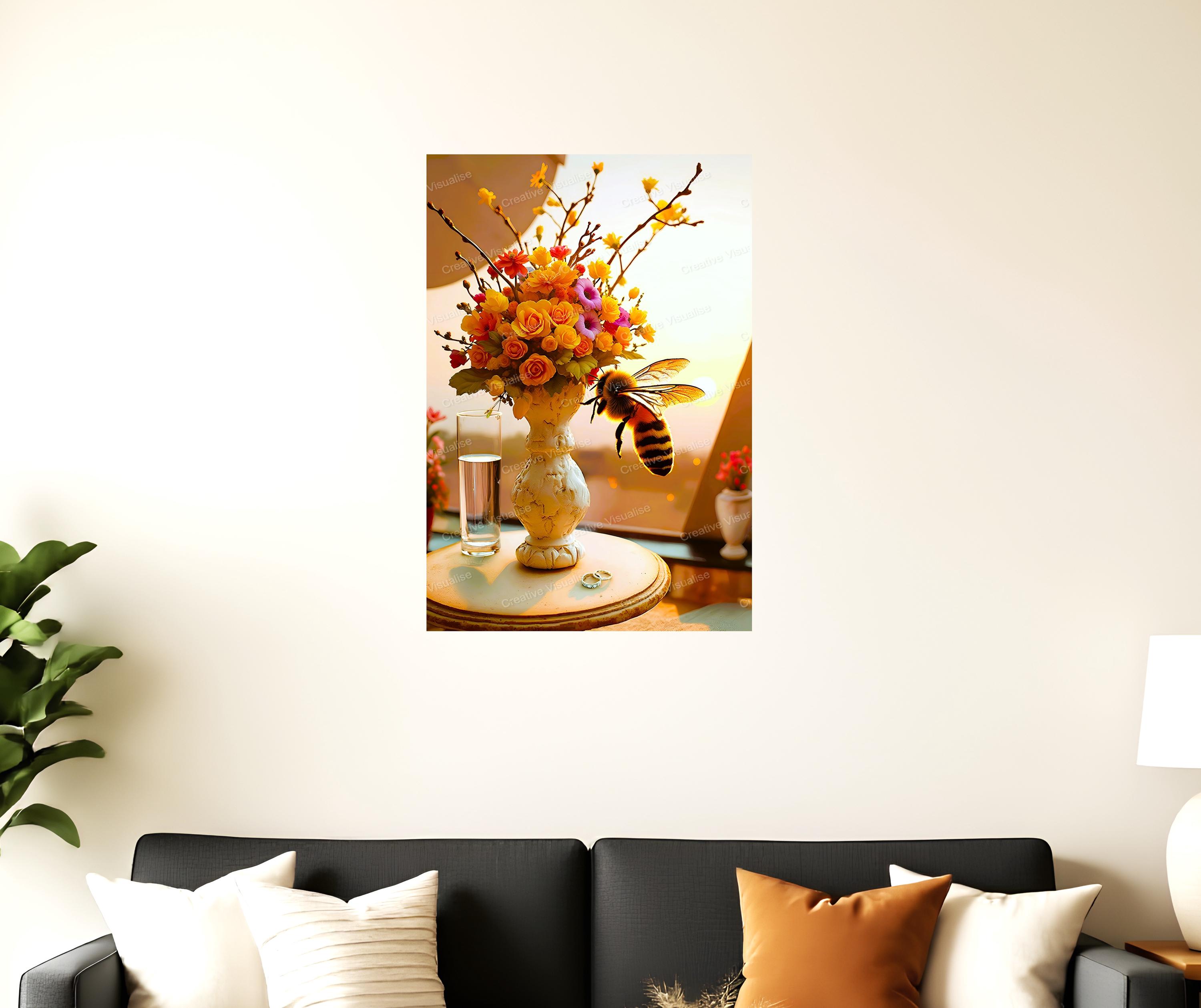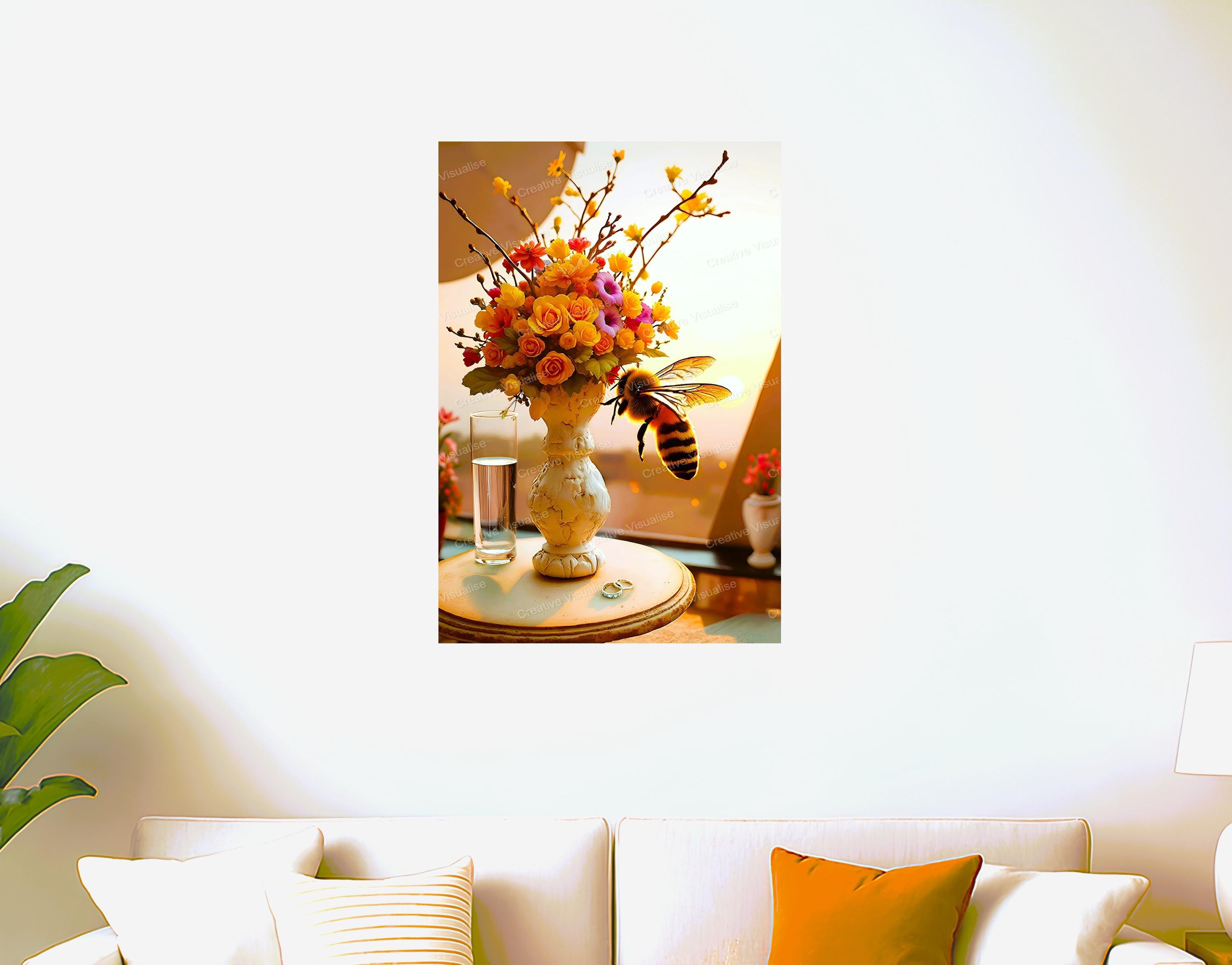 A digital photo of a bouquet of flowers and a bee with pots that can be easily downloaded and printed. It is large enough for professional posters, canvas prints, and wall decor. The sizes of received digital files: 1. PNG file, 5300×8000 pixels 2. PDF 4:5, 16×20 (8×10 and 4×6) inches 3. PDF 3:4, 18×24 (12×16 and 6×8) inches 4. PDF A2 (16.5×23.4 inches) 5. PDF 2:3, 16×24 (12×18 and 8×12) inches All files are high-resolution 300 DPI professional quality, ensuring crisp and clear prints at every size. For commercial use, please send me a message.