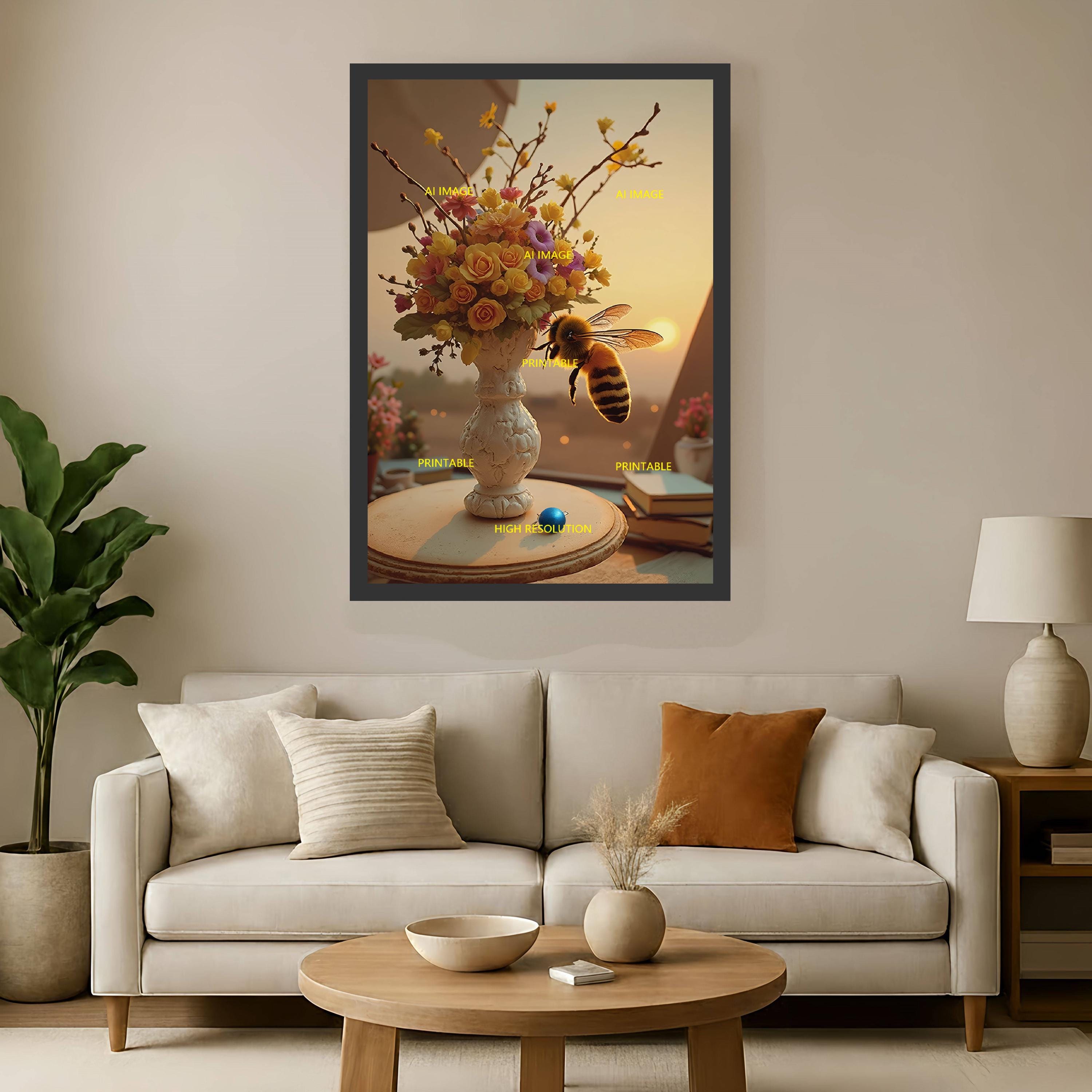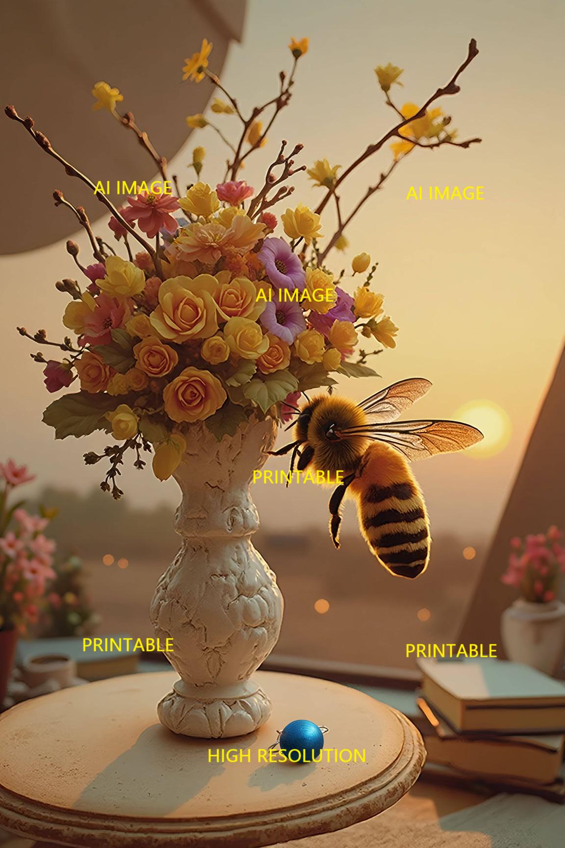 A digital photo of a bouquet of flowers and a bee with pots that can be easily downloaded and printed (not a physical item for delivery). The details of the digitally received images are about 5000 × 8000 pixels, 300 DPI, AI artwork, very high resolution without a watermark, and large enough for professional posters, canvas prints, and wall decor. This price is for personal use, not for commercial use!