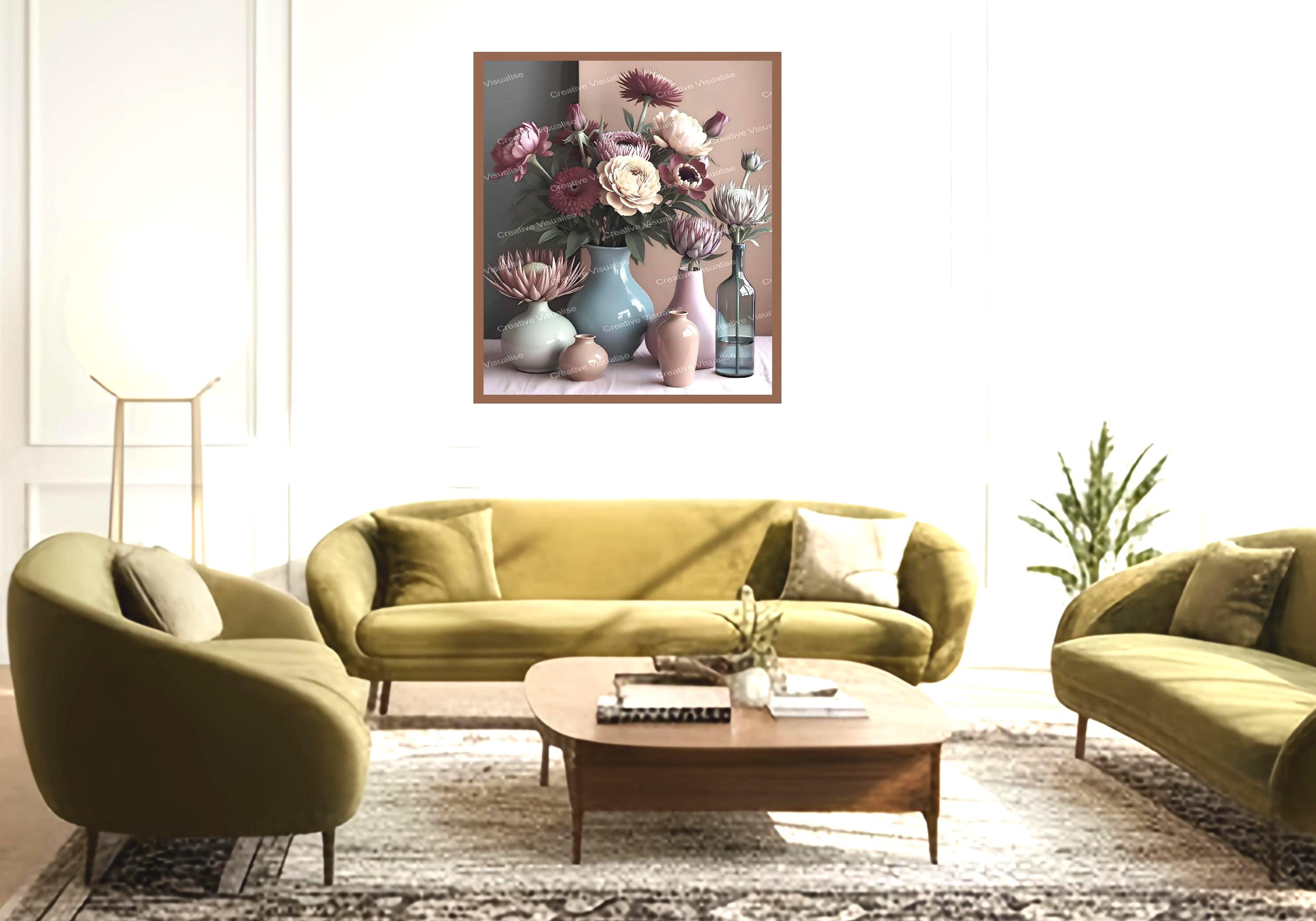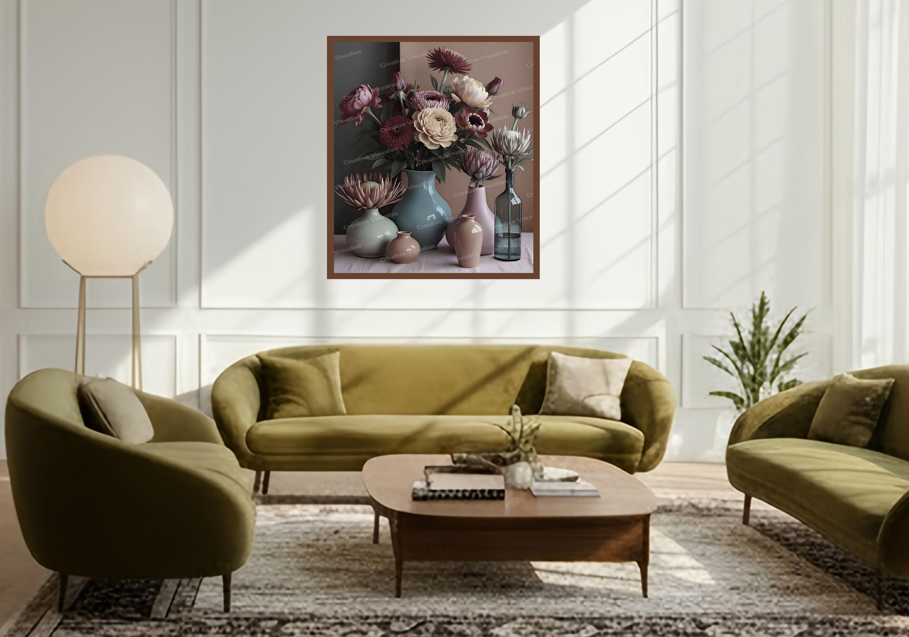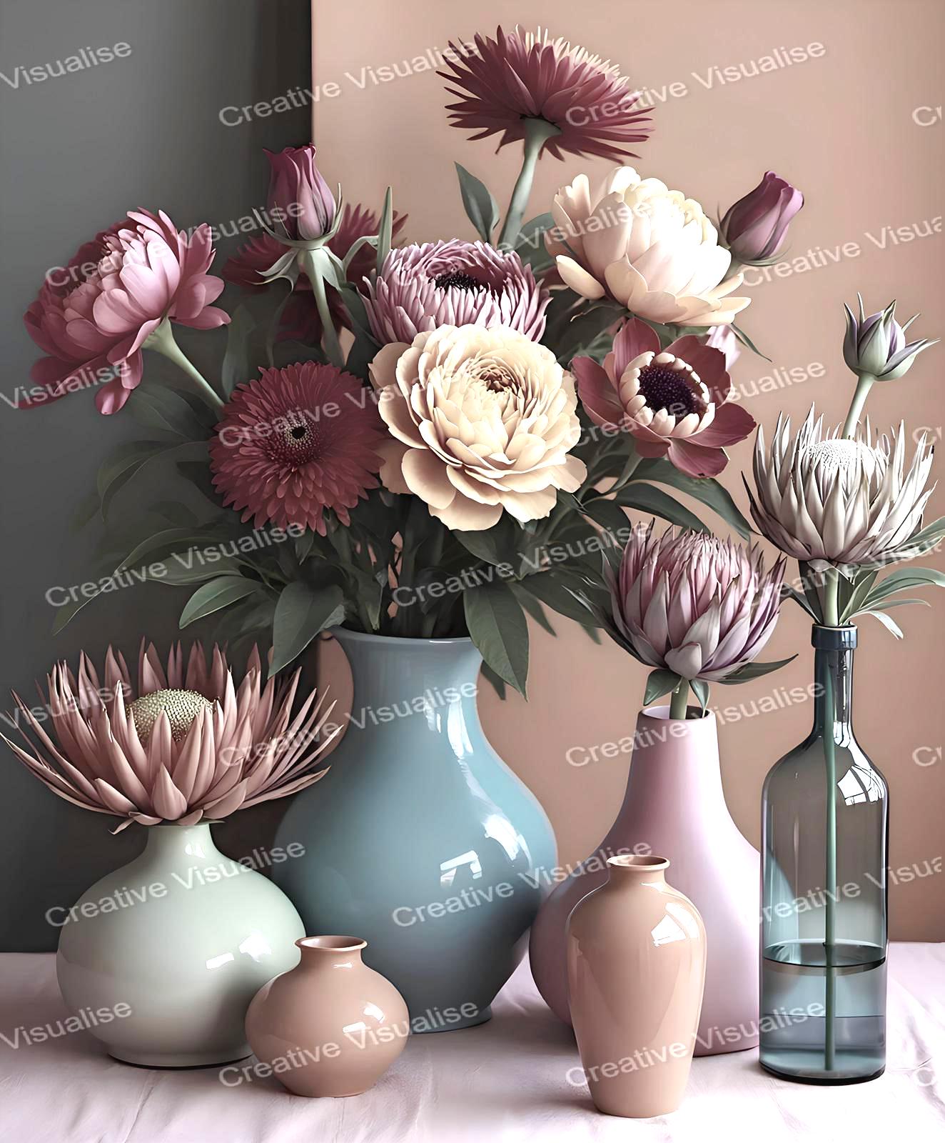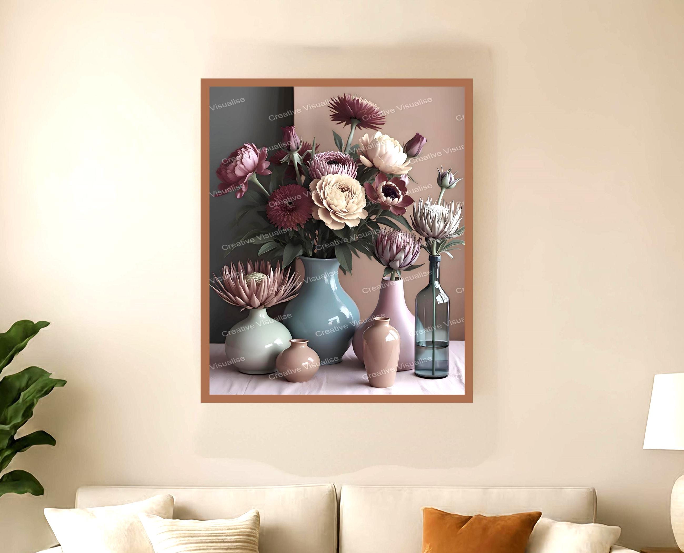 A digital photo of a bouquet of flowers with pots that can be easily downloaded and printed (not a physical item for delivery). The details of the digitally received image are about 11000 × 16000 pixels, 300 DPI, JPEG and PDF formats, AI artwork, very high resolution without a watermark, and large enough for professional posters, canvas prints, and wall decor. Please send me a message if you need another file format after the original files' delivery. This price is for personal use! For commercial use, please send me a message.